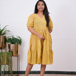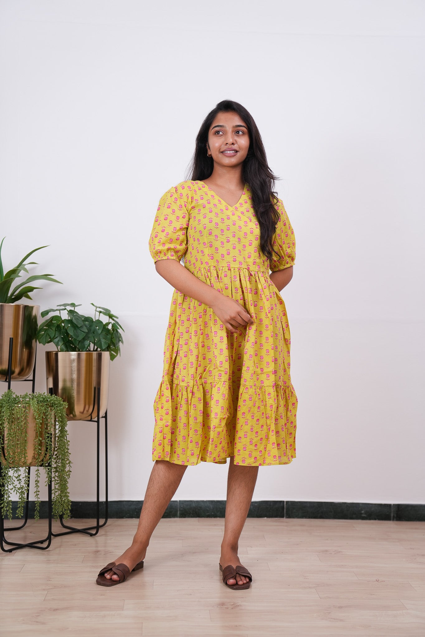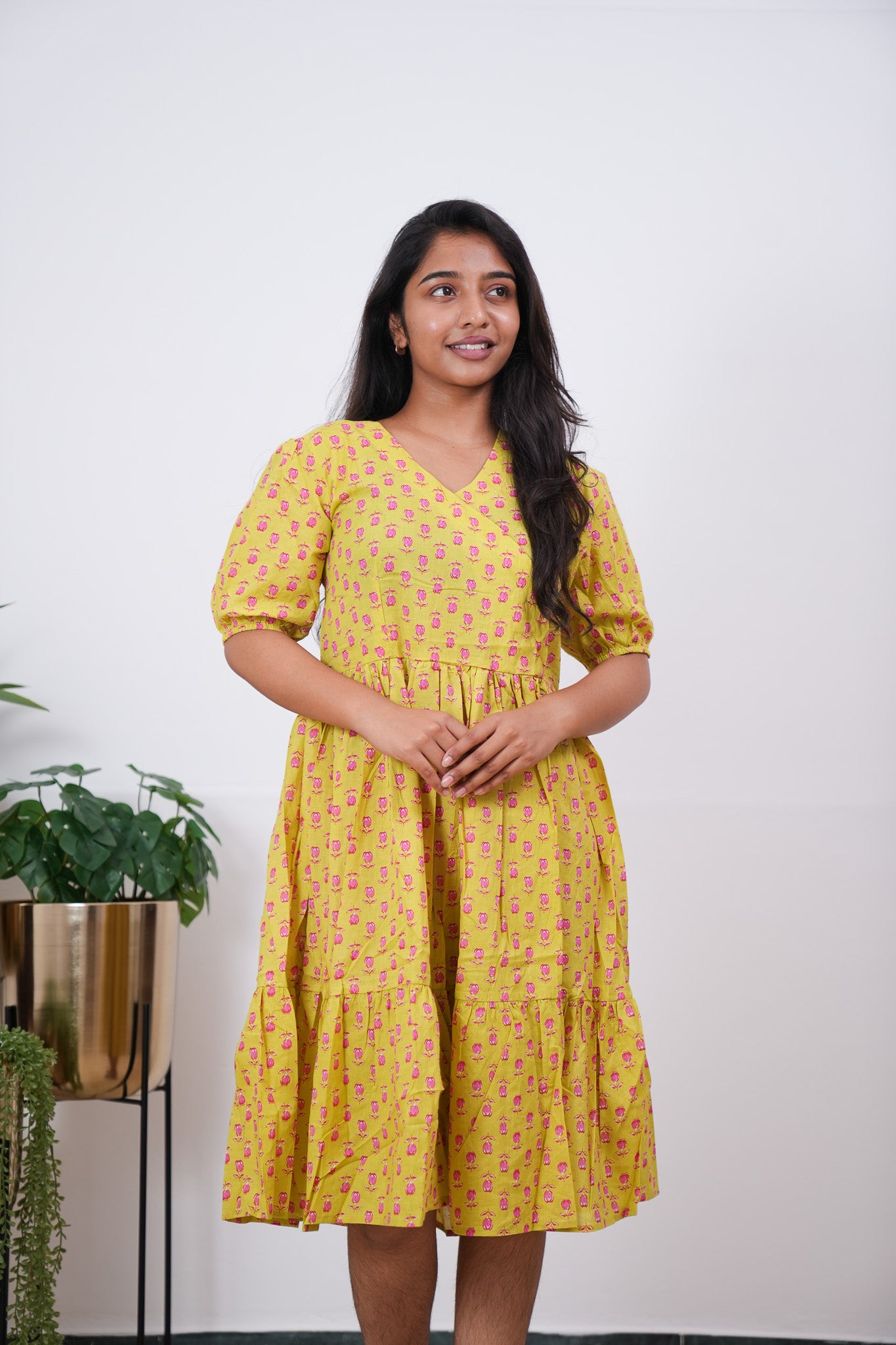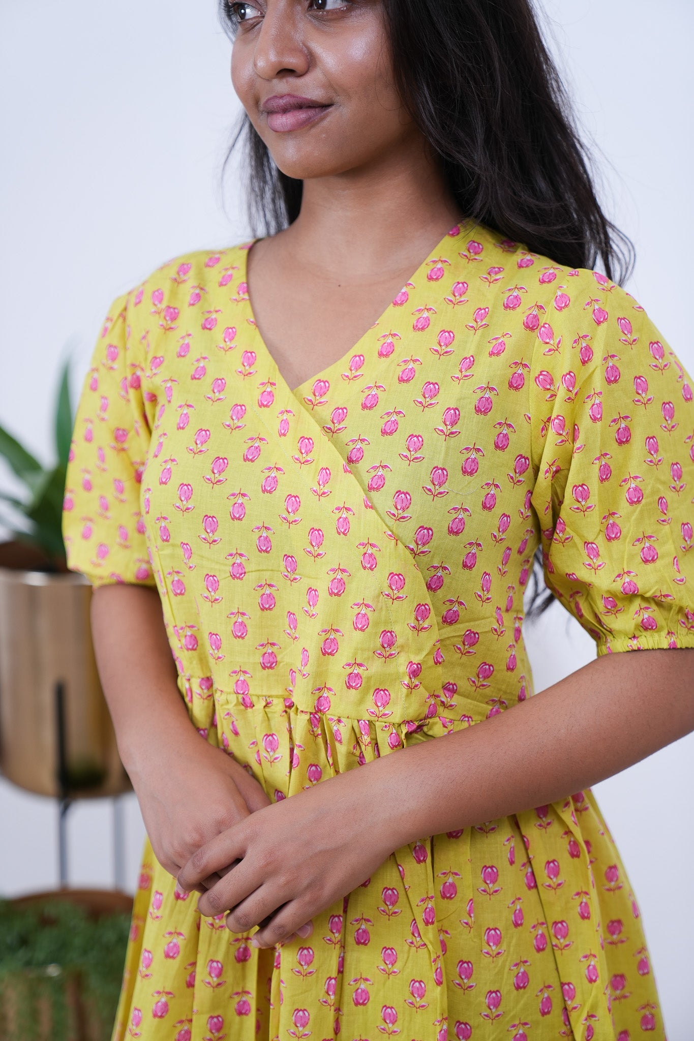 Lime yellow and pink V neck cotton dress with half sleeves. The fabric and prints are top notch.. which are perfect for brunch, shopping or just a cozy day at home!! You can wear just as a dress or add jeans to add some modesty whichever you find it suitable and comfortable..