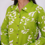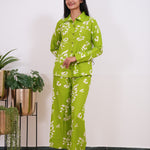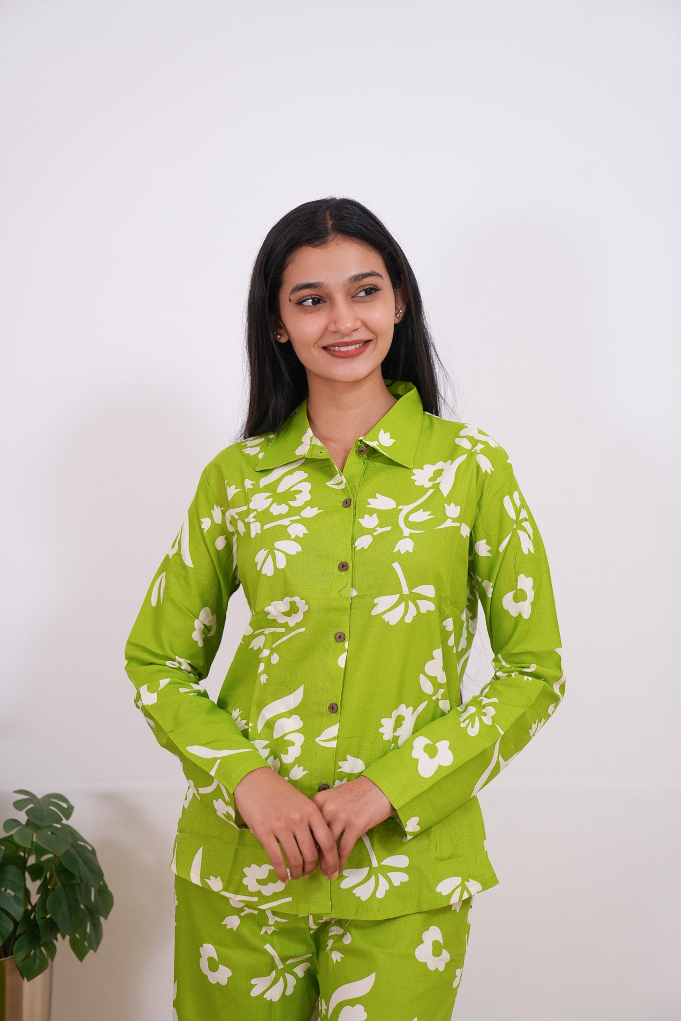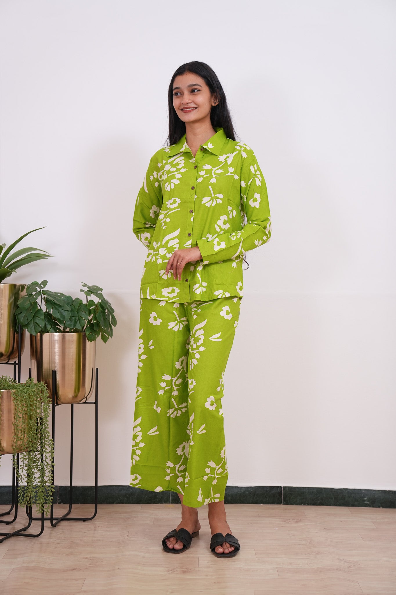 The night suit has a standard collar with openable buttons running down. It comes with matching elastic waisted pants