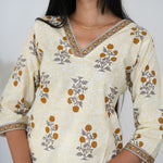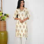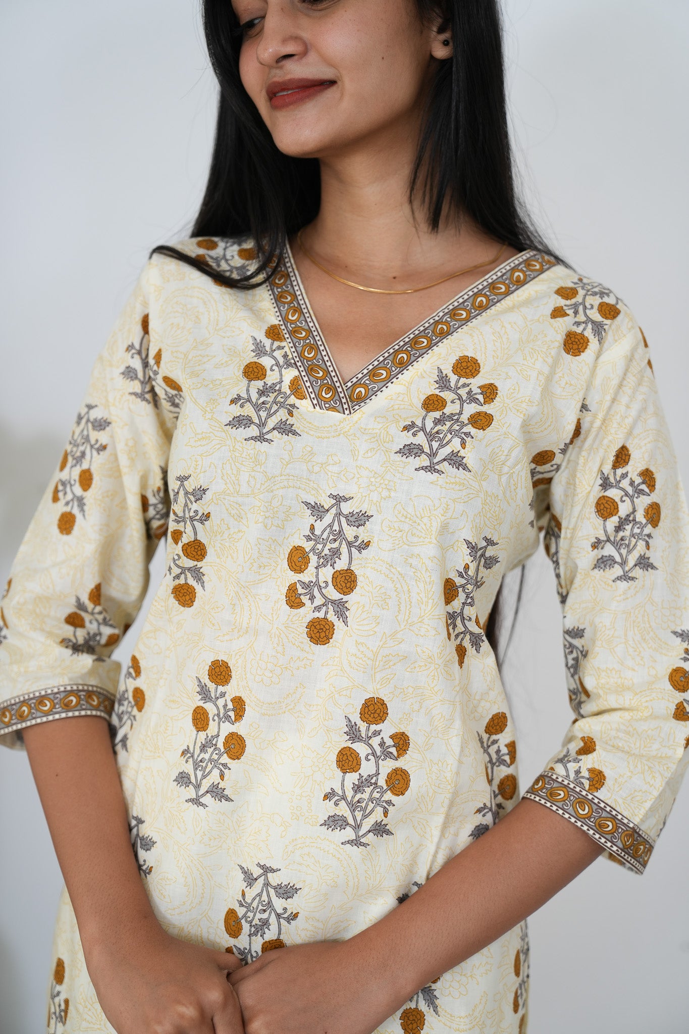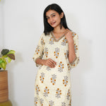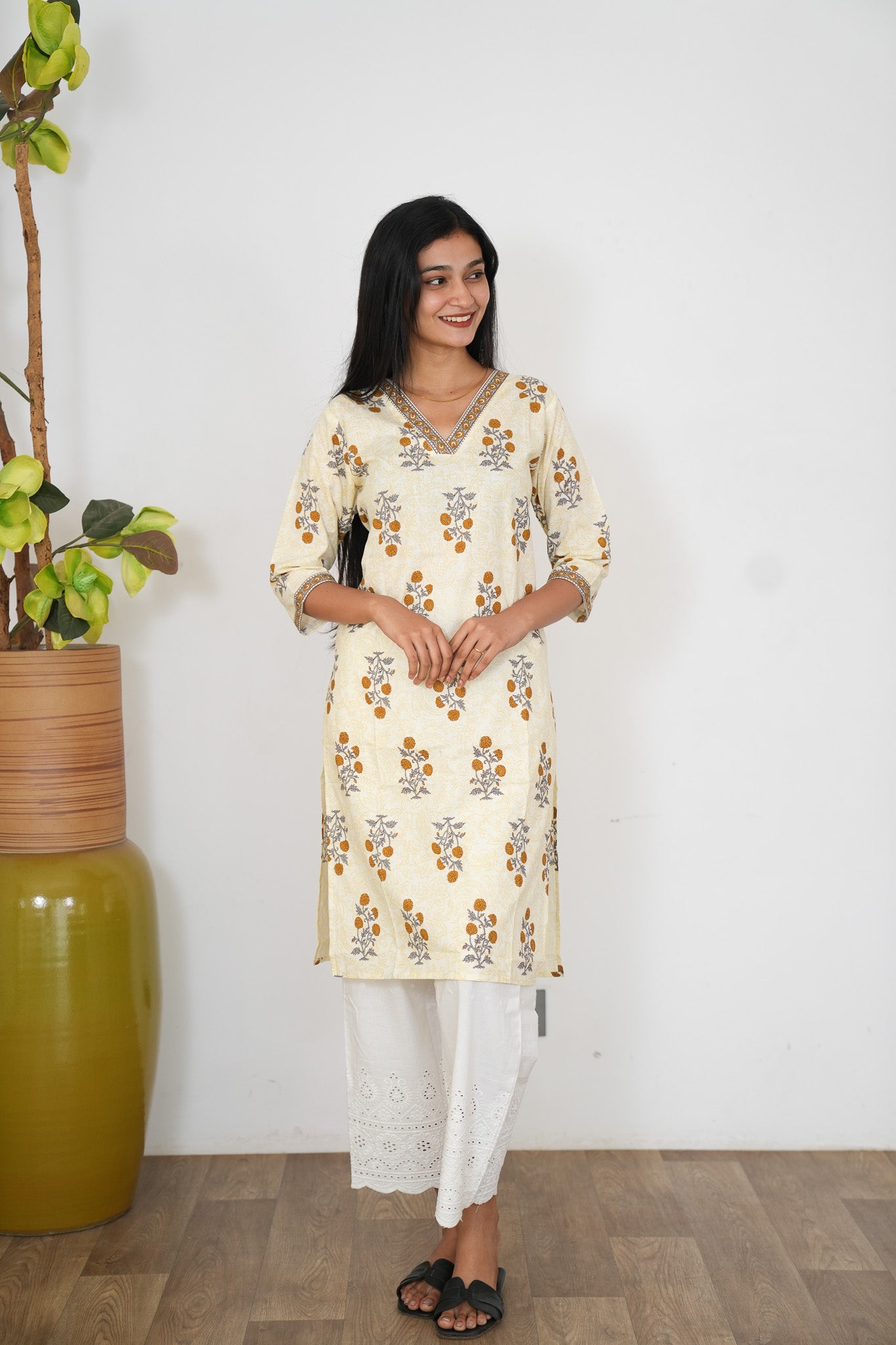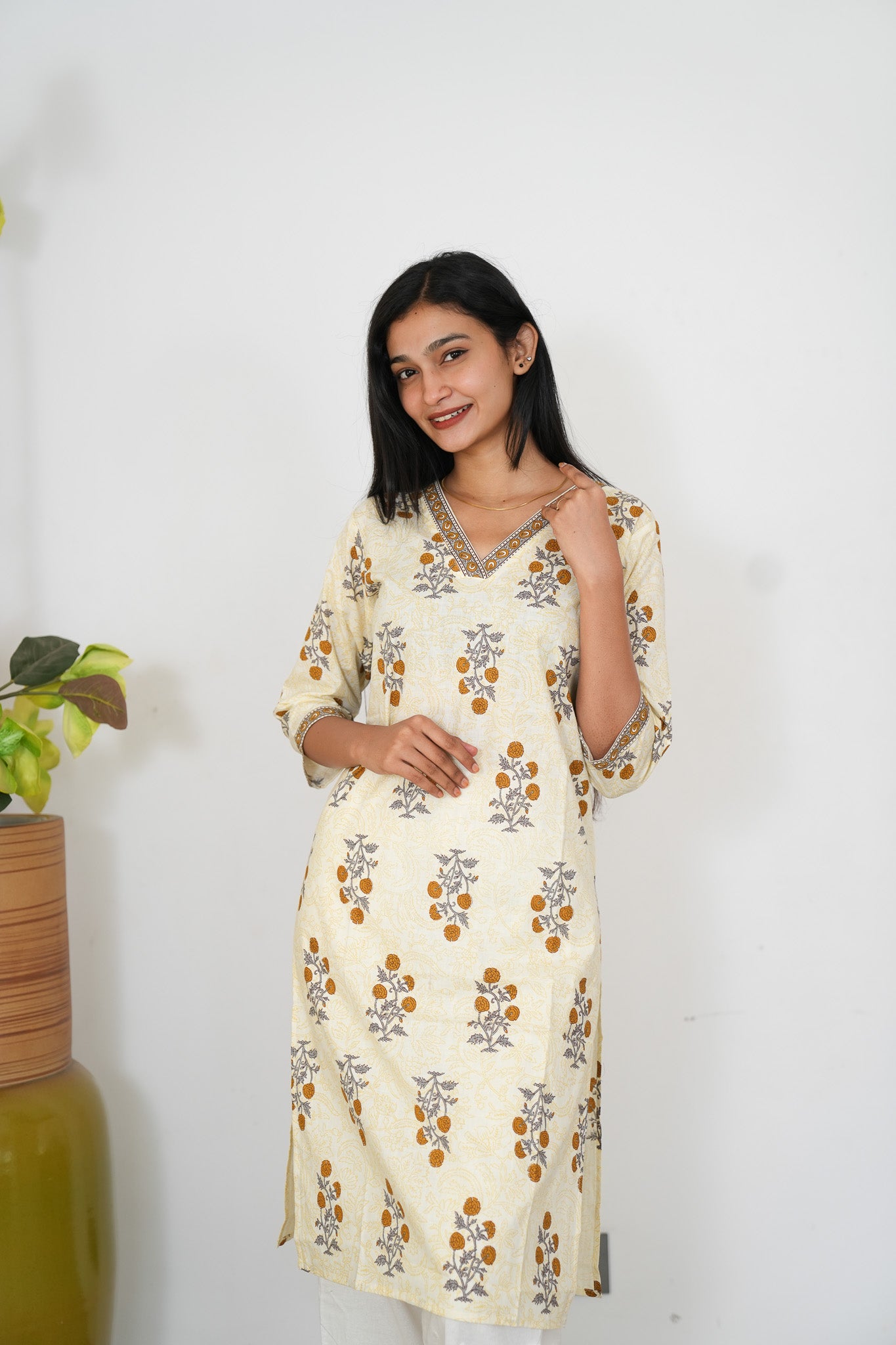 The kurti comes with a floral print all over the kurti with vibrant colour mixtures. It comes with V neck with elbow length sleeves. It can be paired with cotton pants or jeans to pull of that comfortable look!!