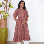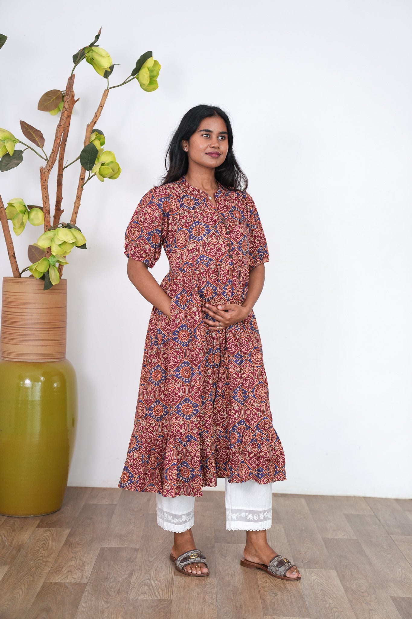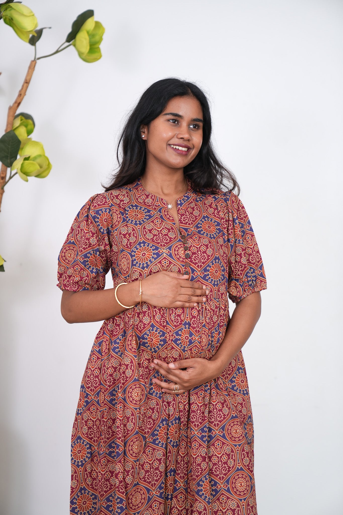 Maroon and indigo maternity nursing midi dress with mandarin neck and balloon sleeves. that accomodates the bump throughout nine months and has invisible zip on both sides to carefully feed baby. It is light weight and soft to help you get through pregnancy and breastfeeding journey with ease.