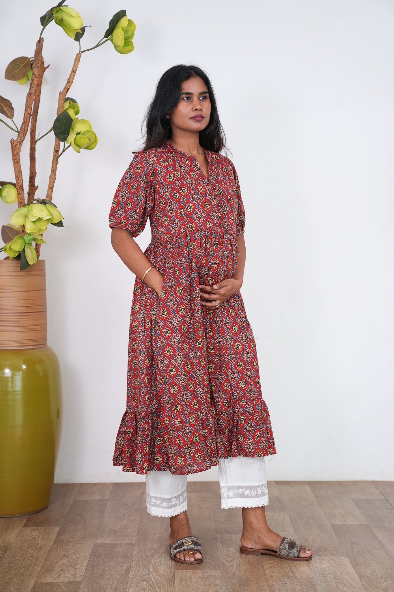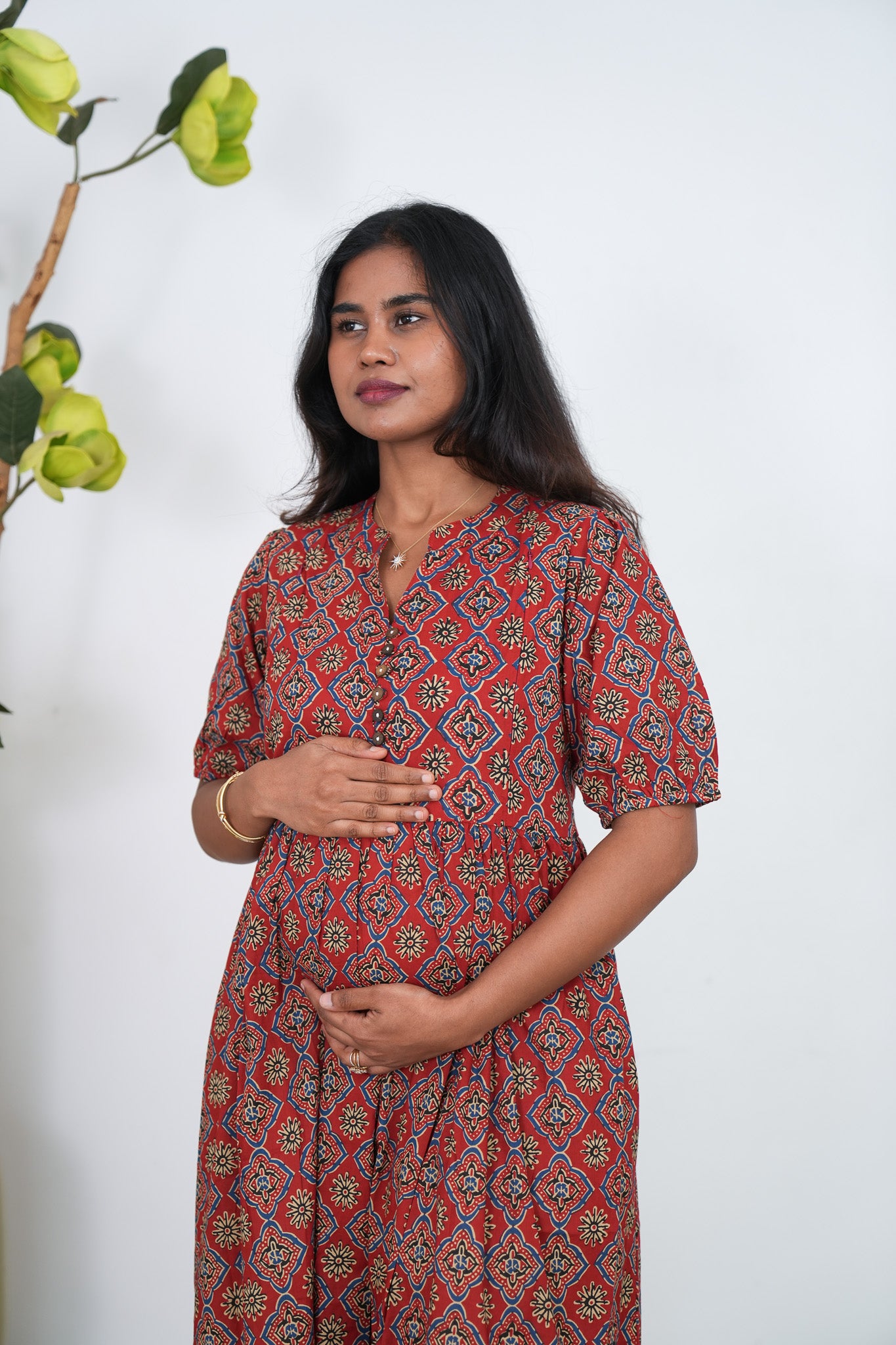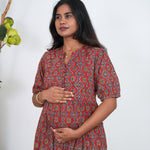 Maroon cotton maternity nursing midi dress with mandarin neck and balloon sleeves. that accomodates the bump throughout nine months and has invisible zip on both sides to carefully feed baby. It is light weight and soft to help you get through pregnancy and breastfeeding journey with ease.