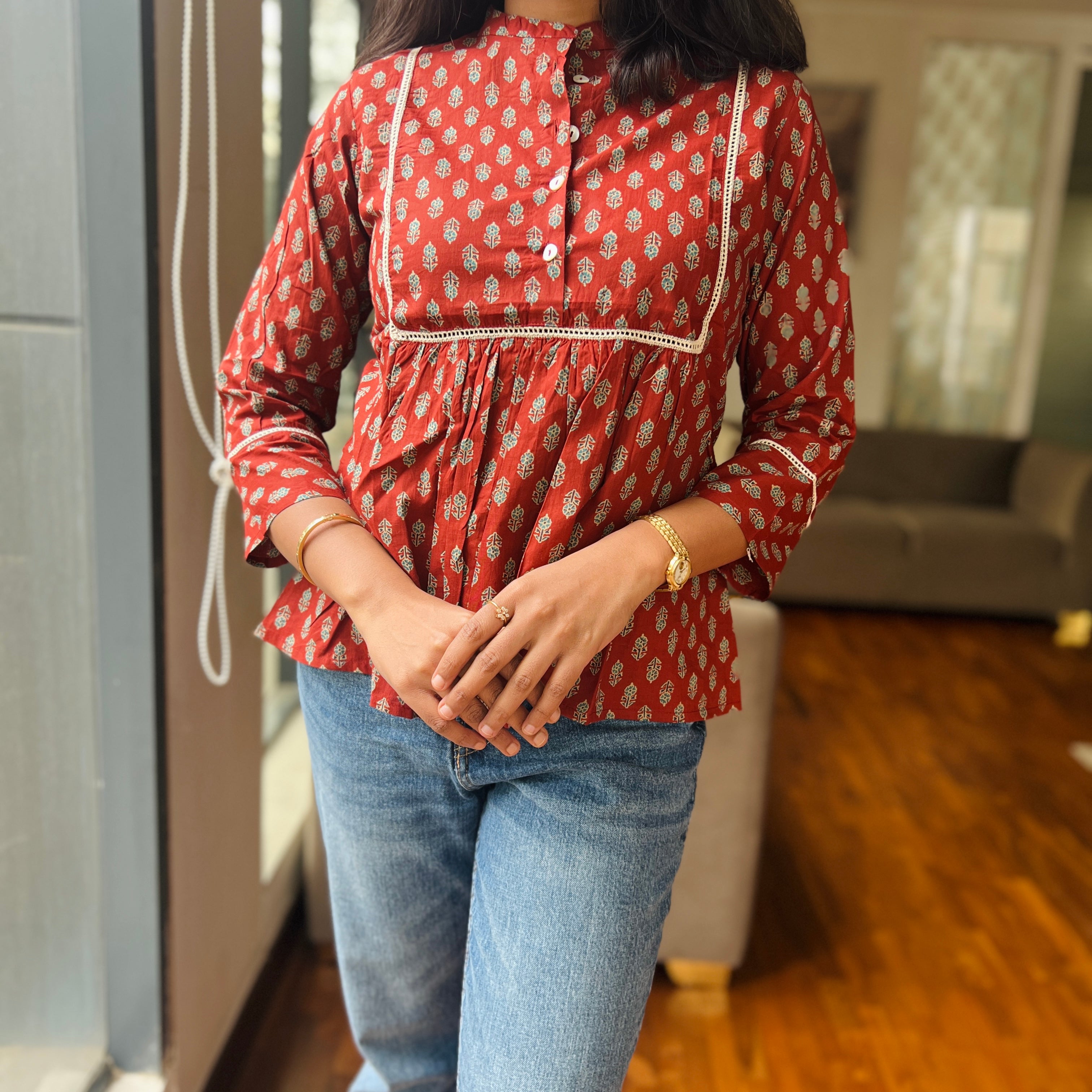 Maroon cotton top with hand block prints with mandarin collar and elbow length sleeves. There is a flare from the waist region to accentuate the style. These tops are definitely to be part of your essential wardrobe.