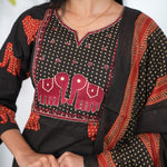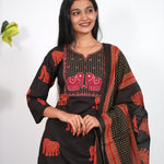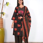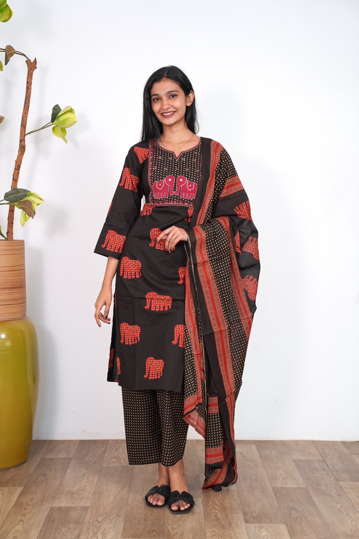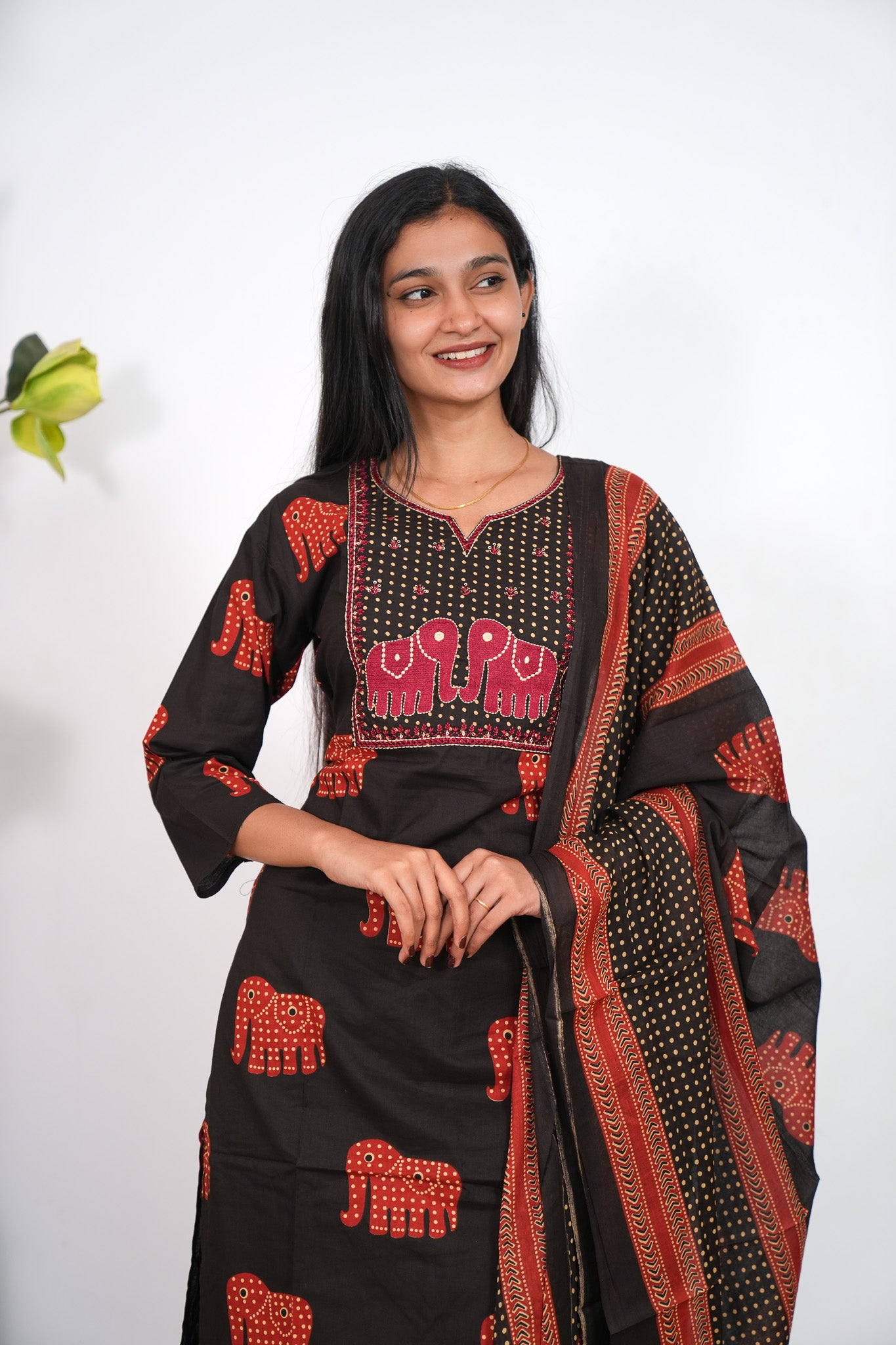 This stunning, vibrant cotton suit set has round neck and elbow length sleeves. The pant comes with an elastic and straight cut. It is paired with matching cotton dupatta.