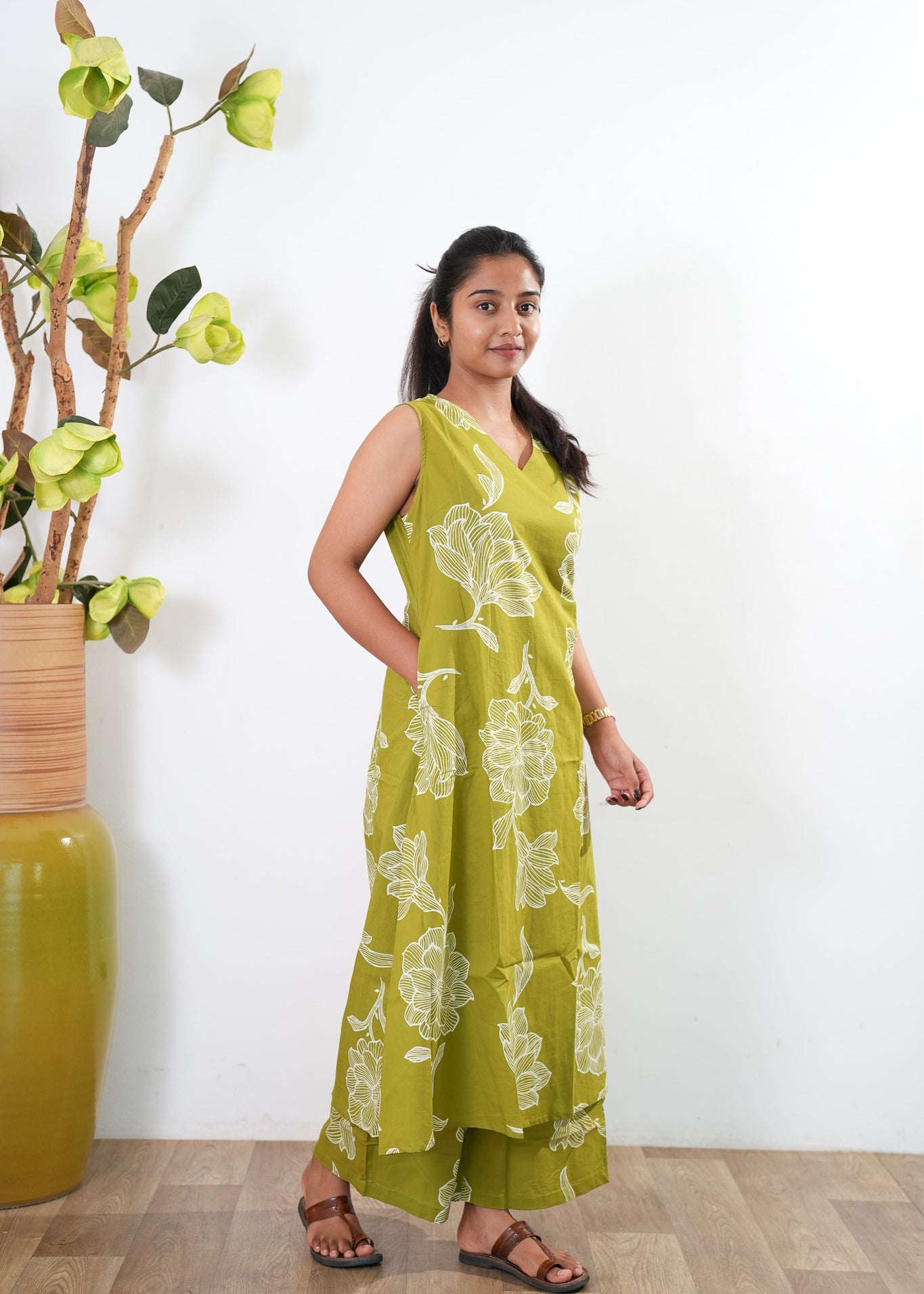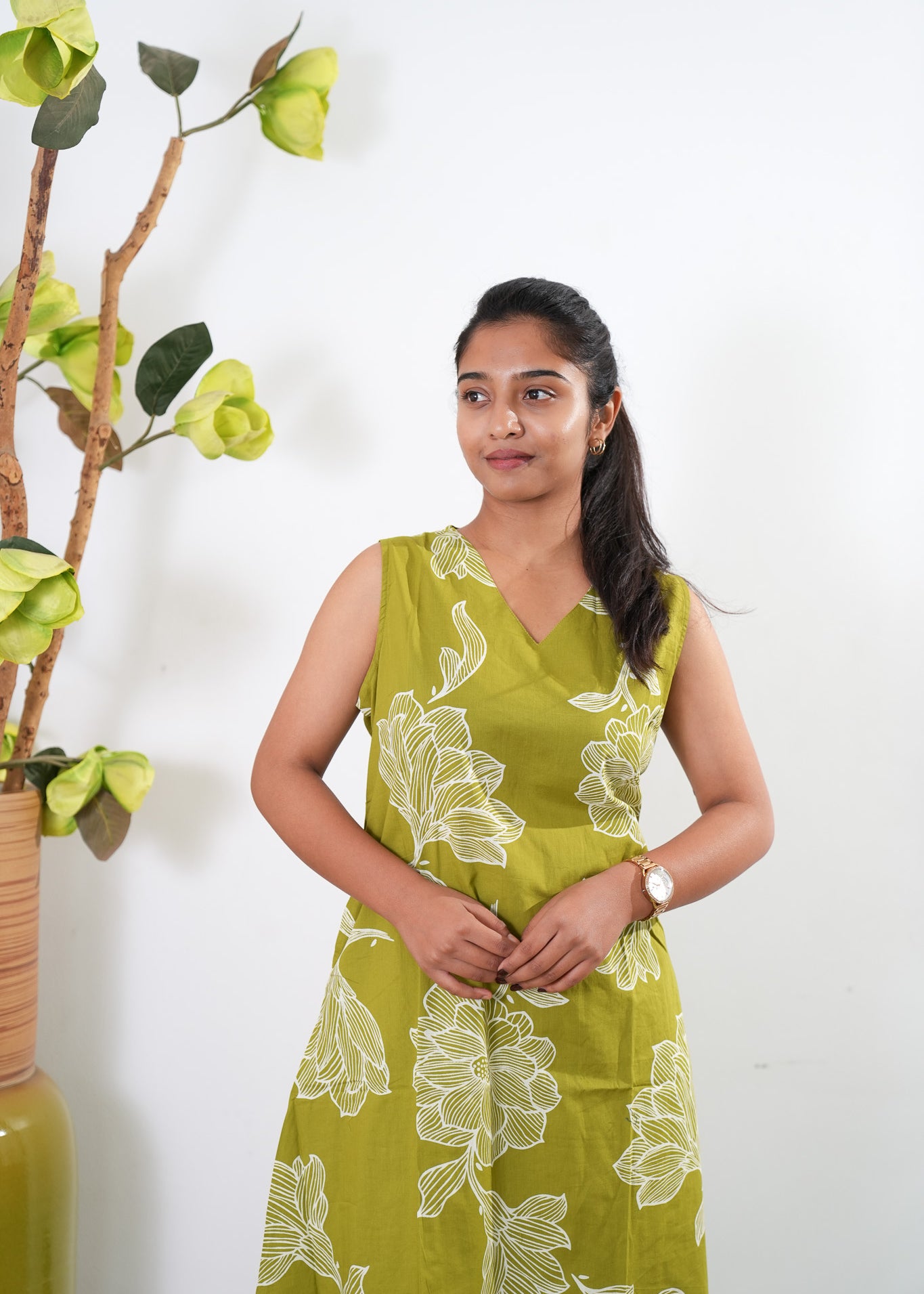 Olive green tie and dye cotton midi dress