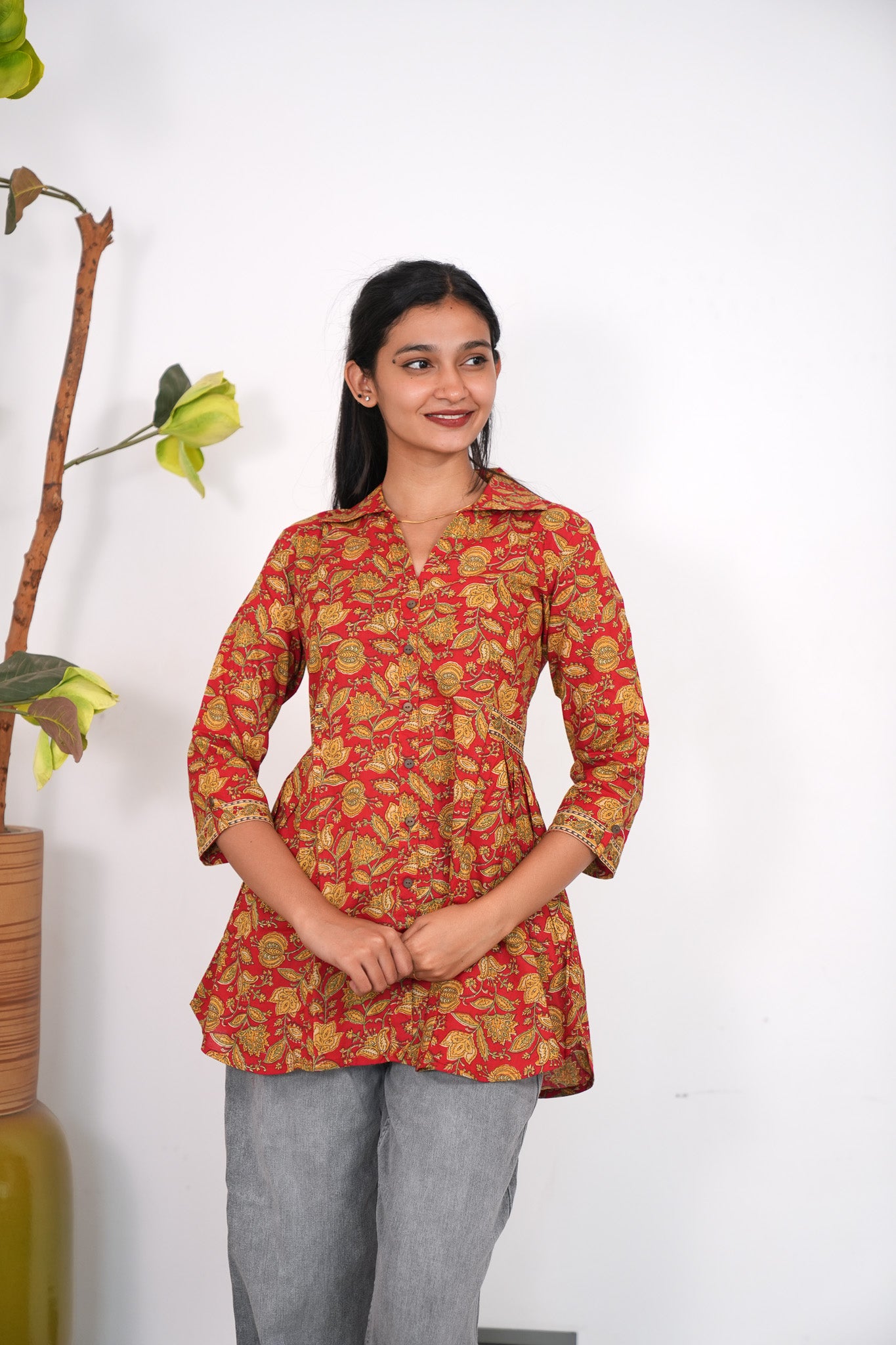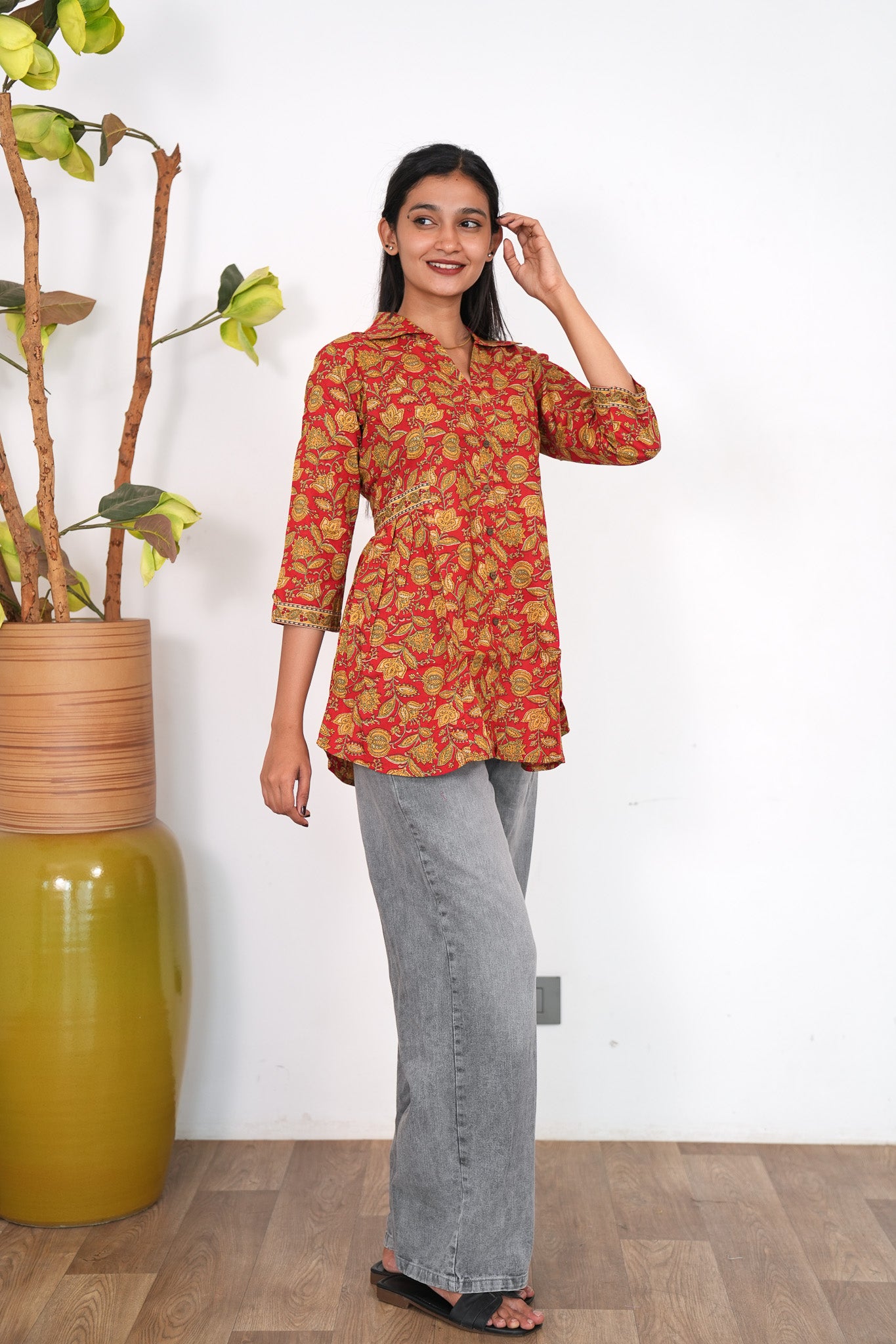 This cotton short kurti has standard collar and 3/4 length sleeves they are extremely breathable and light weight making it perfect for all day comfort. They can be paired with jeans , skirt or even cotton pants.