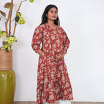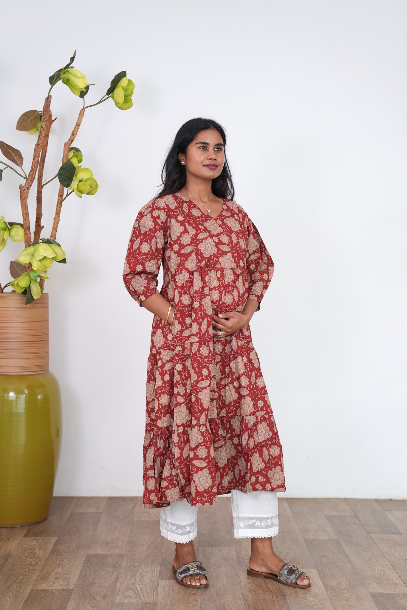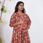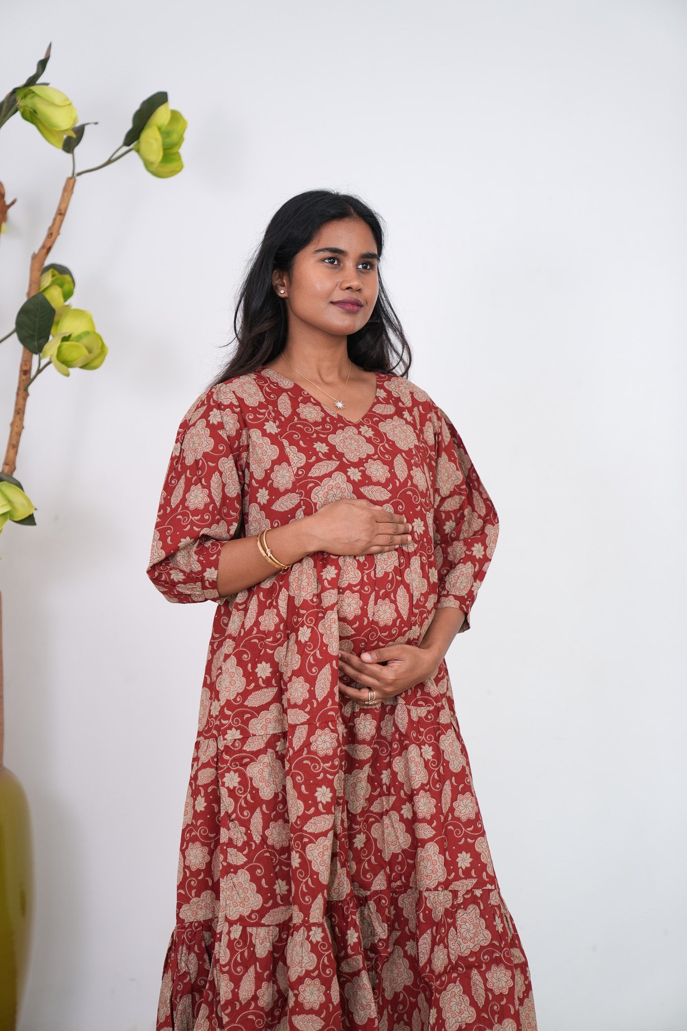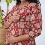 Maroon puff sleeve cotton maternity nursing wear with V neck and 3/4 sleeves that accomodates the bump throughout nine months and has invisible zip on both sides to carefully feed baby. It is light weight and soft to help you get through pregnancy and breastfeeding journey with ease.