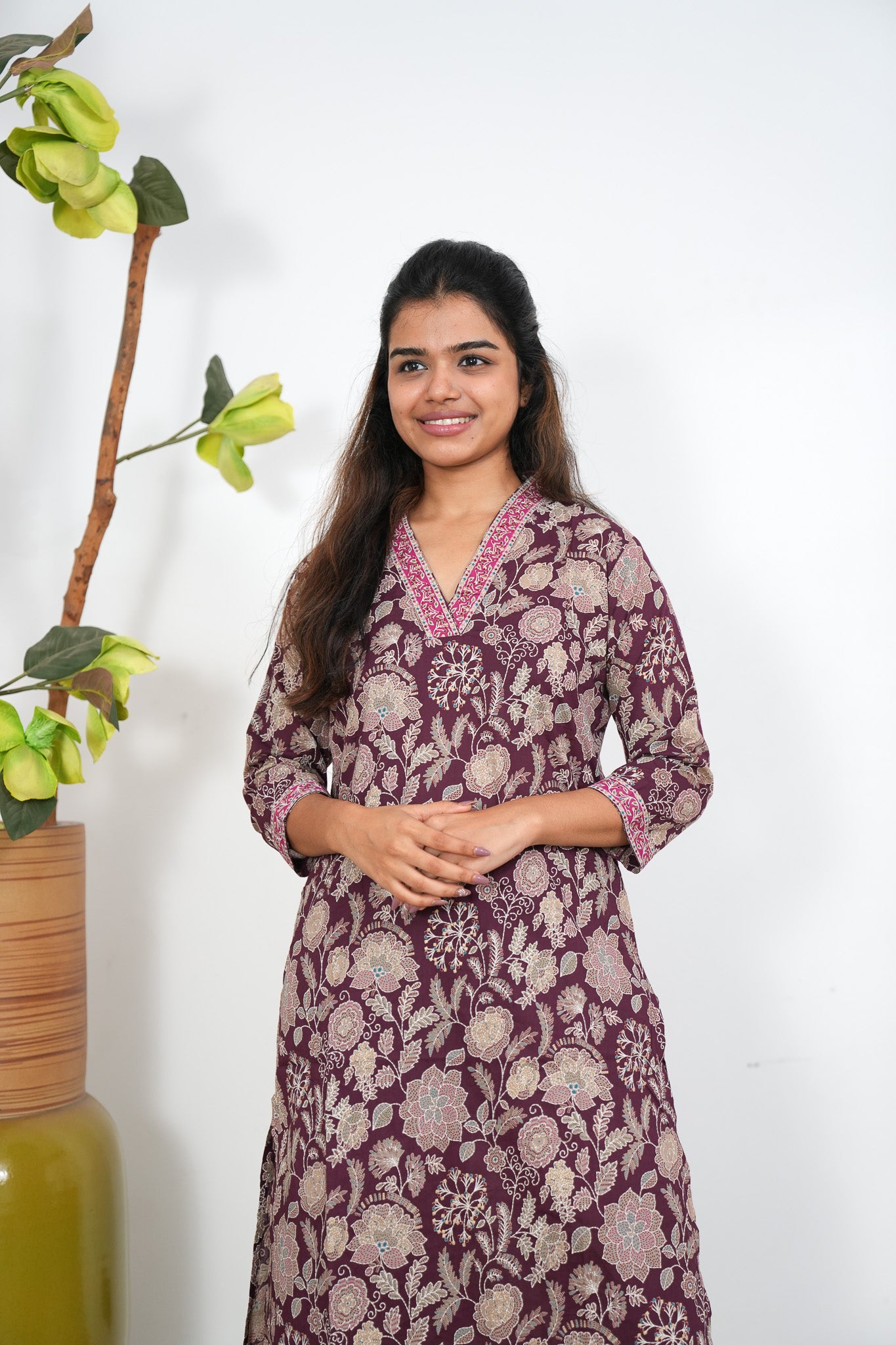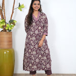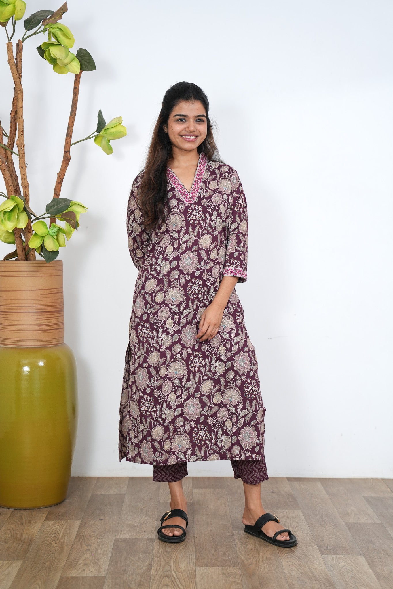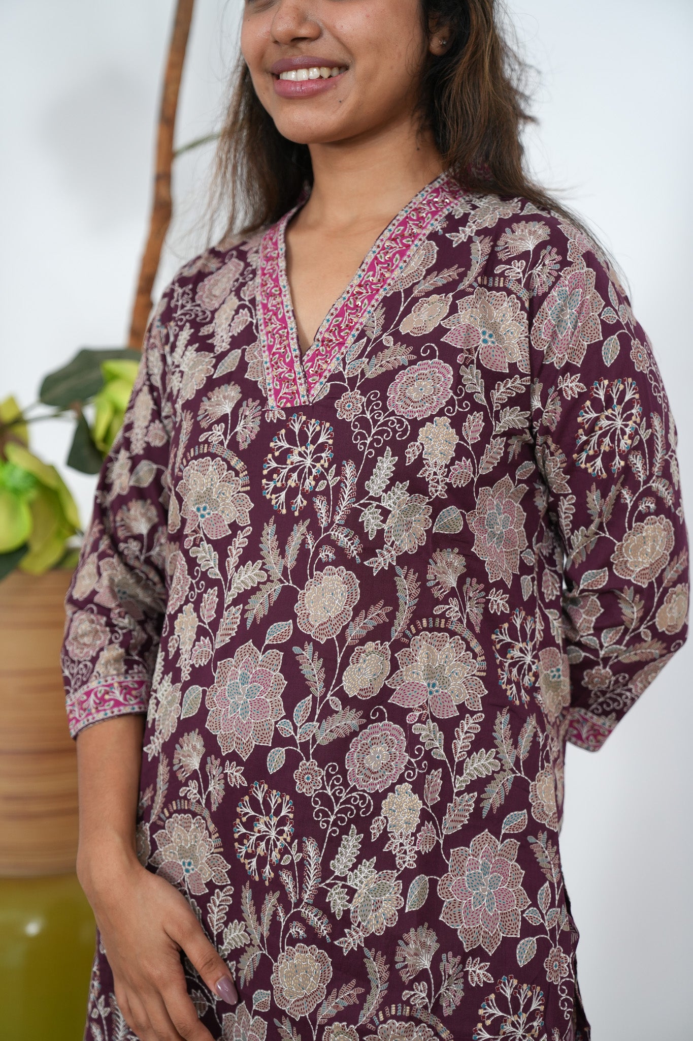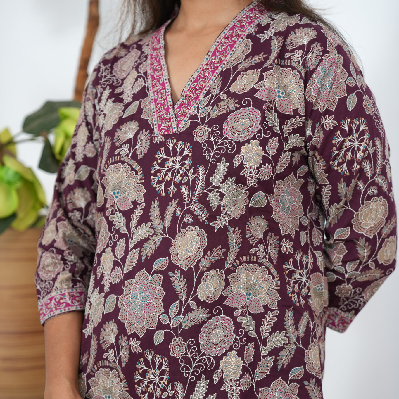Burgundy floral cotton co-ords set which can be paired together or with jeans for a easy breezy summer outfit. It comes with round neck and elbow length sleeves.