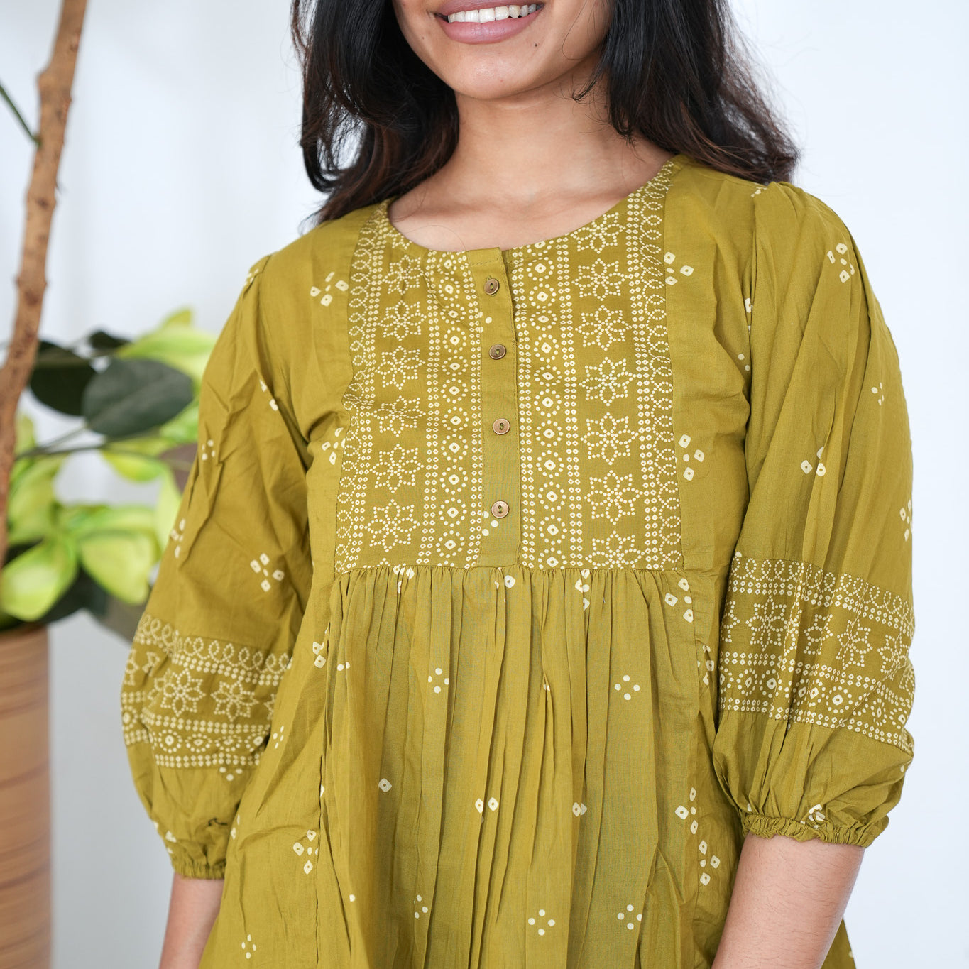 The top has round neck with elbow length sleeves. It has beautiful bandhani pattern all over the top with peplum style. It can be paired with jeans or skirt to complete the look.