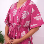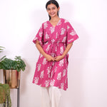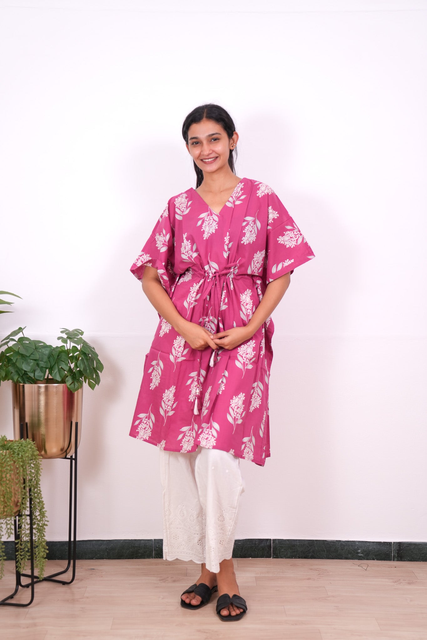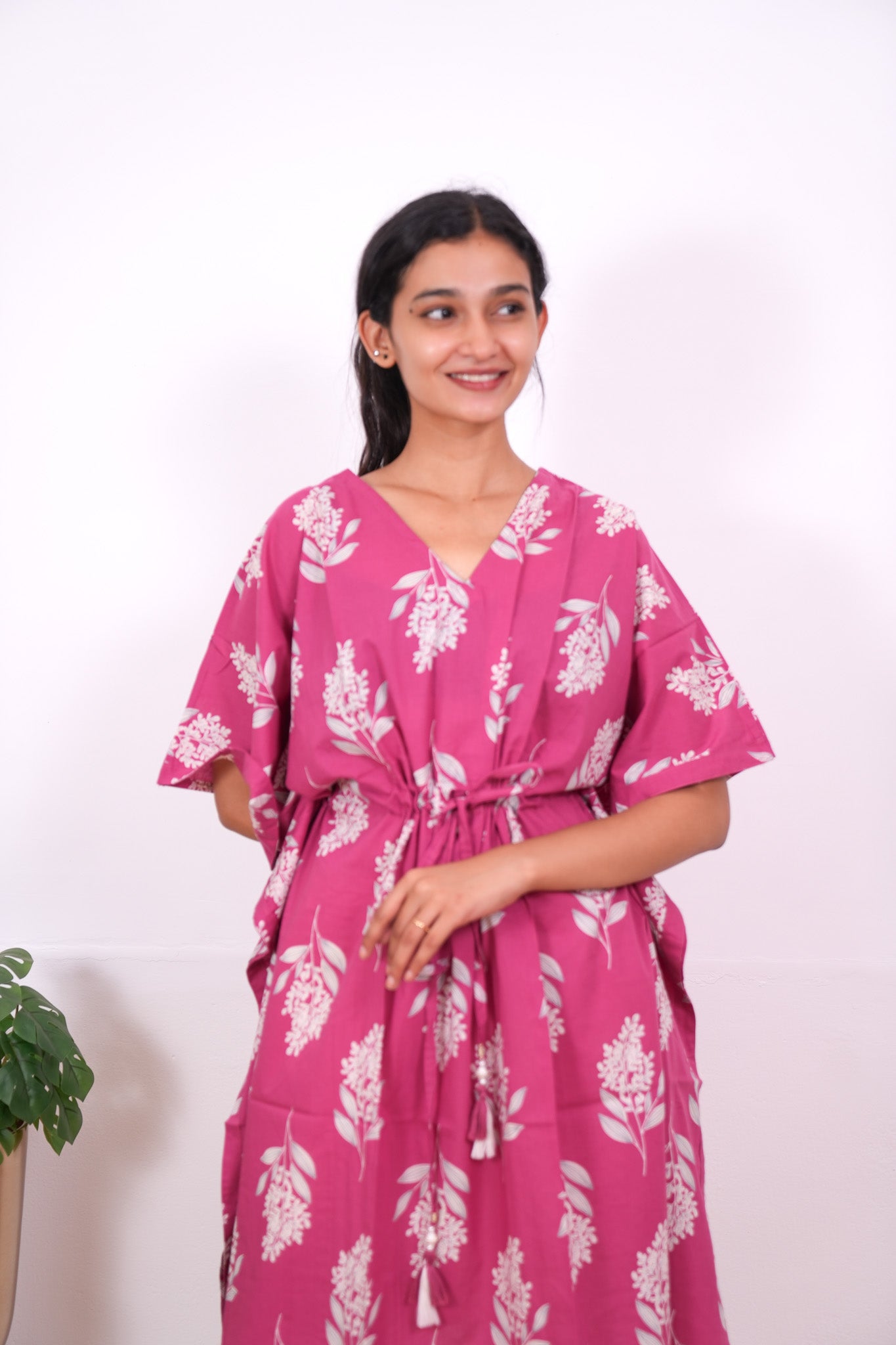 Easy breezy cotton kaftan made for you to feel absolute comfort, elegance and a total stunner at the same time. It comes V neck and tie in the centre with flowy silhouette and floral prints all over.