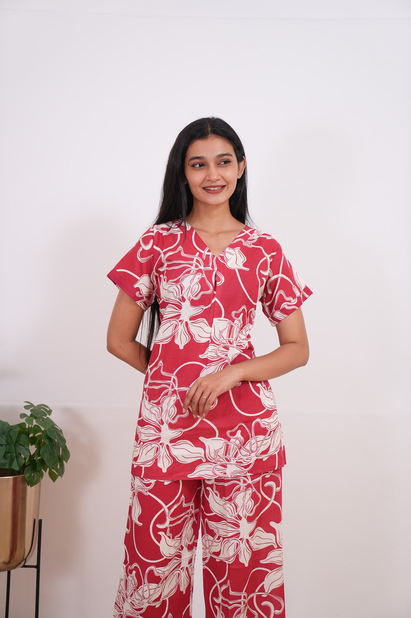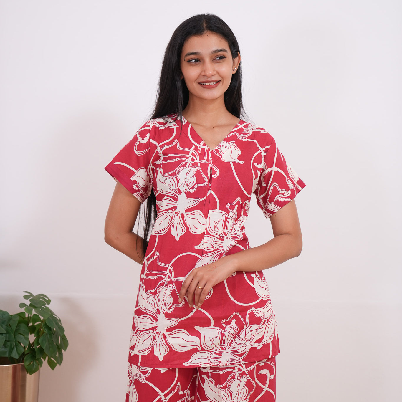 These Co-ords are so cozy, comfortable and chic making it perfect to relax at home or sleep in them. The top has a V neck with short length sleeves. Pant comes with elastic and it has a straight fit.