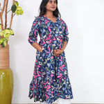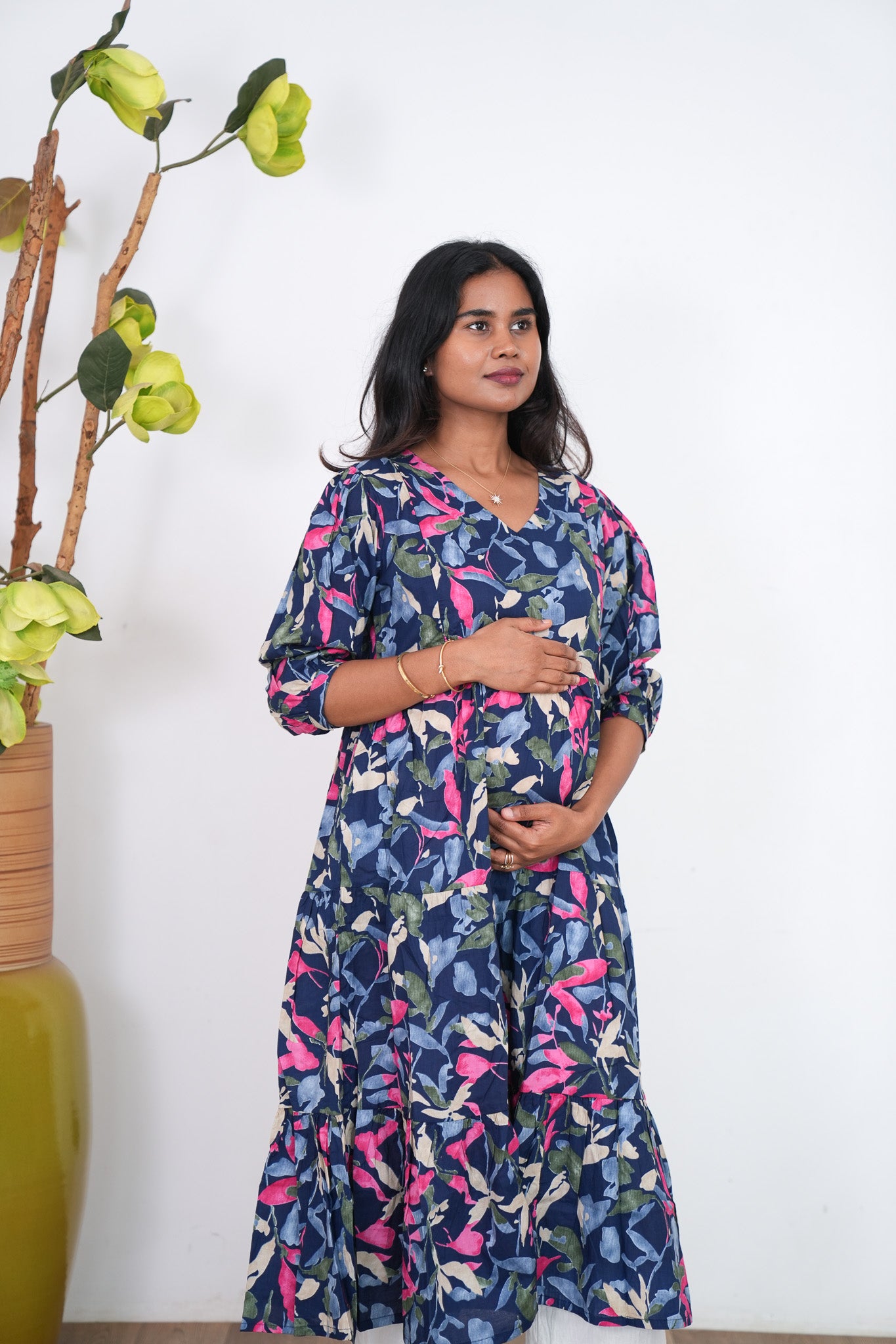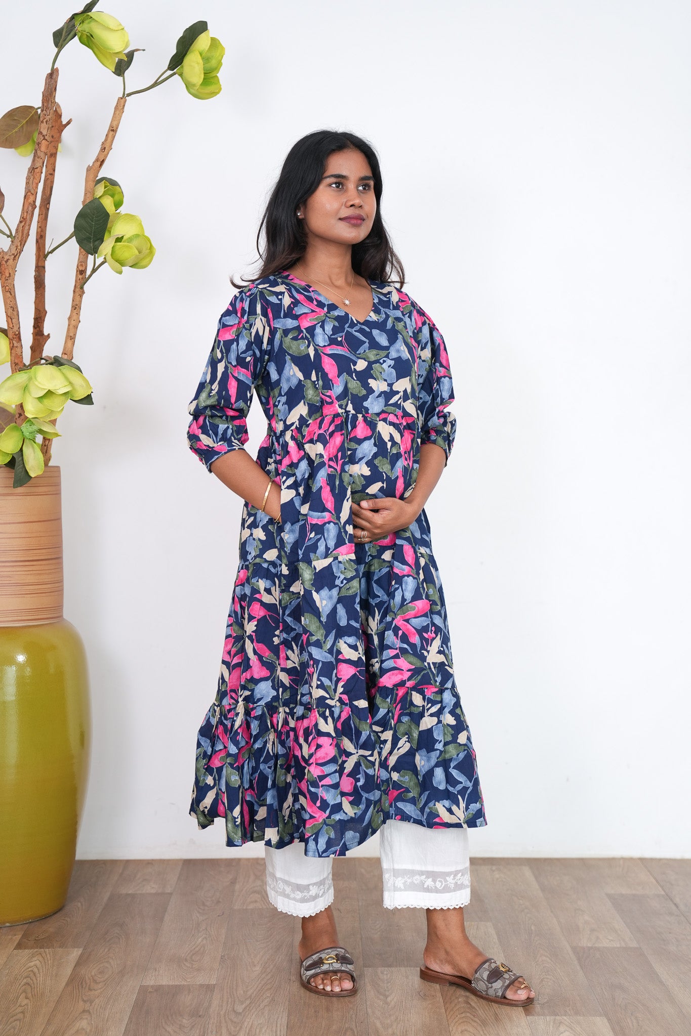 Midnight blue fern maternity nursing wear with V neck and 3/4 sleeves that accomodates the bump throughout nine months and has invisible zip on both sides to carefully feed baby. It is light weight and soft to help you get through pregnancy and breastfeeding journey with ease.