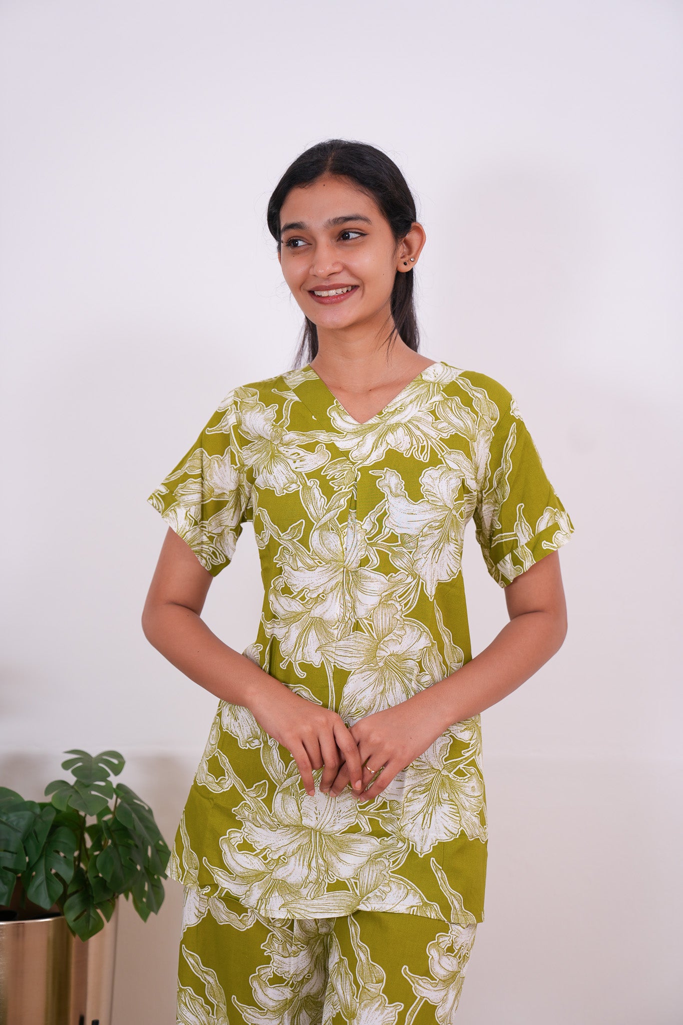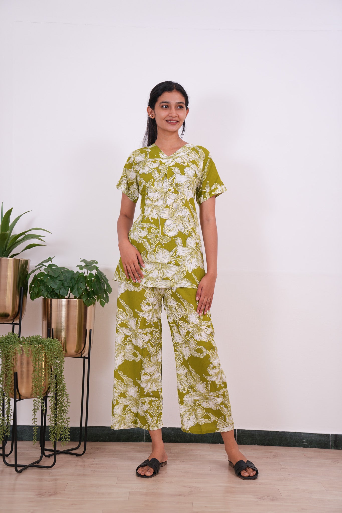 These Co-ords are so cozy, comfortable and chic making it perfect to relax at home or sleep in them. The top has a V neck with short length sleeves. Pant comes with elastic and it has a straight fit.