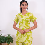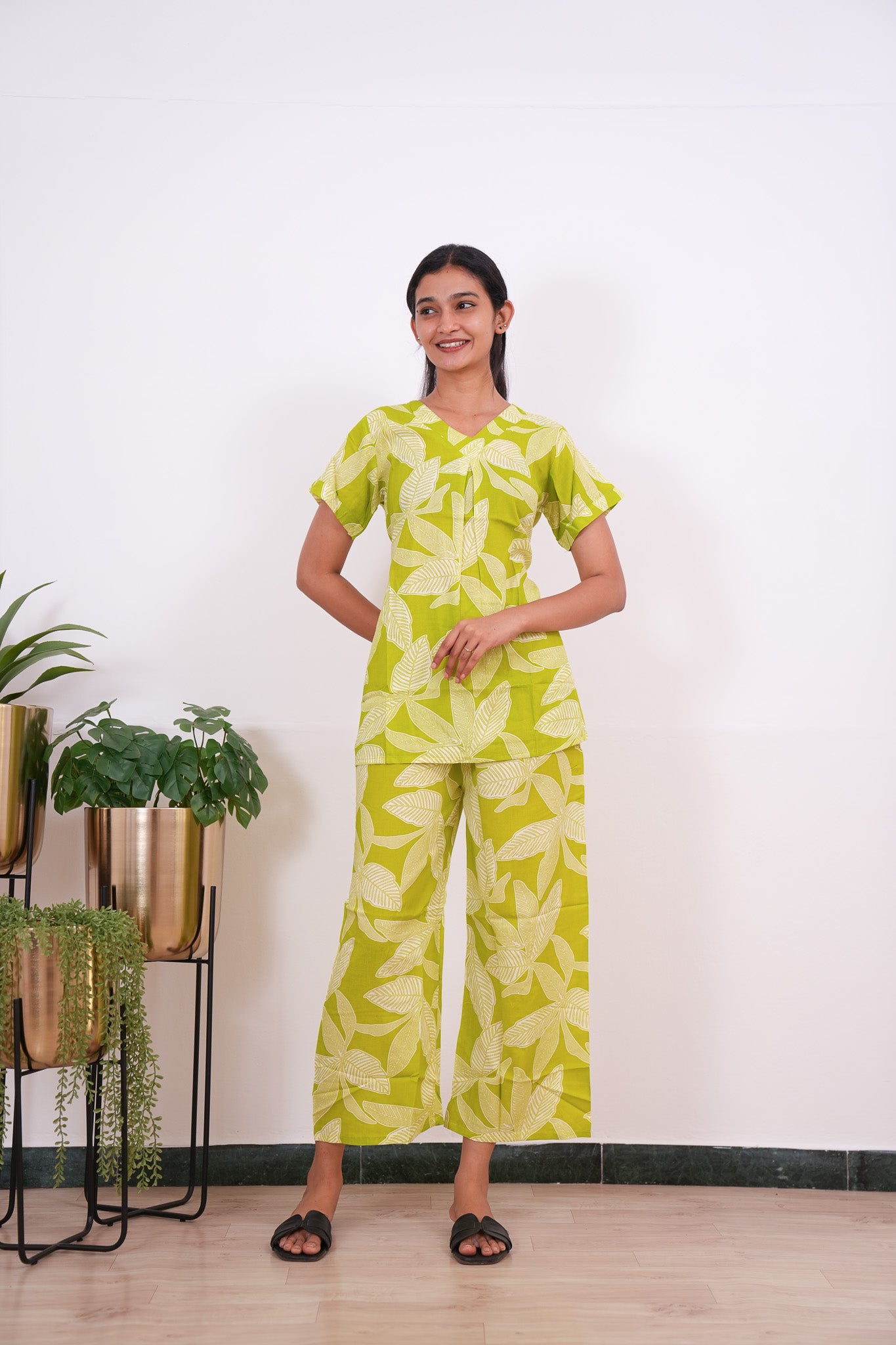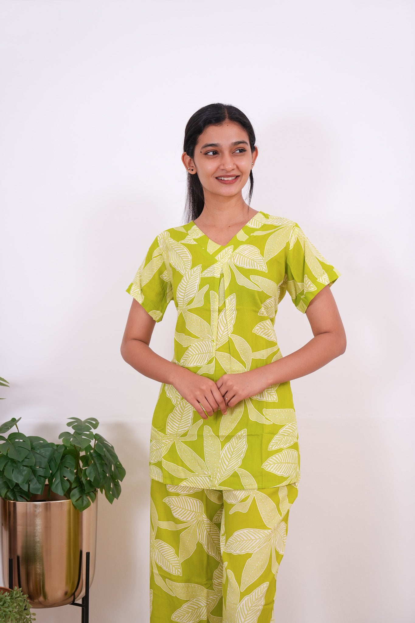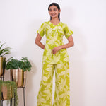 These Co-ords are so cozy, comfortable and chic making it perfect to relax at home or sleep in them. The top has a V neck with short length sleeves. Pant comes with elastic and it has a straight fit.