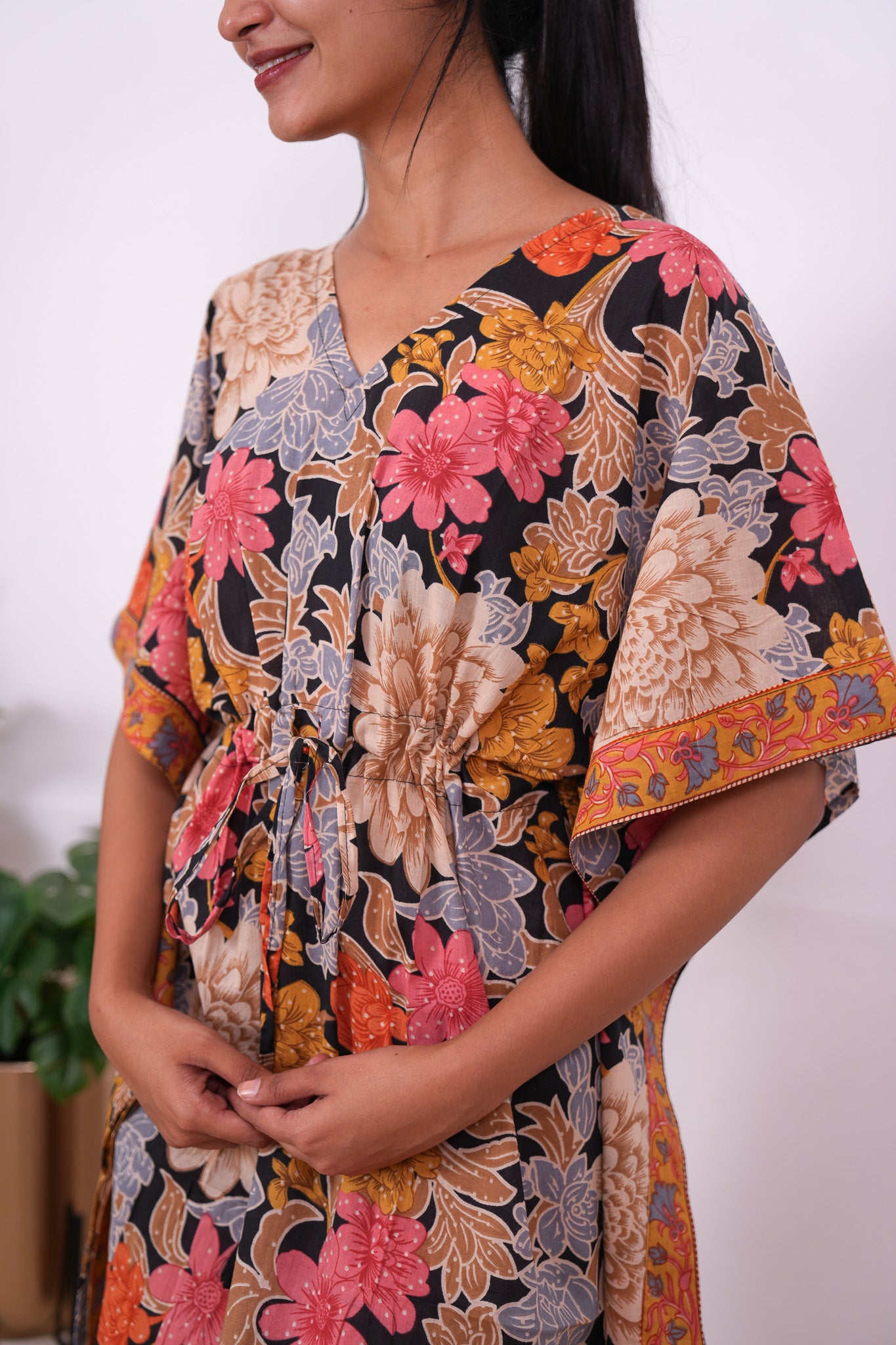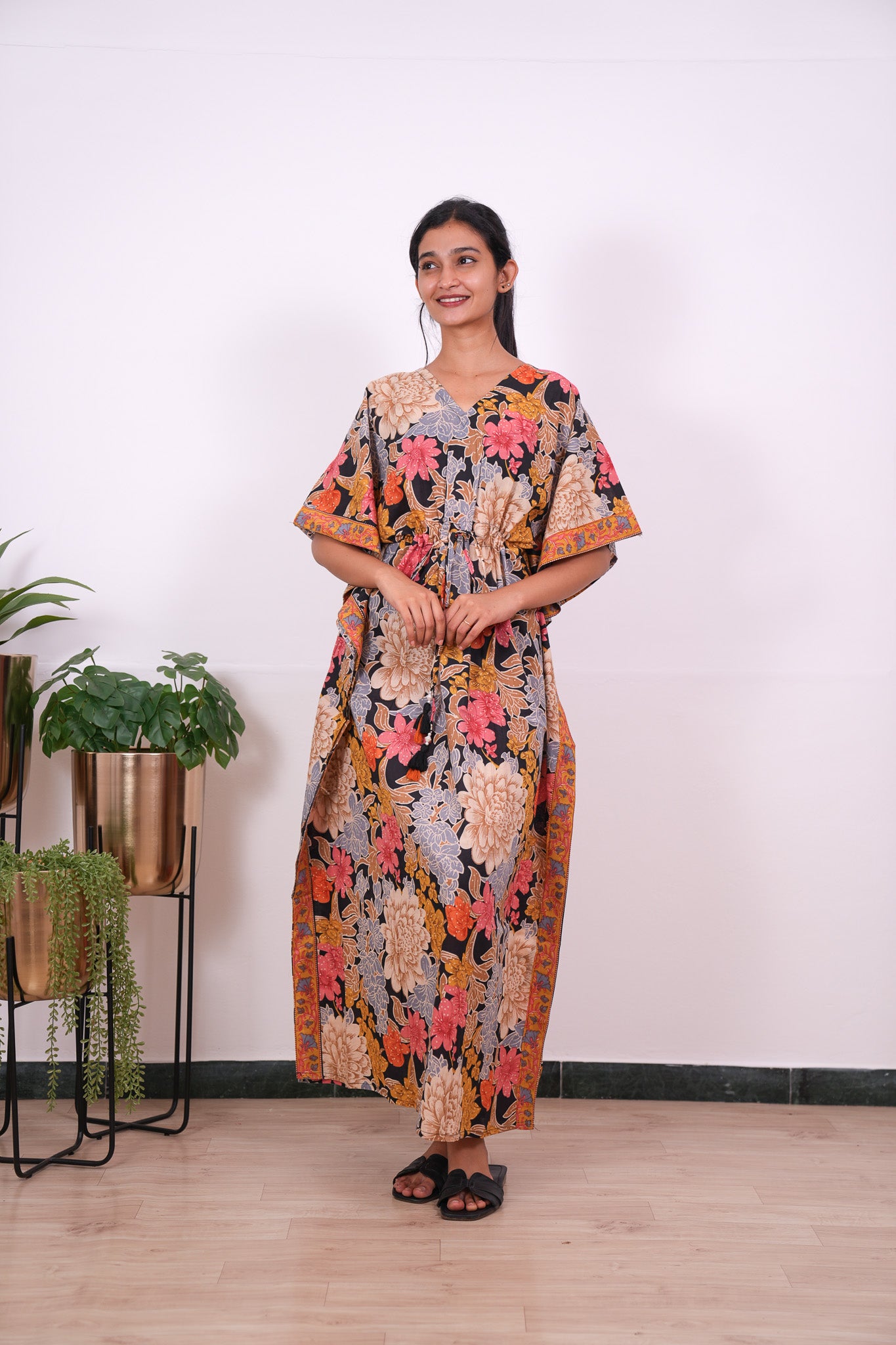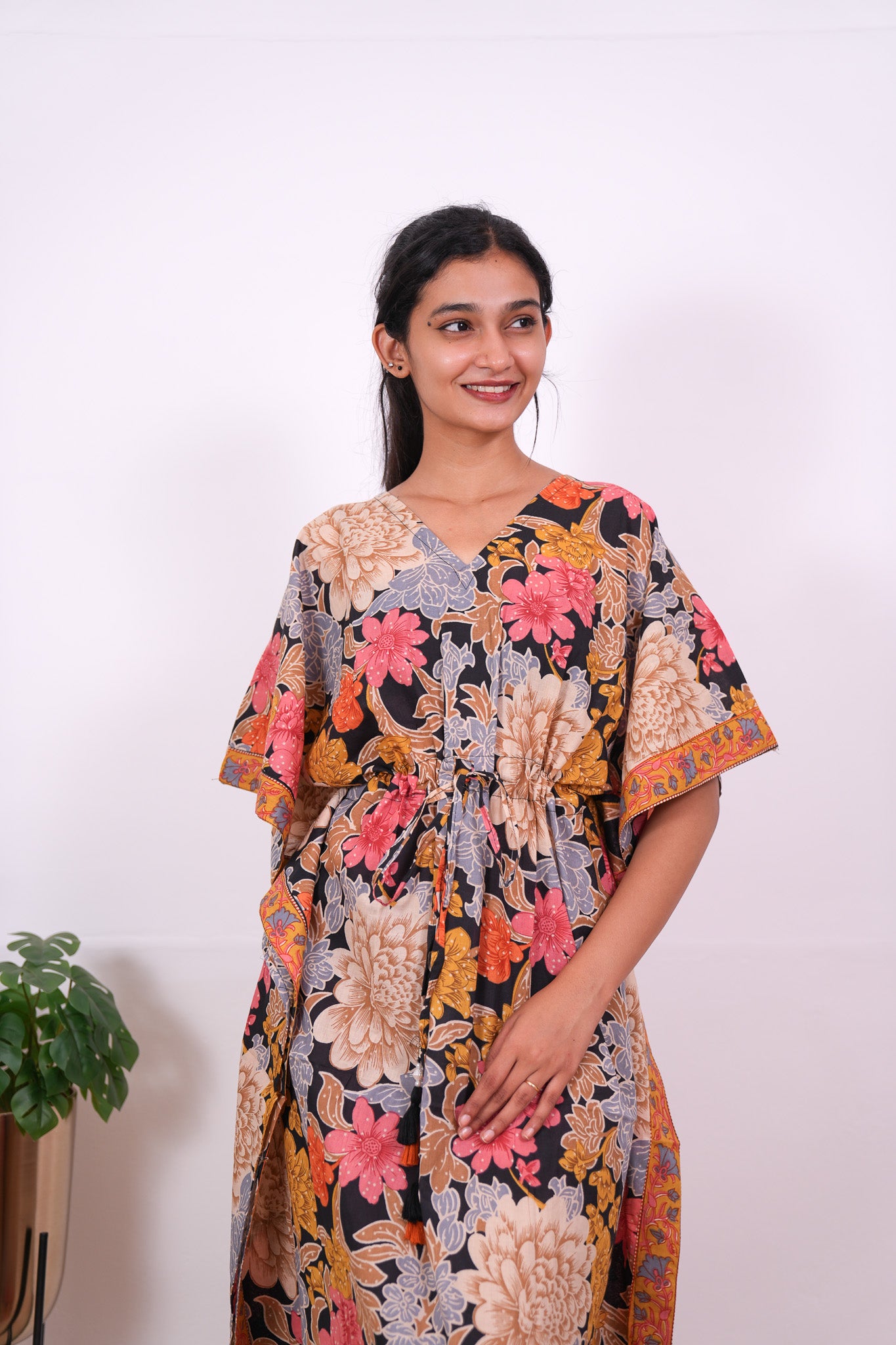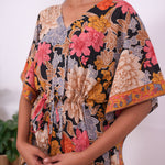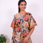 Easy breezy cotton kaftan made for you to feel absolute comfort, elegance and a total stunner at the same time. It comes V neck and tie in the centre with flowy silhouette and floral prints all over.