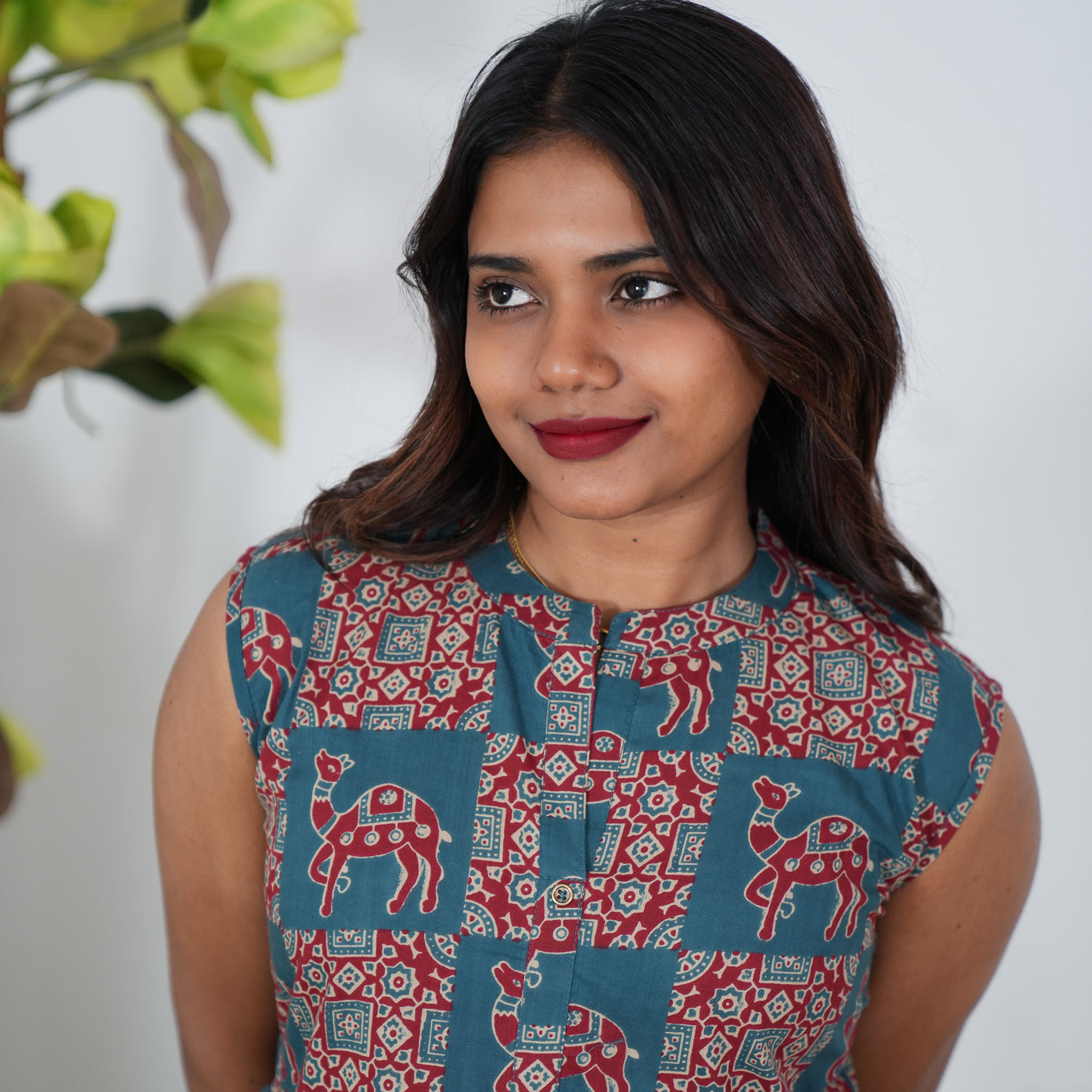 Peacock blue ajrakh camel printed cotton kurti (sleeve attached)