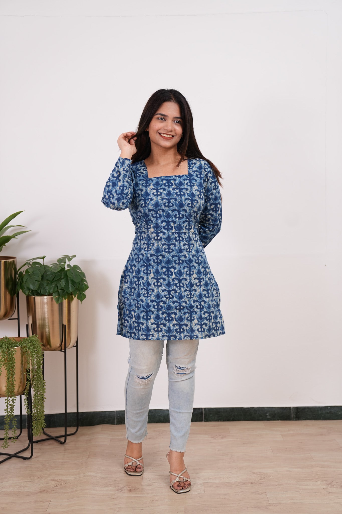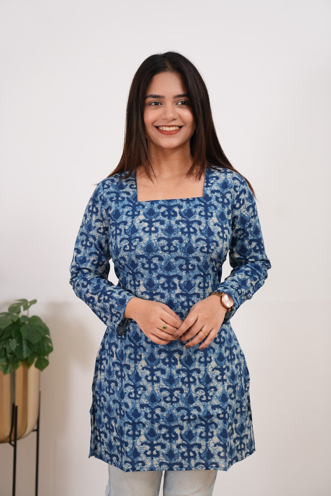 The short kurti has square neck with full sleeves. It has a corset tie at the back to give you a cinched waist. It can be paired with jeans or cotton pants to complete the look.