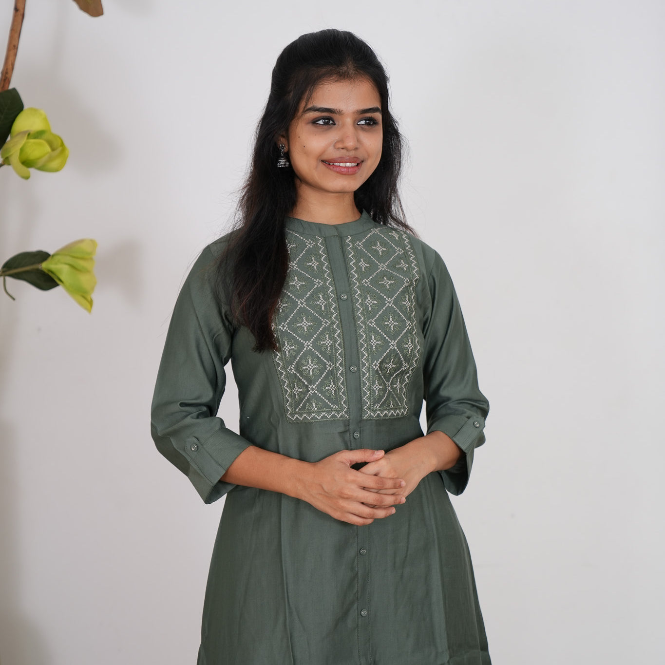 These Co-ords are so cozy, comfortable and chic making it perfect for brunch and a girl's day out! The kurta has round close neck with embroidery in the neckline and 3/4 sleeves. Pant comes with elastic and has a palazzo fit.