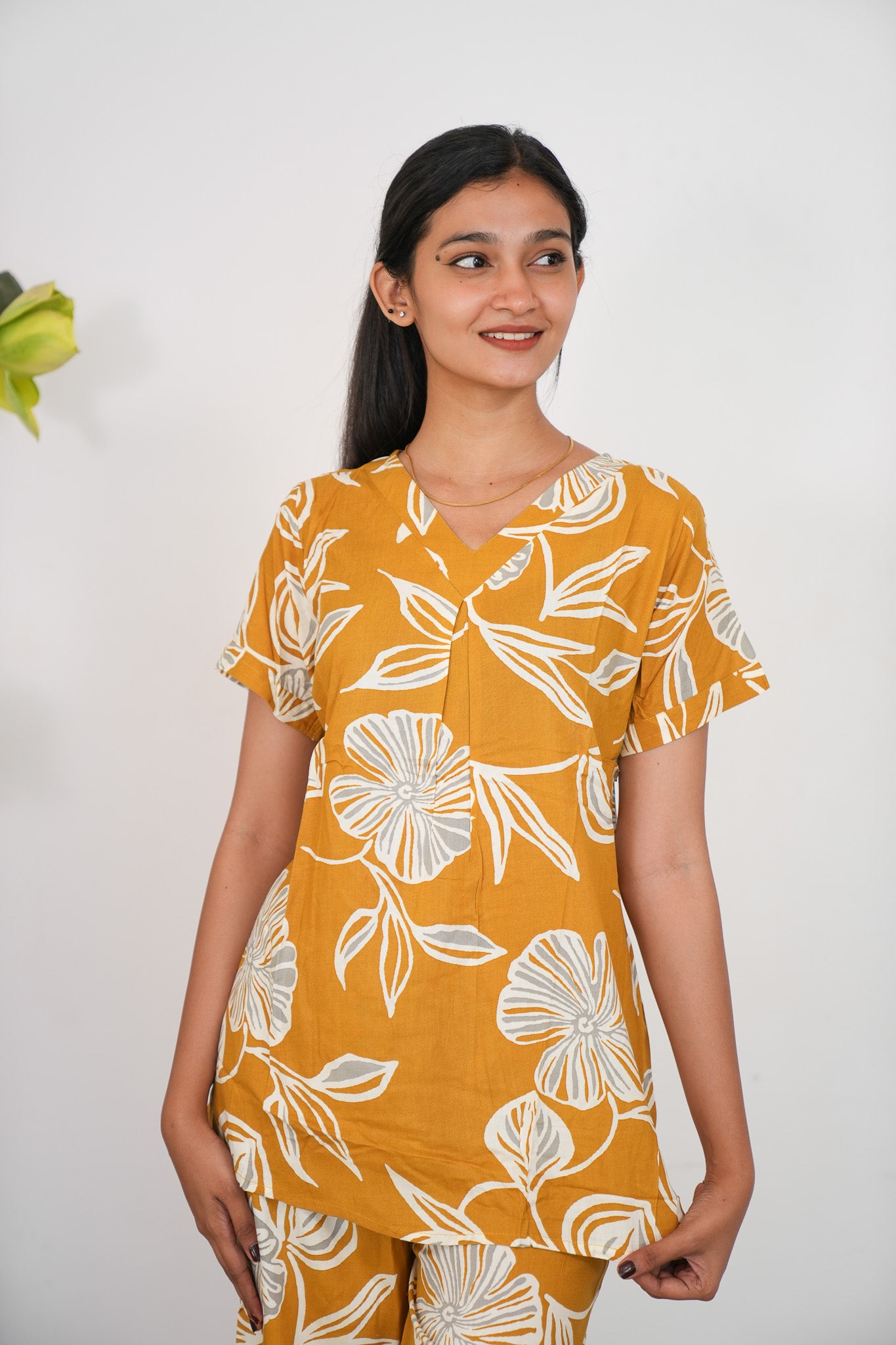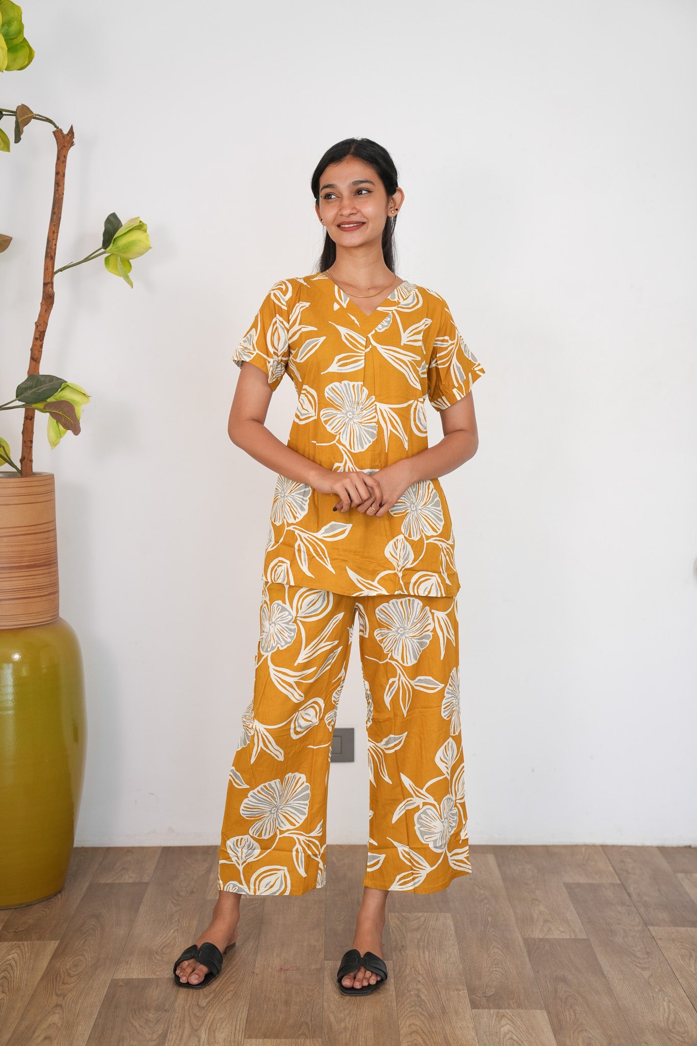 These Co-ords are so cozy, comfortable and chic making it perfect to relax at home or sleep in them. The top has a V neck with short length sleeves. Pant comes with elastic and it has a straight fit.
