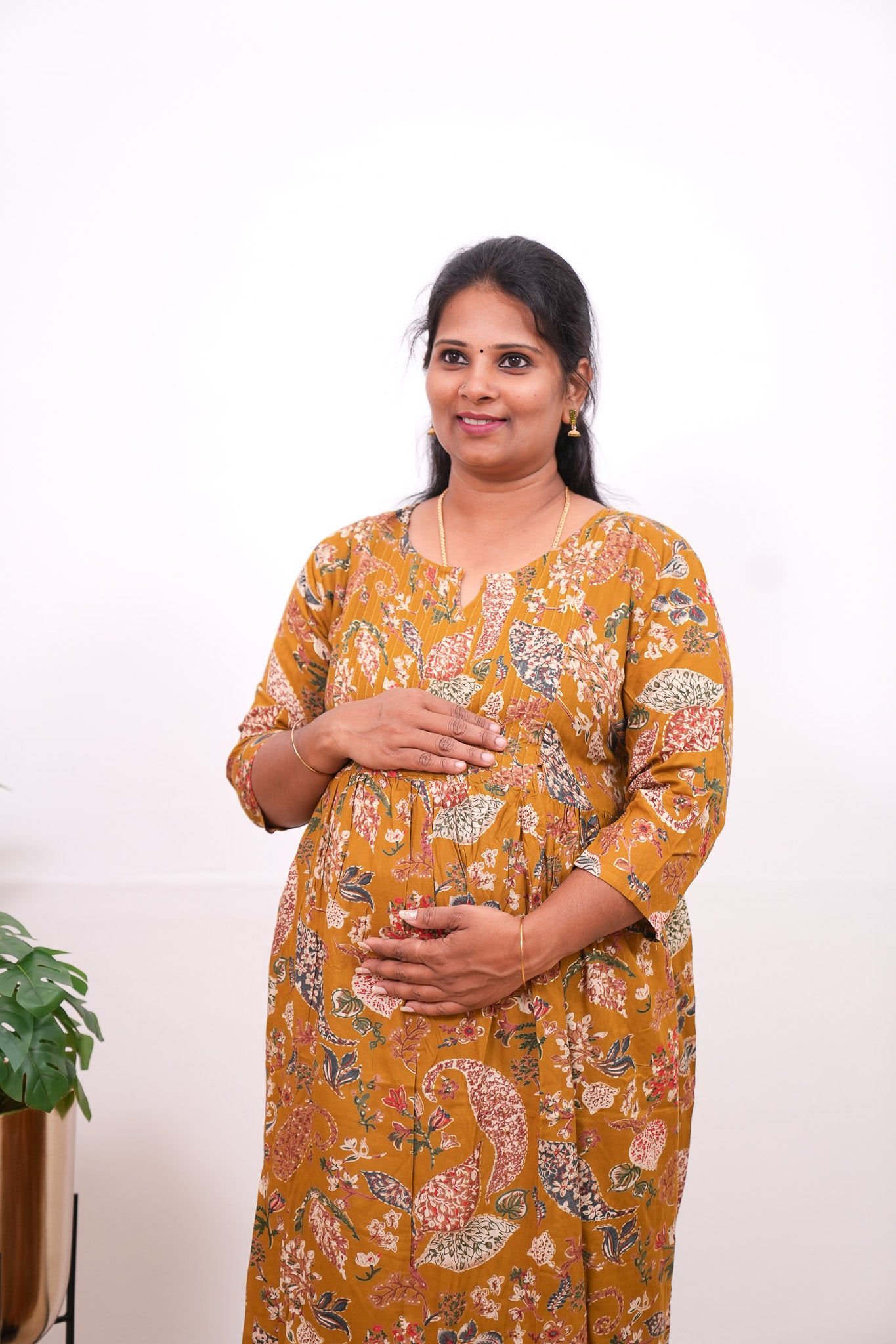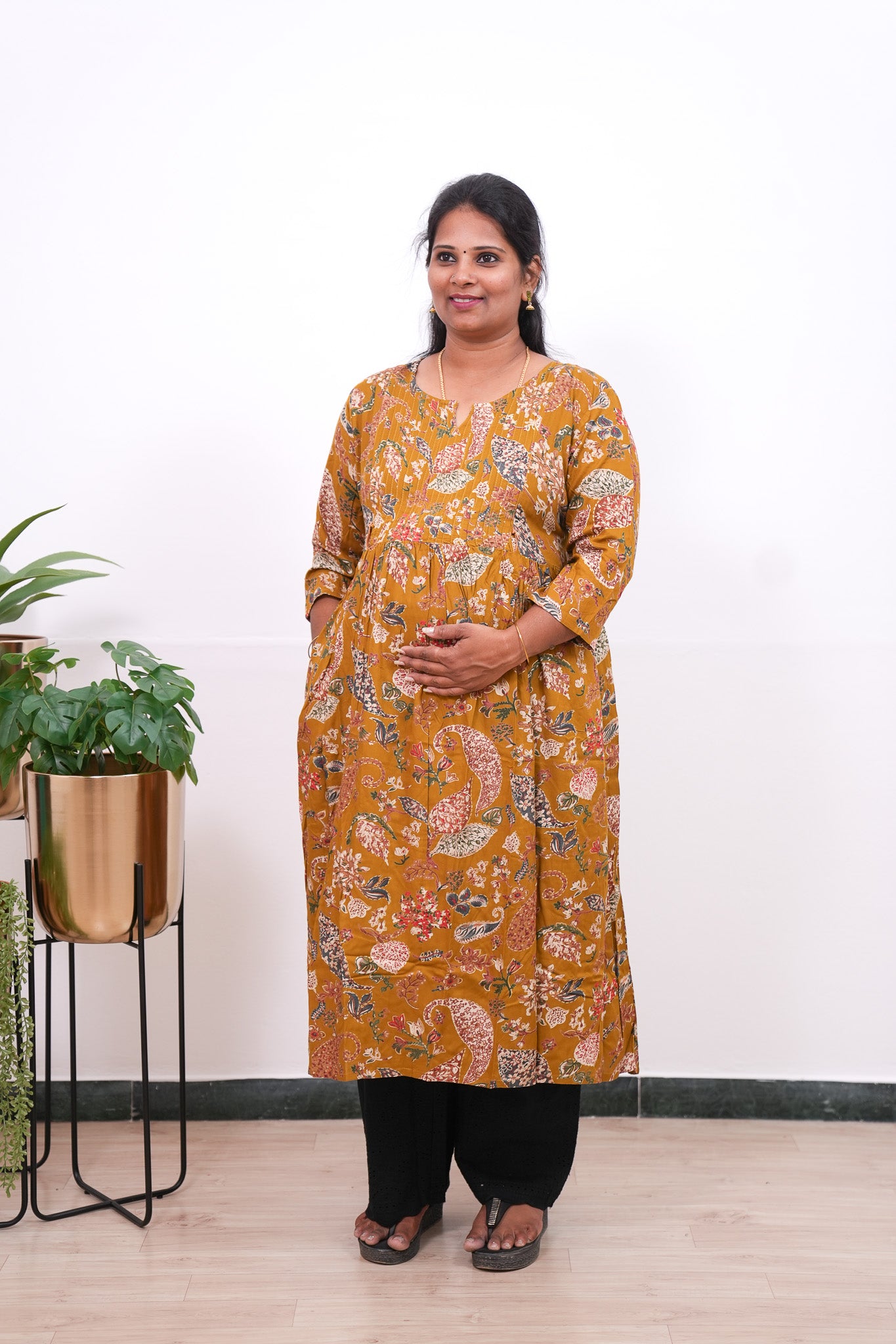 Mustard Pintex  maternity nursing wear with round neck and 3/4 sleeves that accomodates the bump throughout nine months and has invisible zip on both sides to carefully feed baby. It is light weight and soft to help you get through pregnancy and breastfeeding journey with ease.