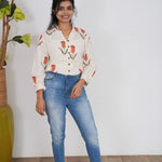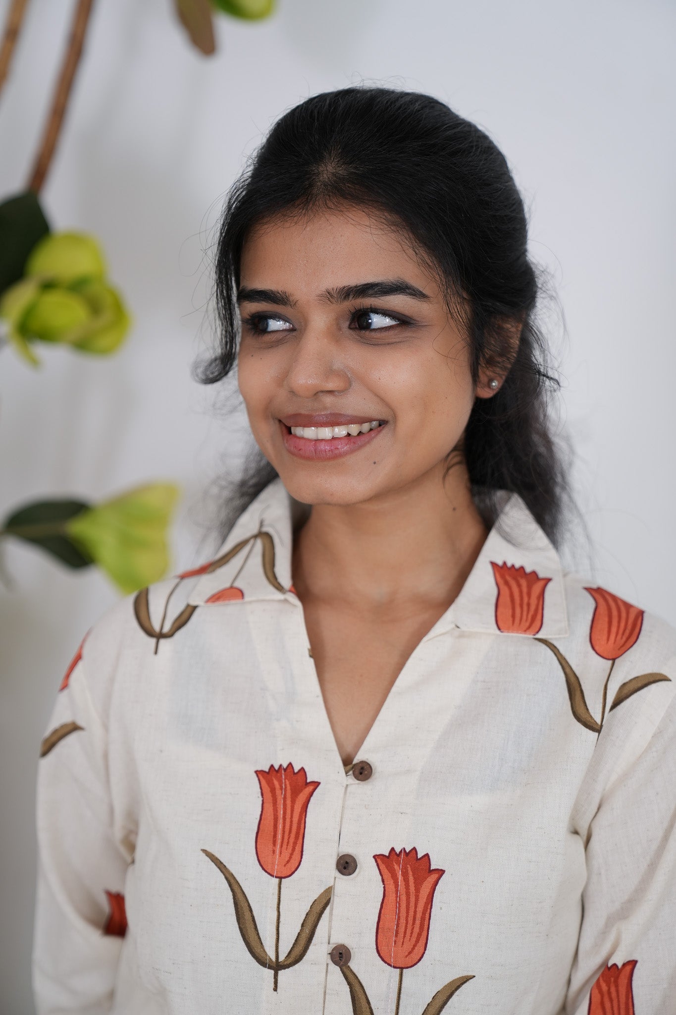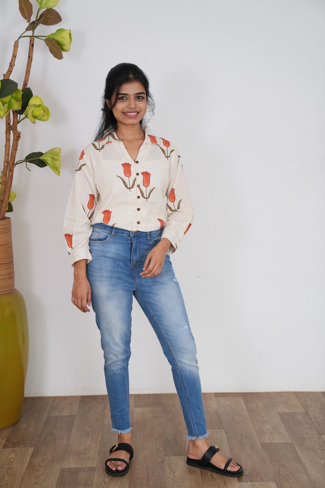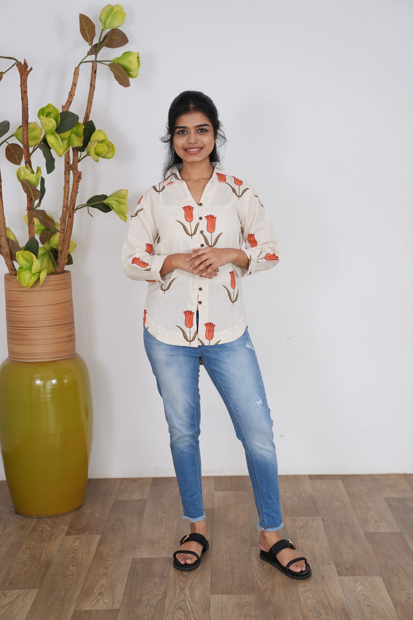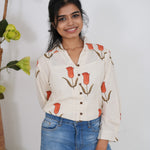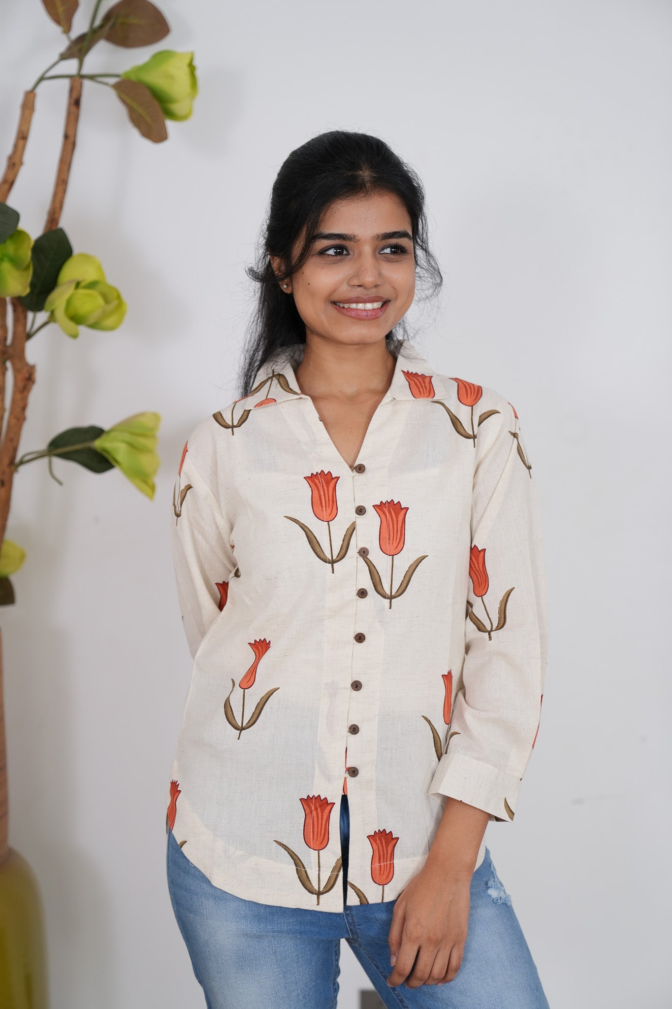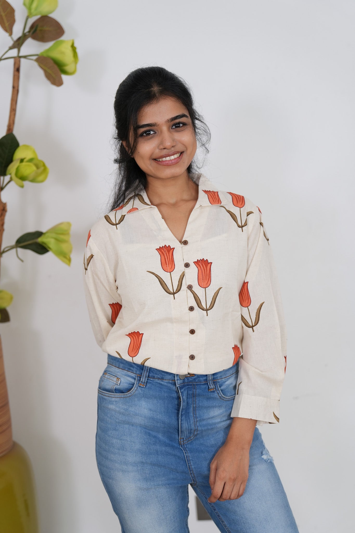 Crisp shirt with tulips pattern on the shirt with button detailing in the centre and in the sleeve ends.