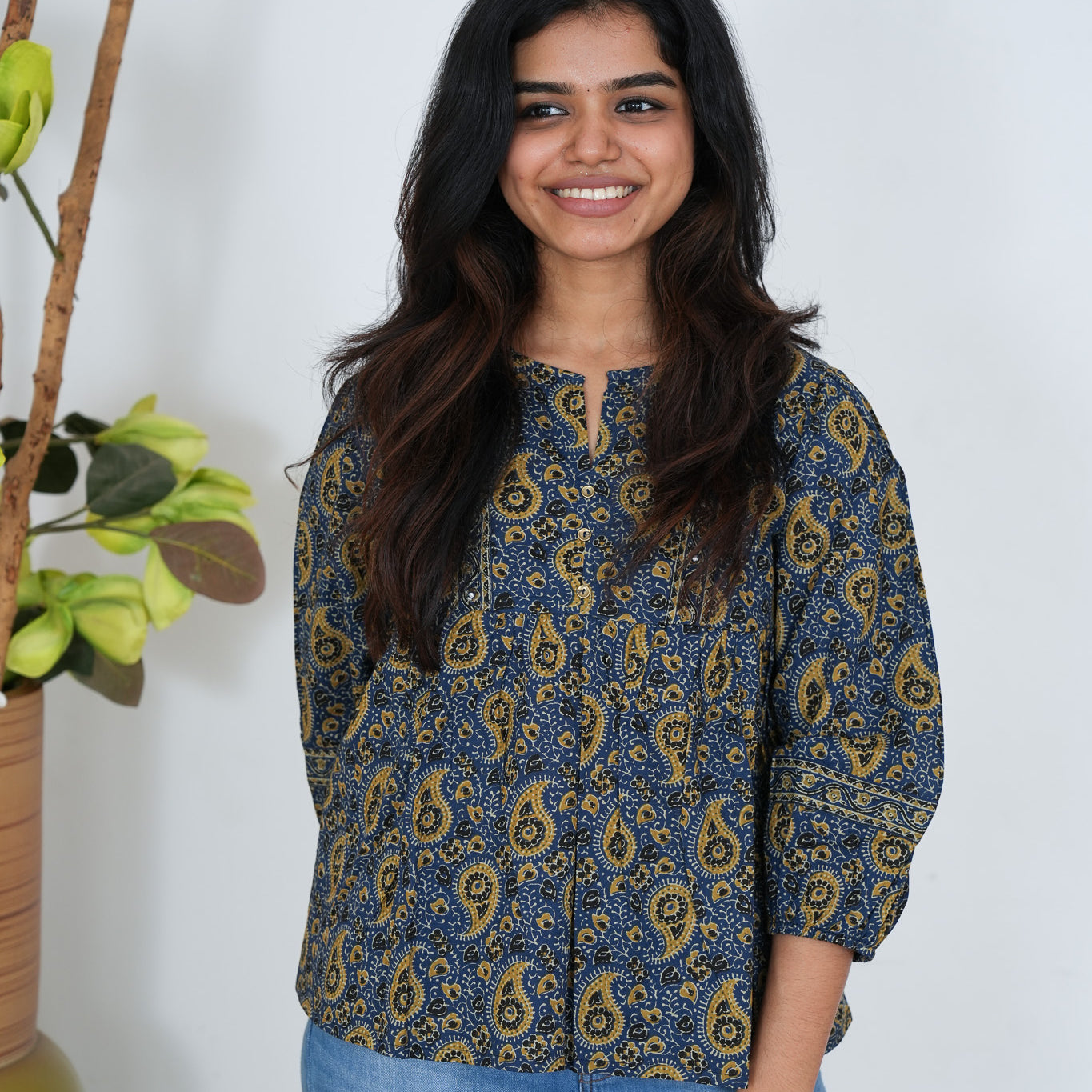 Royal blue ajrakh V neck cotton peplum top