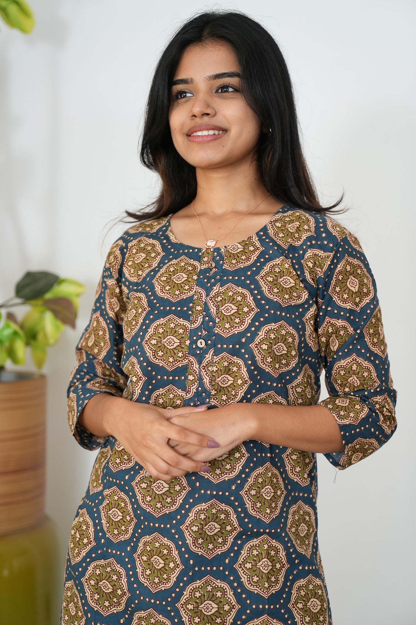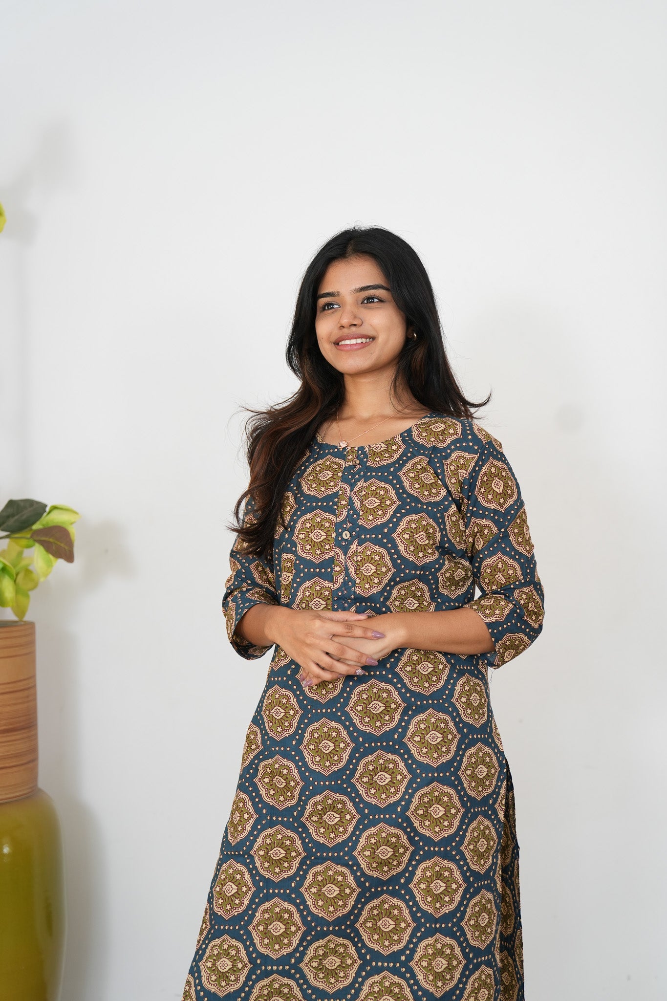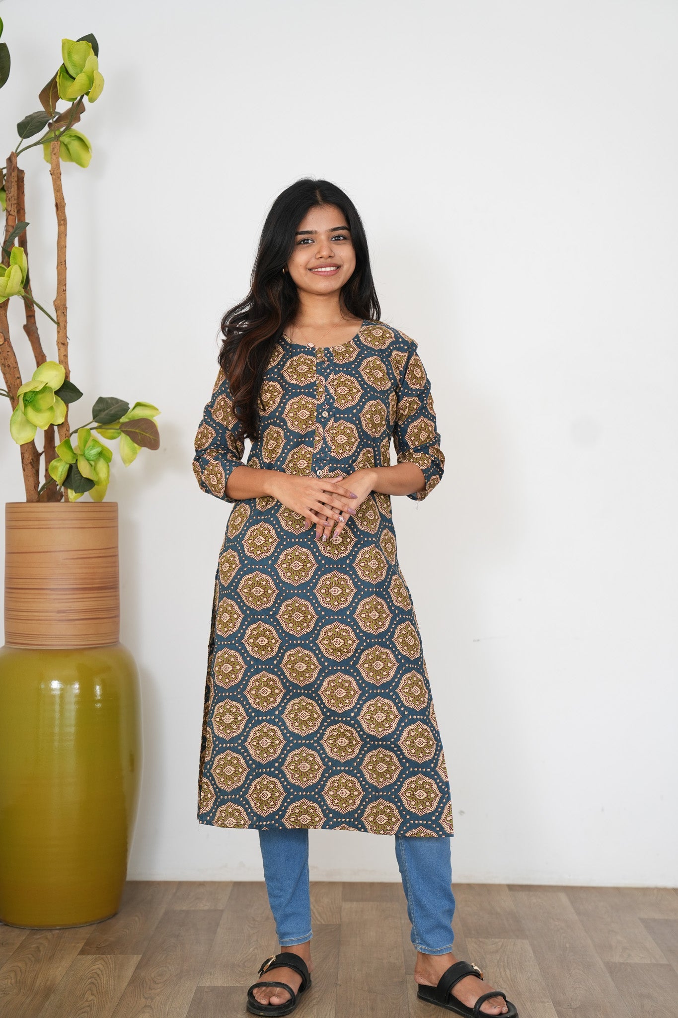 The kurti comes with a floral print all over the kurti with vibrant colour mixtures. It comes with round neck with elbow length sleeves. It can be paired with cotton pants or jeans to pull of that comfortable look!!