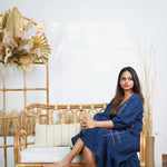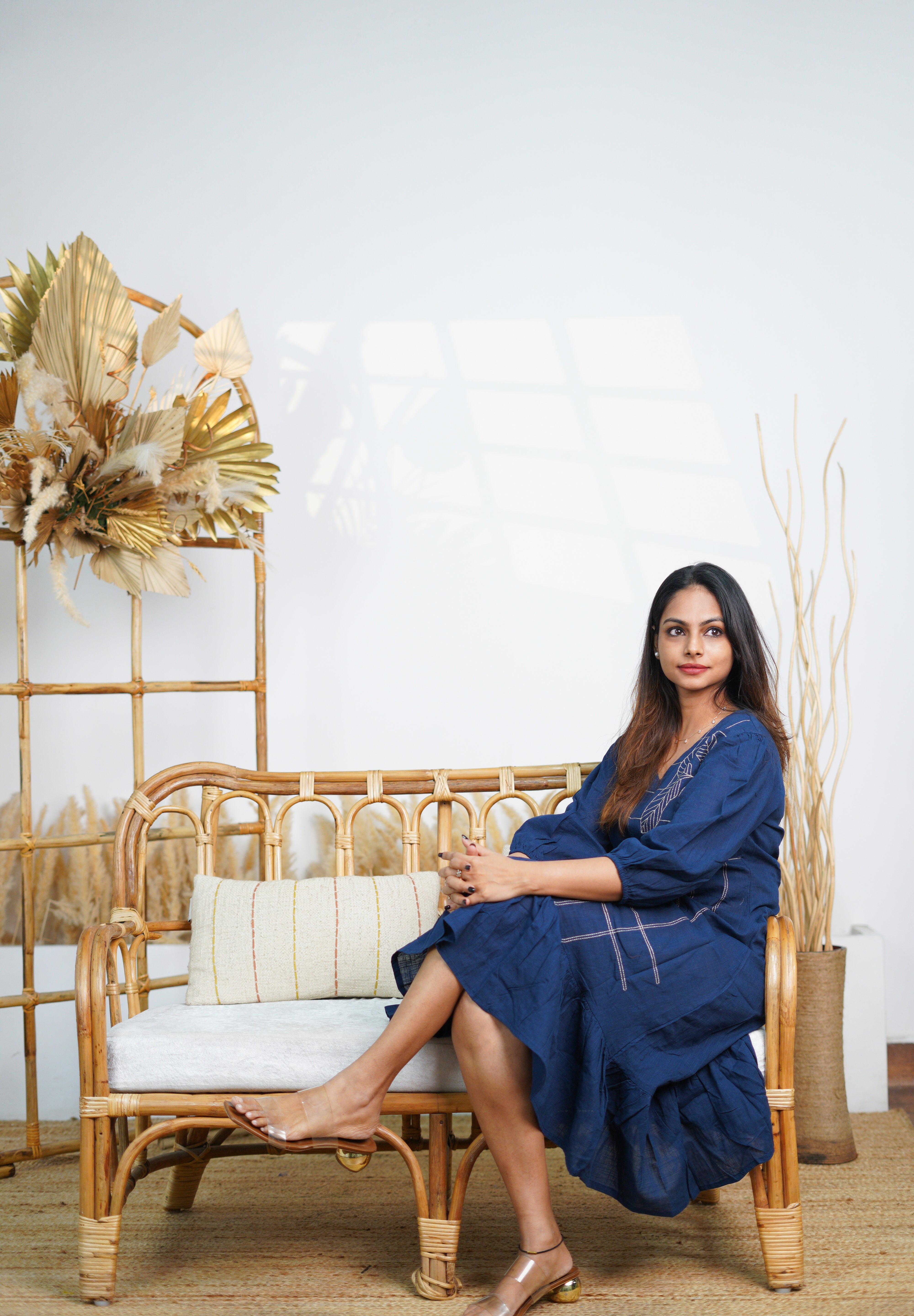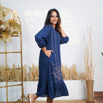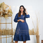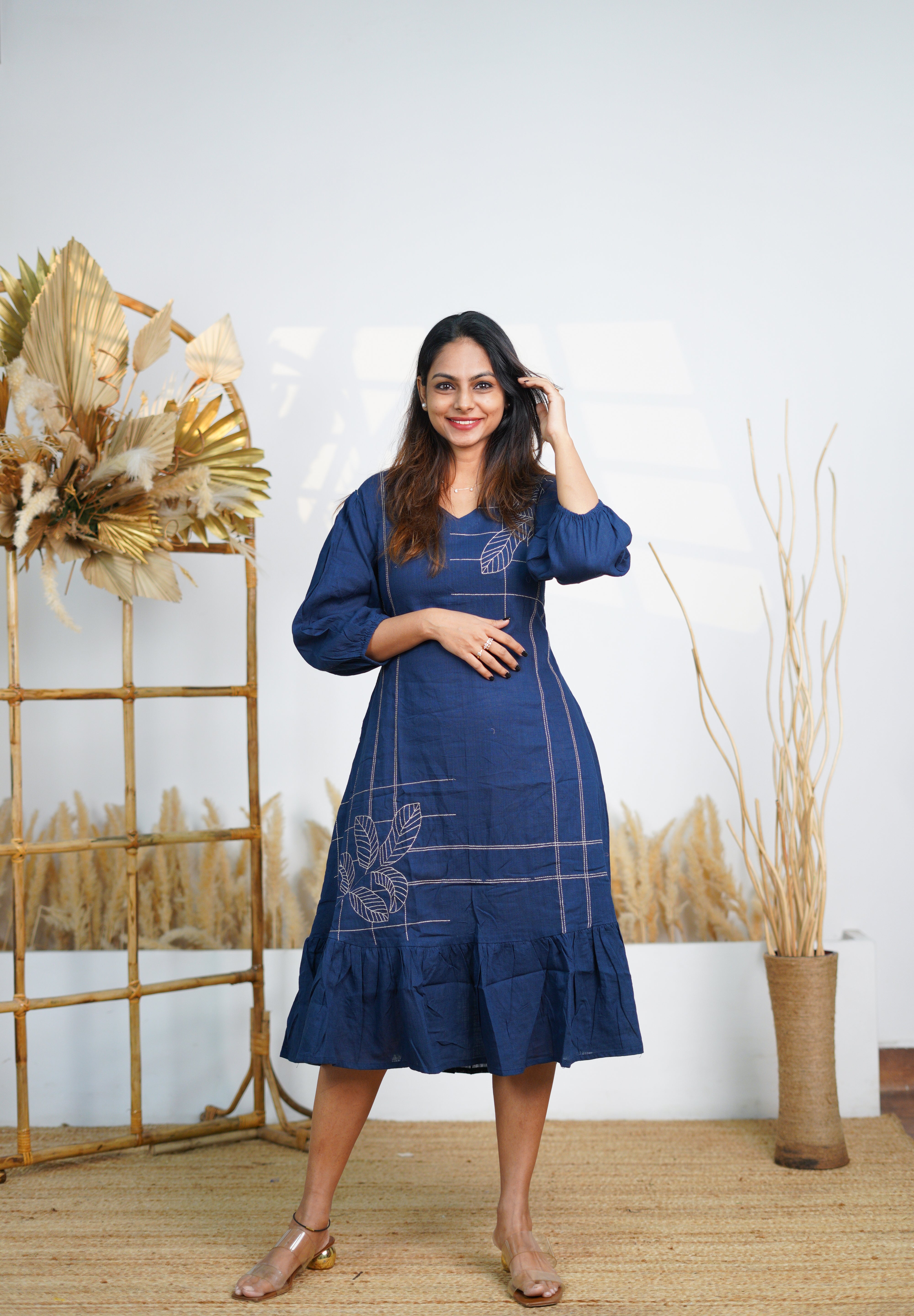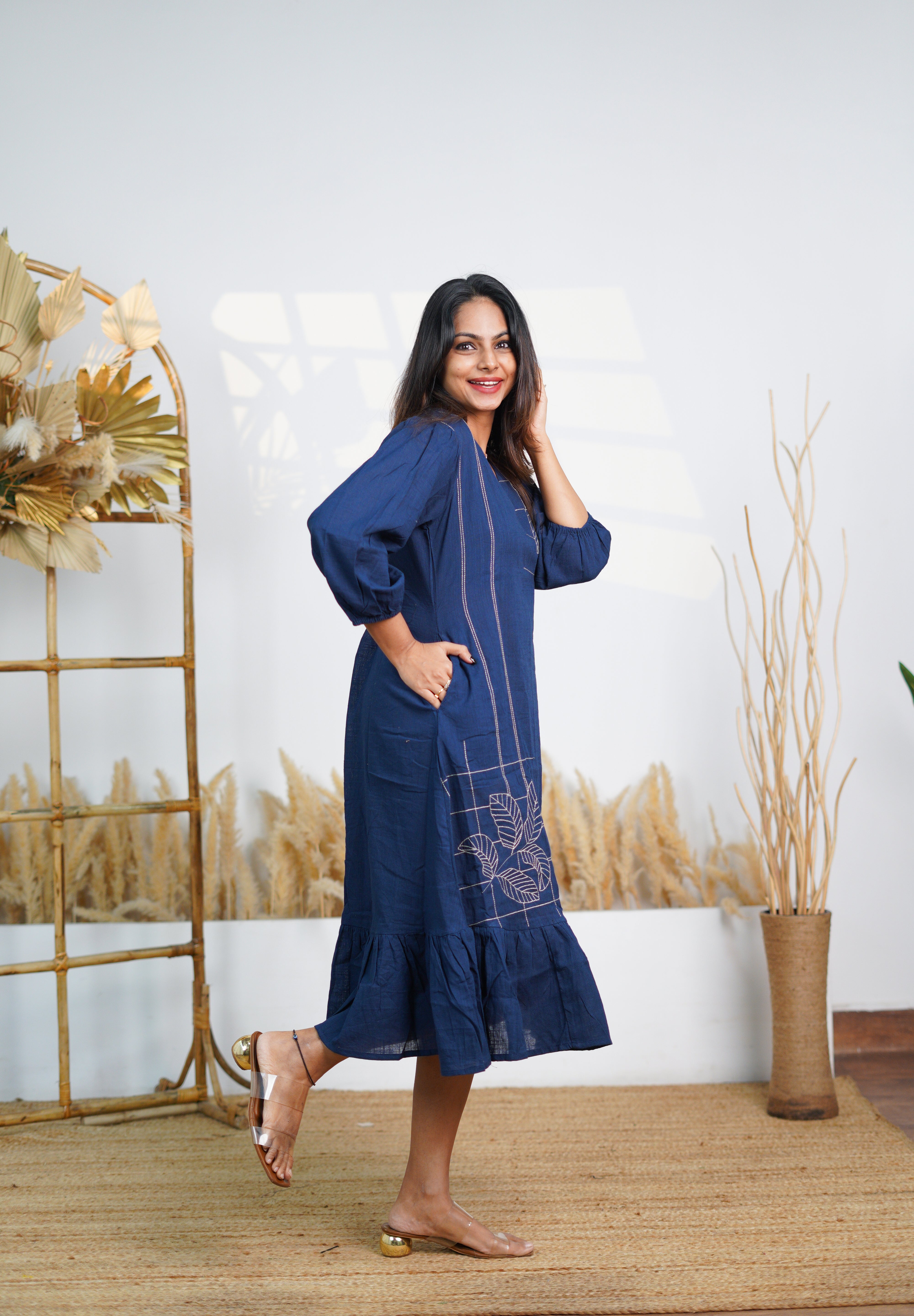 Navy blue cotton midi dress with V neck and balloon sleeves. It has floral thread work along the dress.