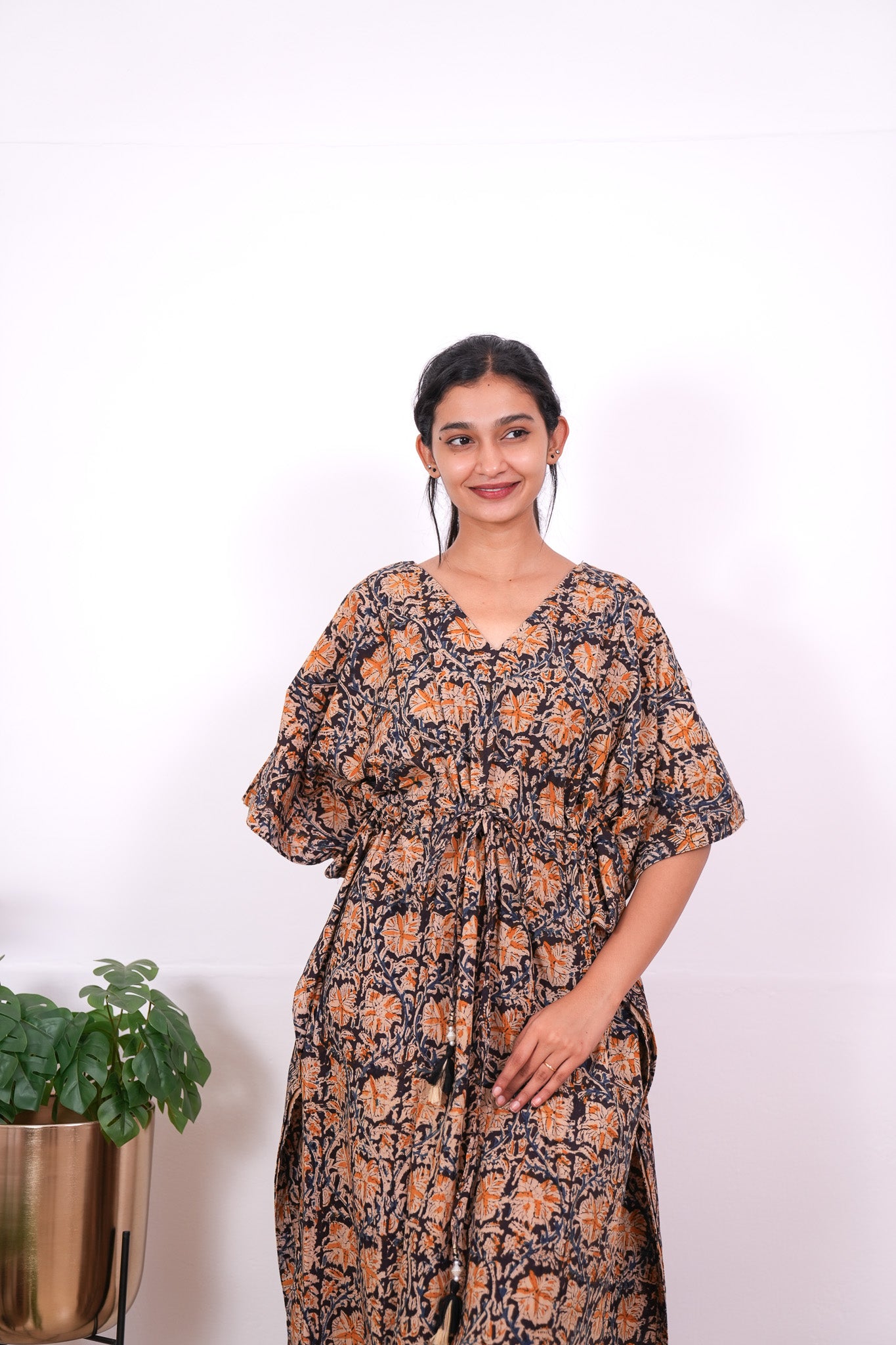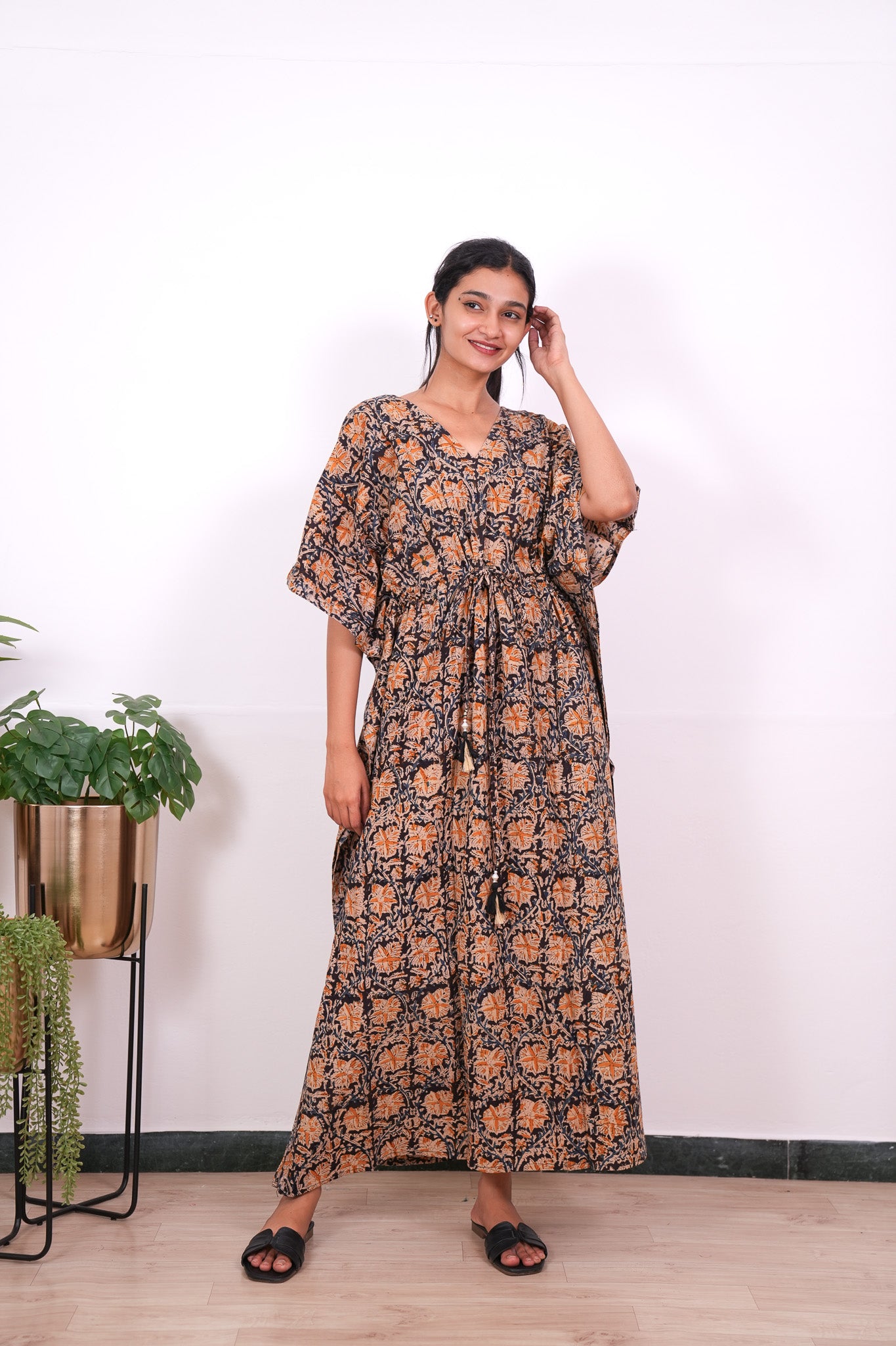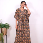 Easy breezy cotton kaftan made for you to feel absolute comfort, elegance and a total stunner at the same time. It comes V neck and tie in the centre with flowy silhouette and floral prints all over. Pure hand block technique used all over the kaftan.