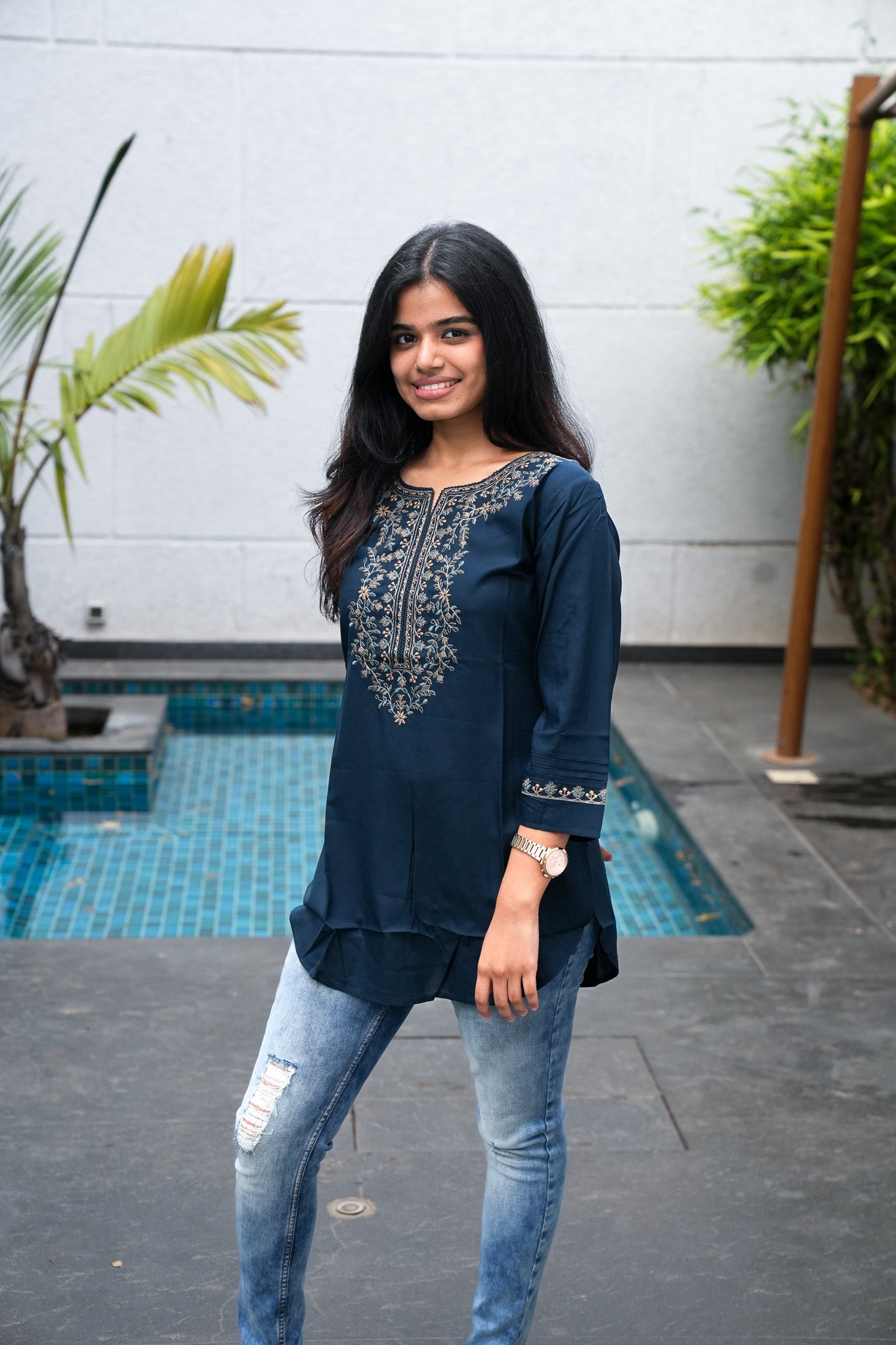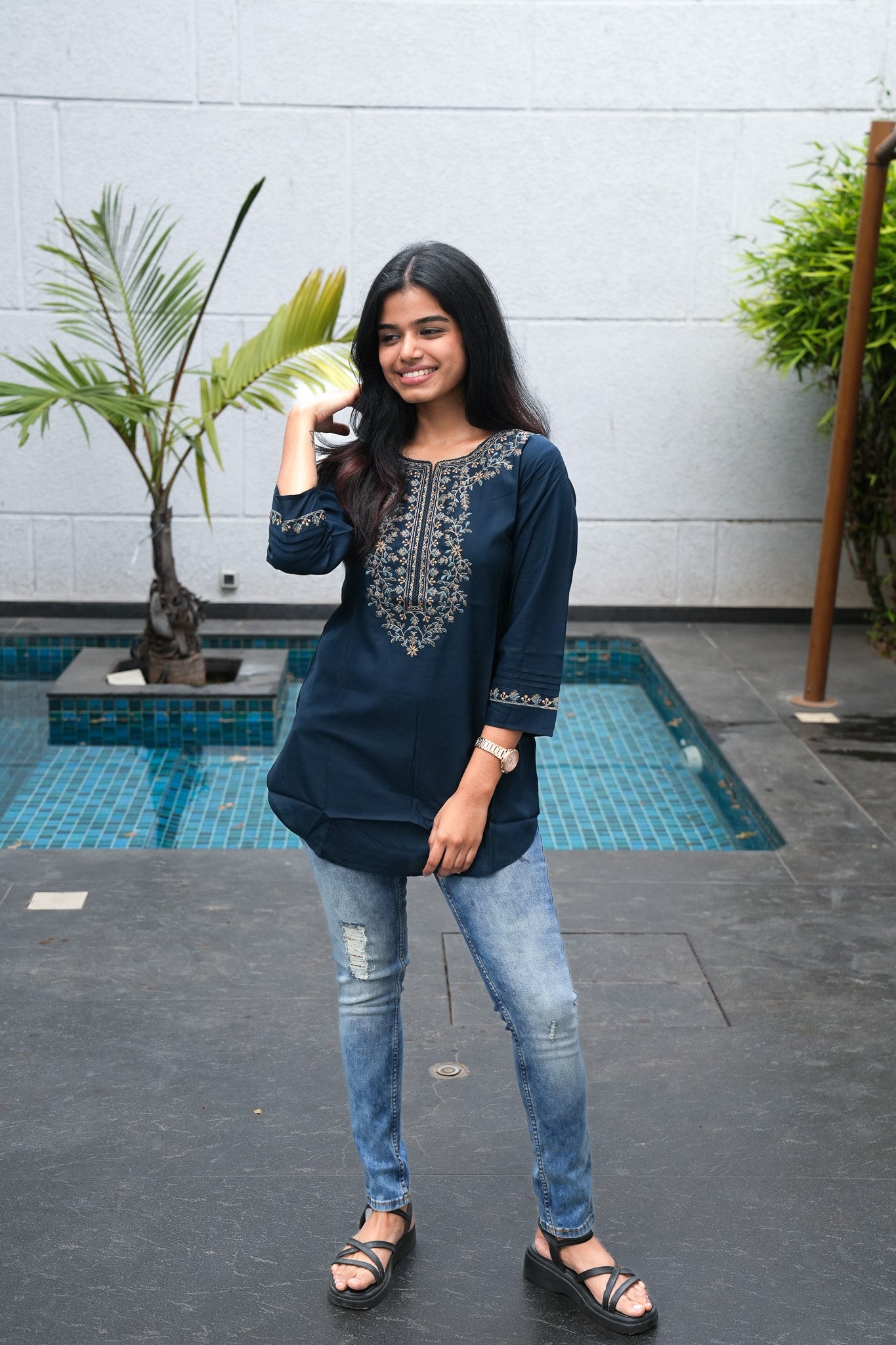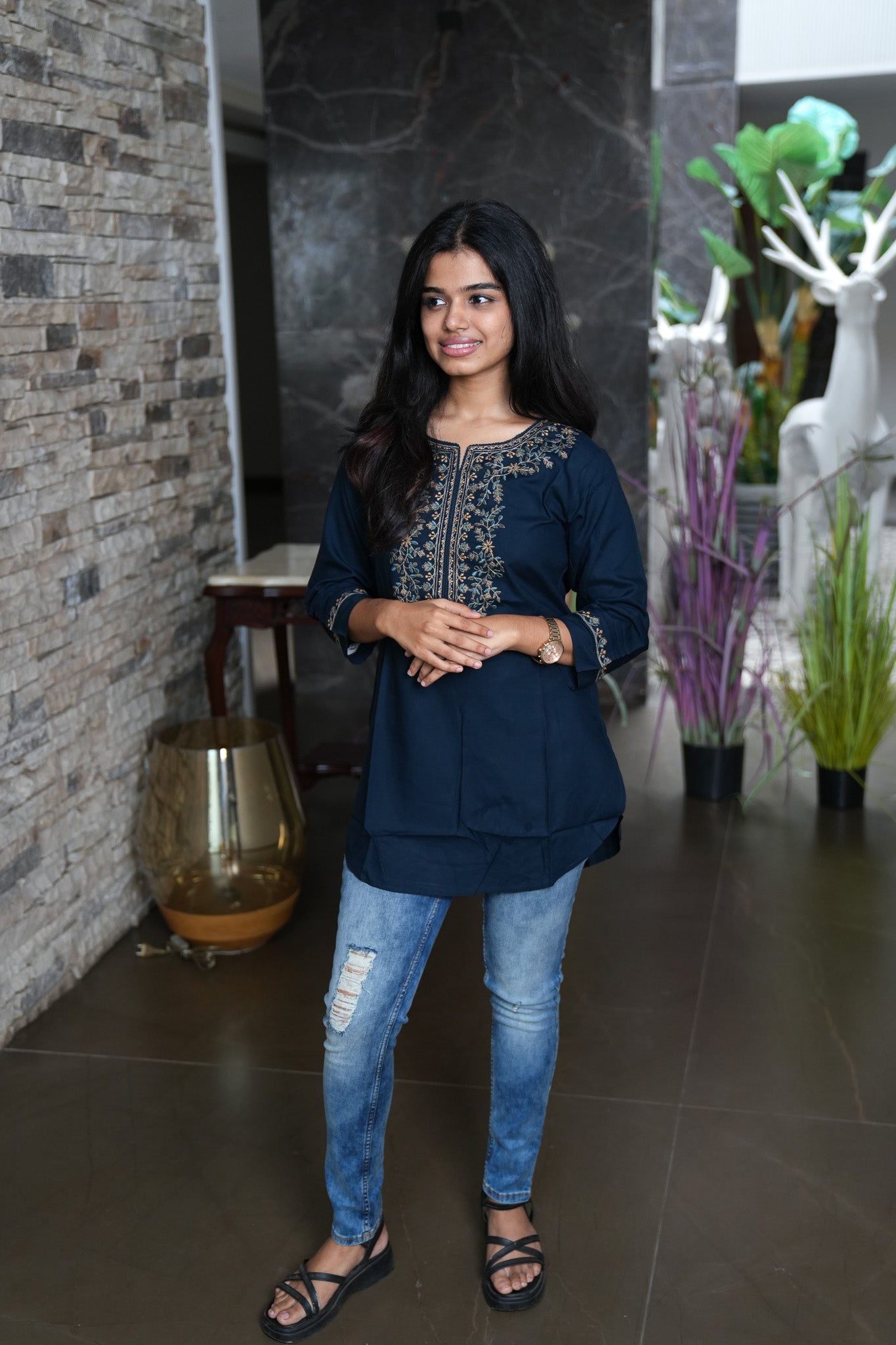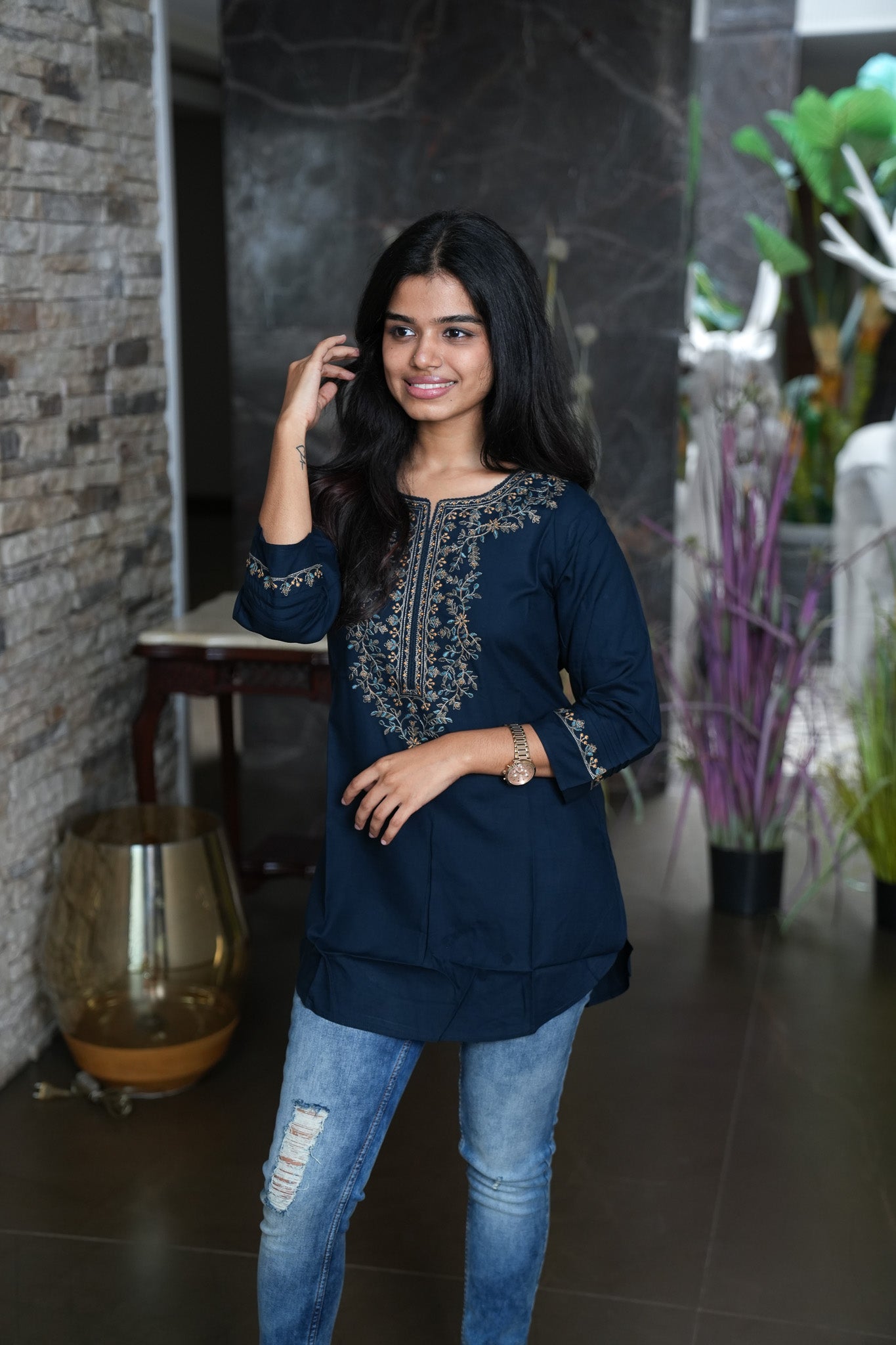 Navy blue hand embroidered cotton top with round neck and elbow length sleeves. These are so chic and comfortable at the same time. Pair it with denim or cotton pants and the look is complete!!