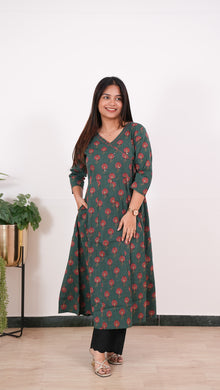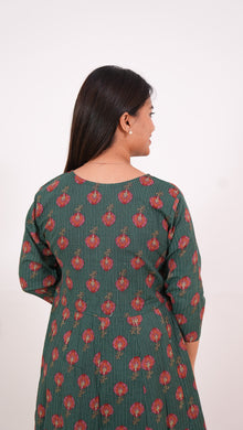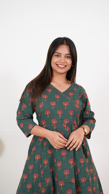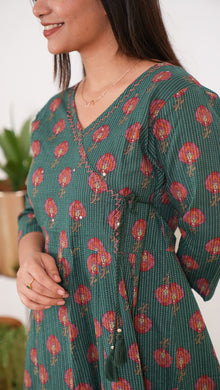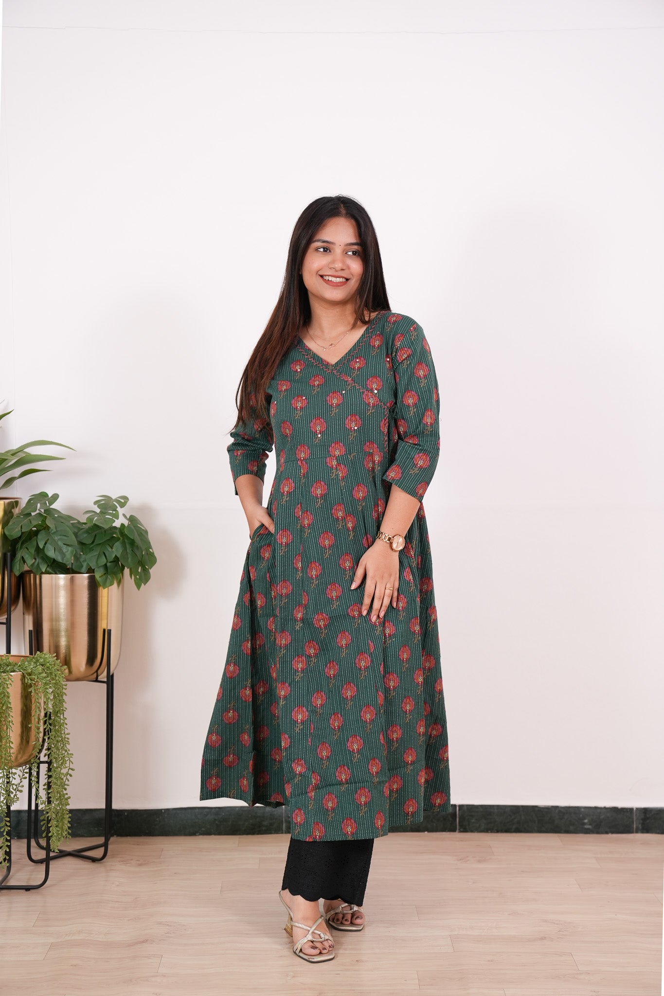 This Katha work angrakha style kurti elevates your everyday style with stylish neck pattern and mirror work in the body. It comes with 3/4th sleeves. It can be paired with cotton pants or can be worn as a midi dress as well.