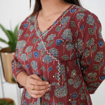 This Katha work angrakha style kurti elevates your everyday style with stylish neck pattern and mirror work in the body. It comes with 3/4th sleeves. It can be paired with cotton pants or can be worn as a midi dress as well.