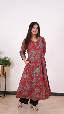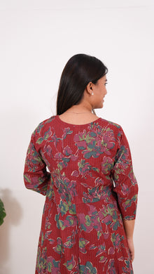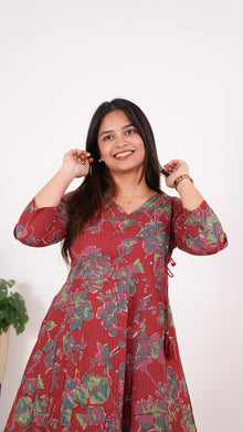 This Katha work angrakha style kurti elevates your everyday style with stylish neck pattern and mirror work in the body. It comes with 3/4th sleeves. It can be paired with cotton pants or can be worn as a midi dress as well.