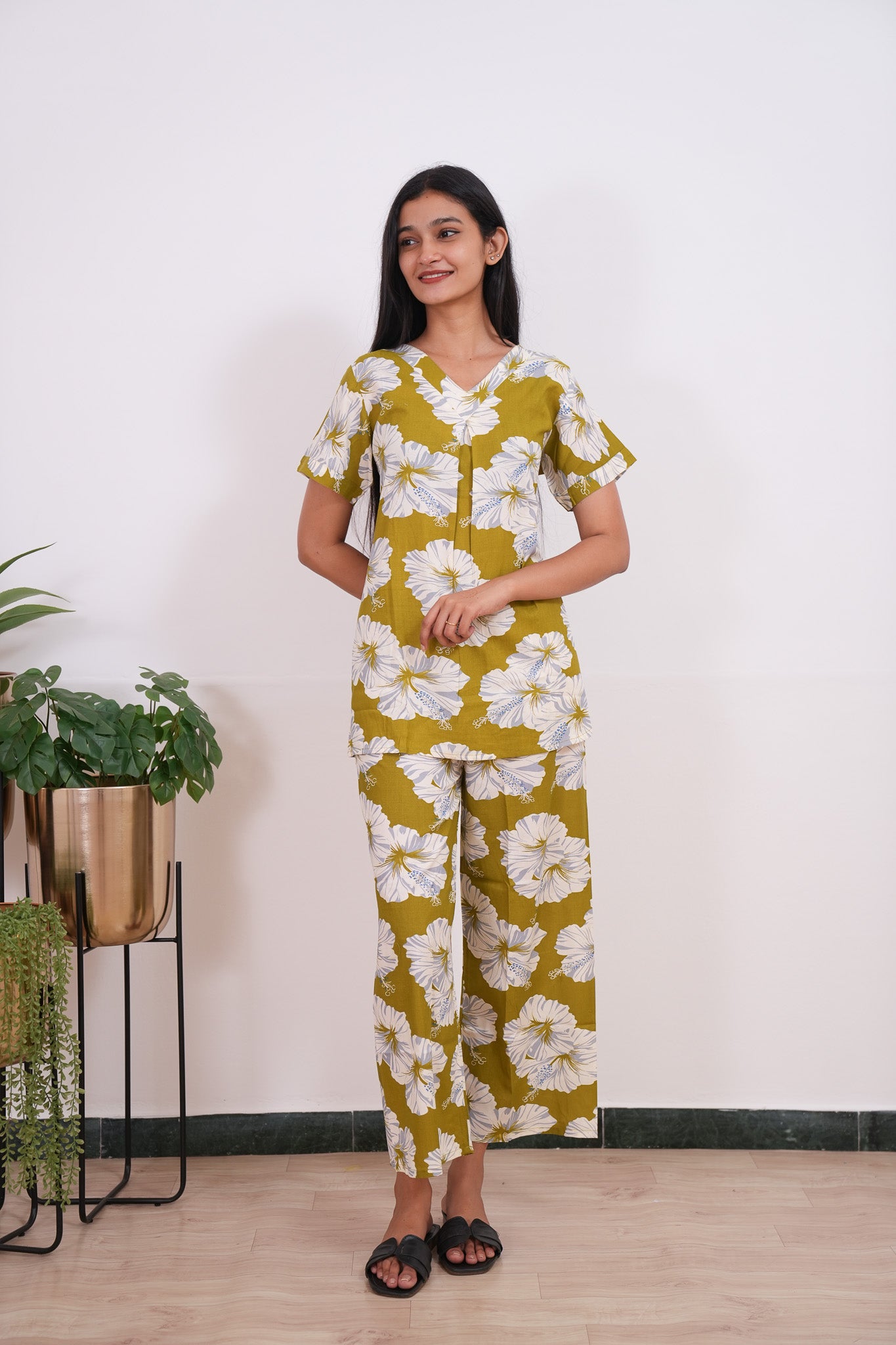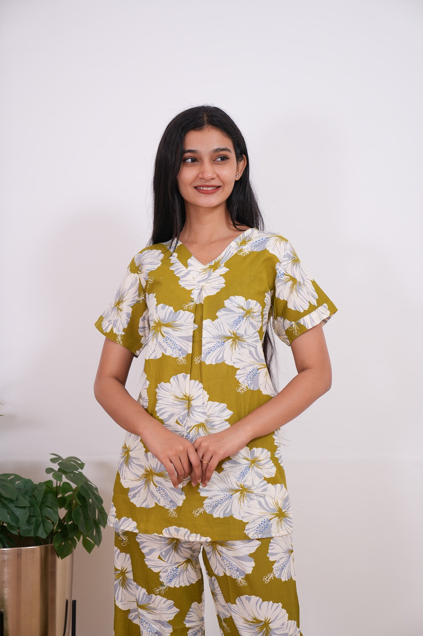 These Co-ords are so cozy, comfortable and chic making it perfect to relax at home or sleep in them. The top has a V neck with short length sleeves. Pant comes with elastic and it has a straight fit.