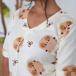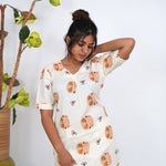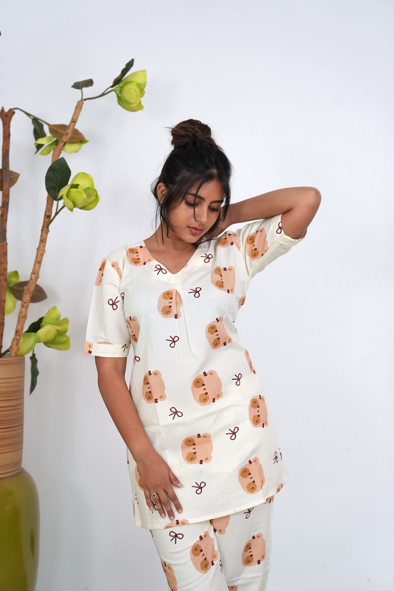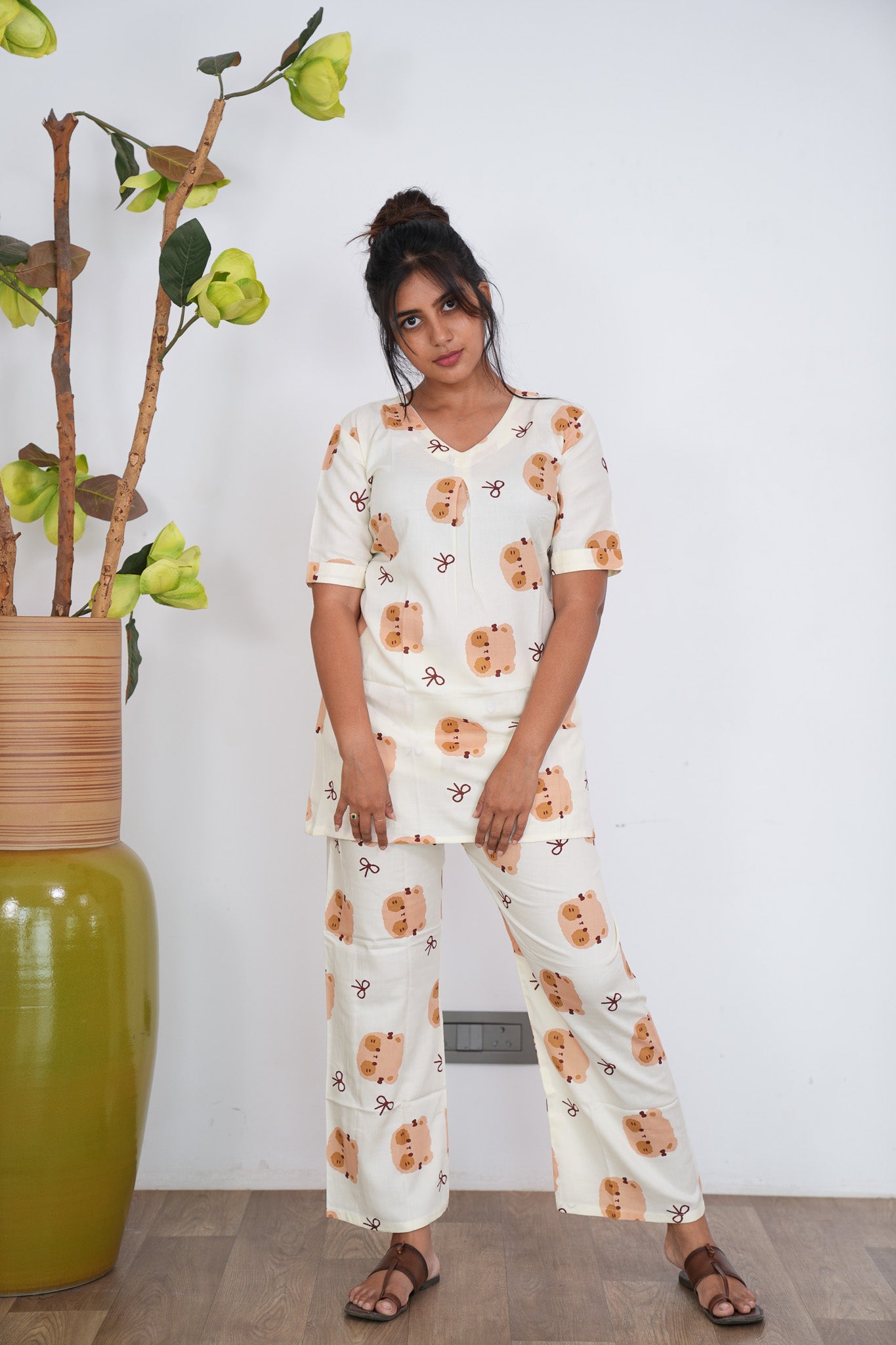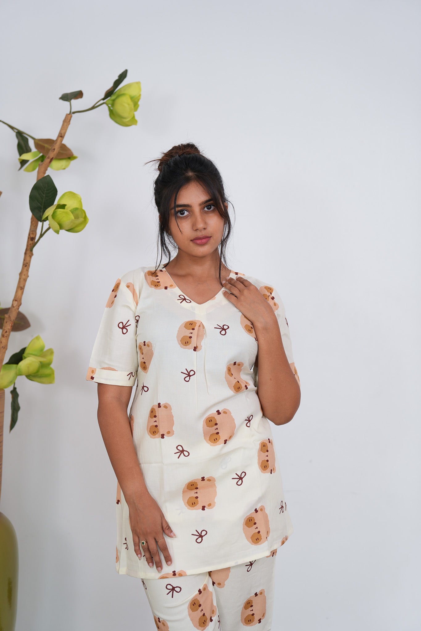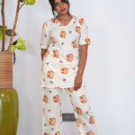 These Co-ords are so cozy, comfortable and chic making it perfect to relax at home or sleep in them. The top has a V neck with short length sleeves. Pant comes with elastic and it has a straight fit.