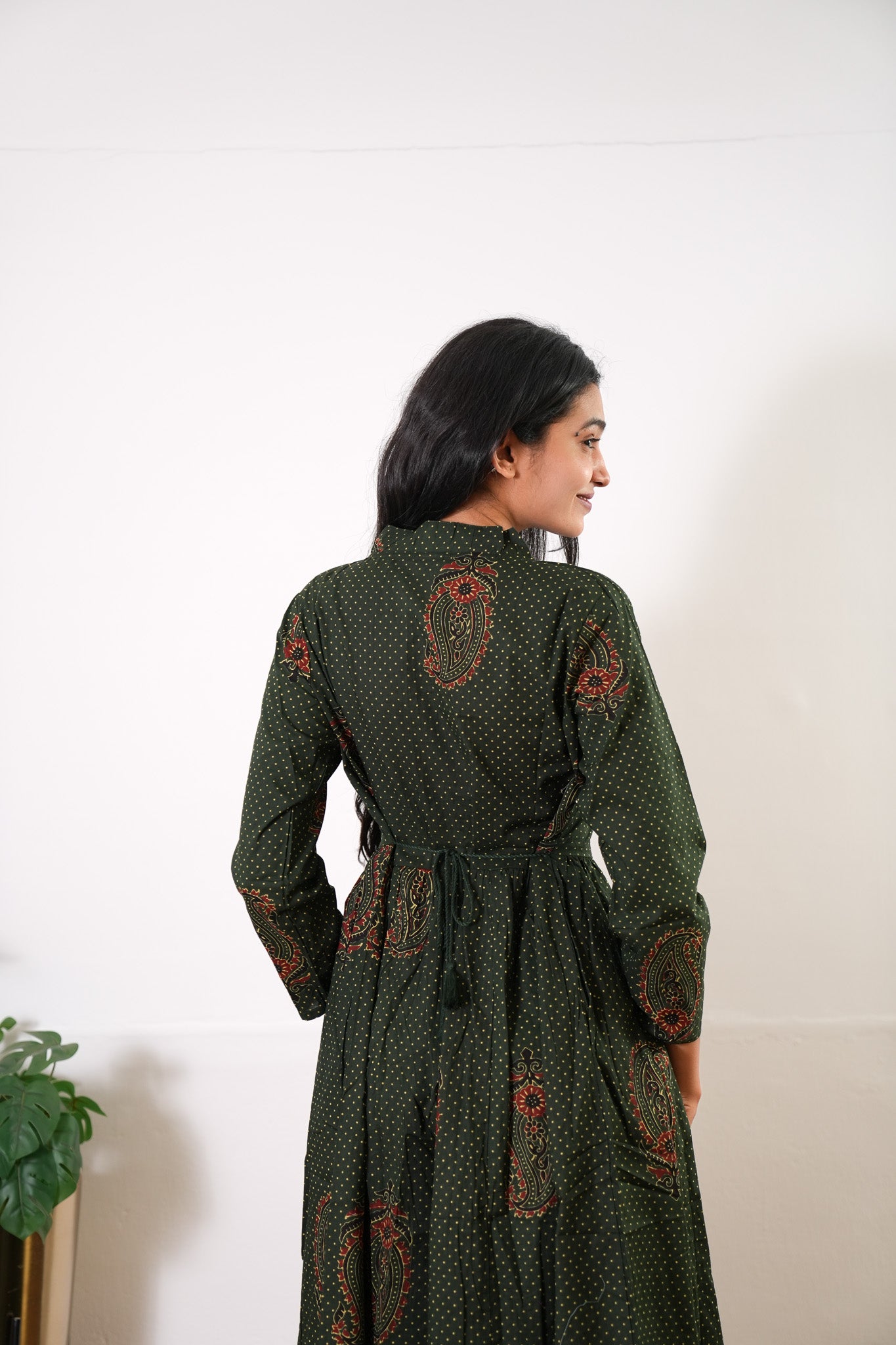 Forest green cotton anarkali kurta with trendy prints all over the kurta .It has a tie at the back