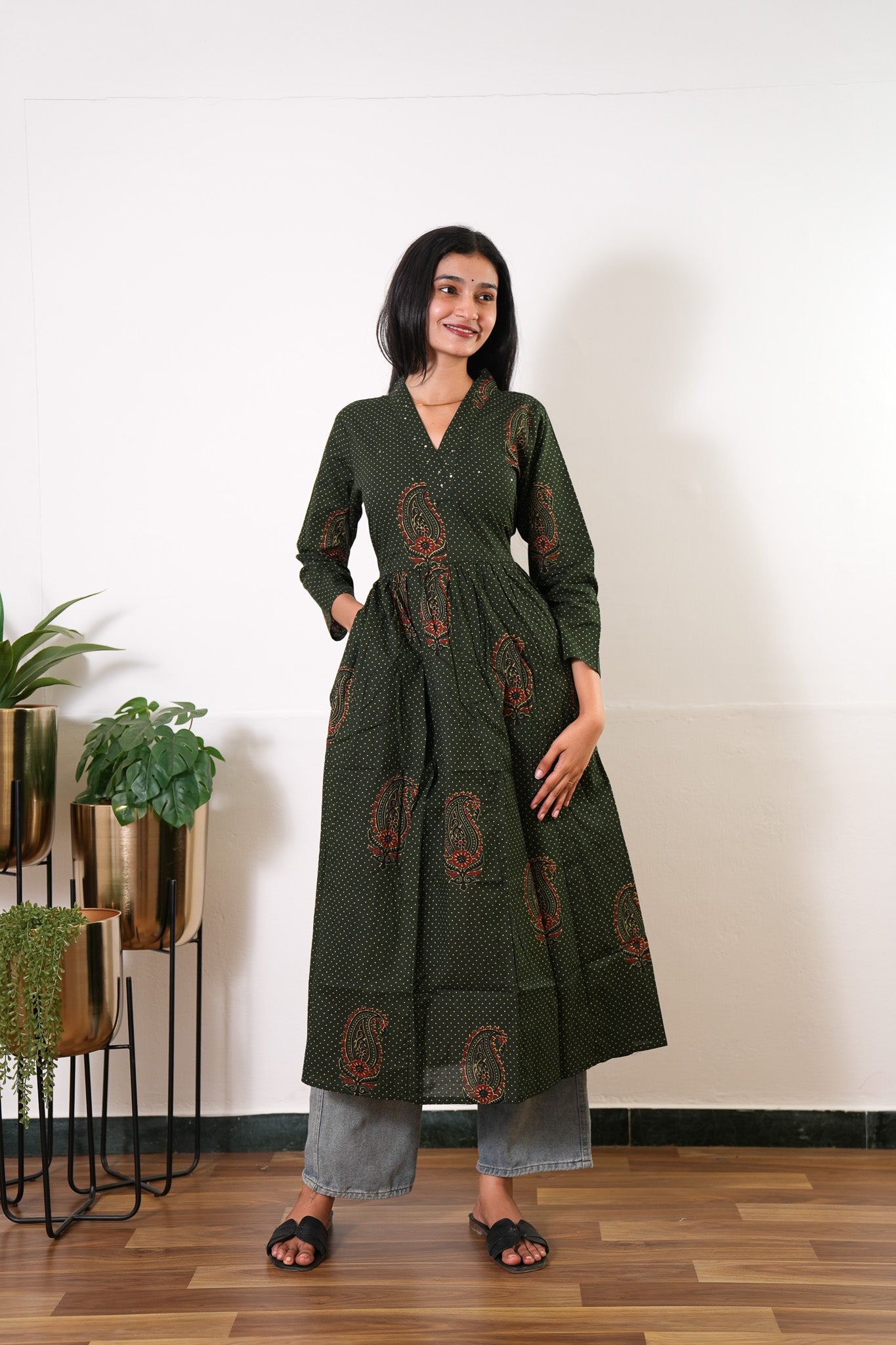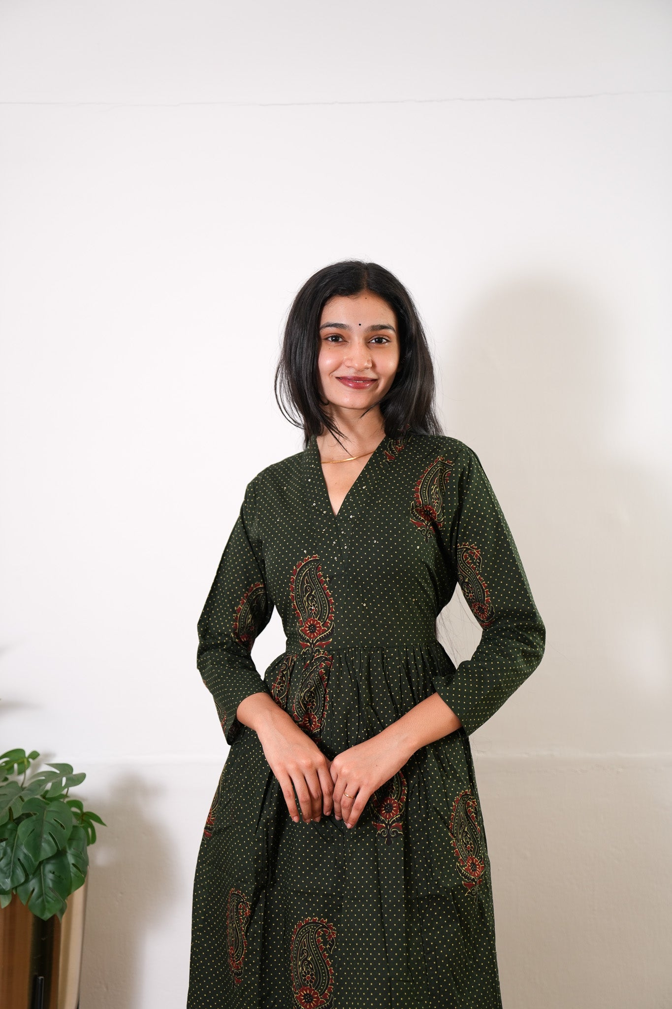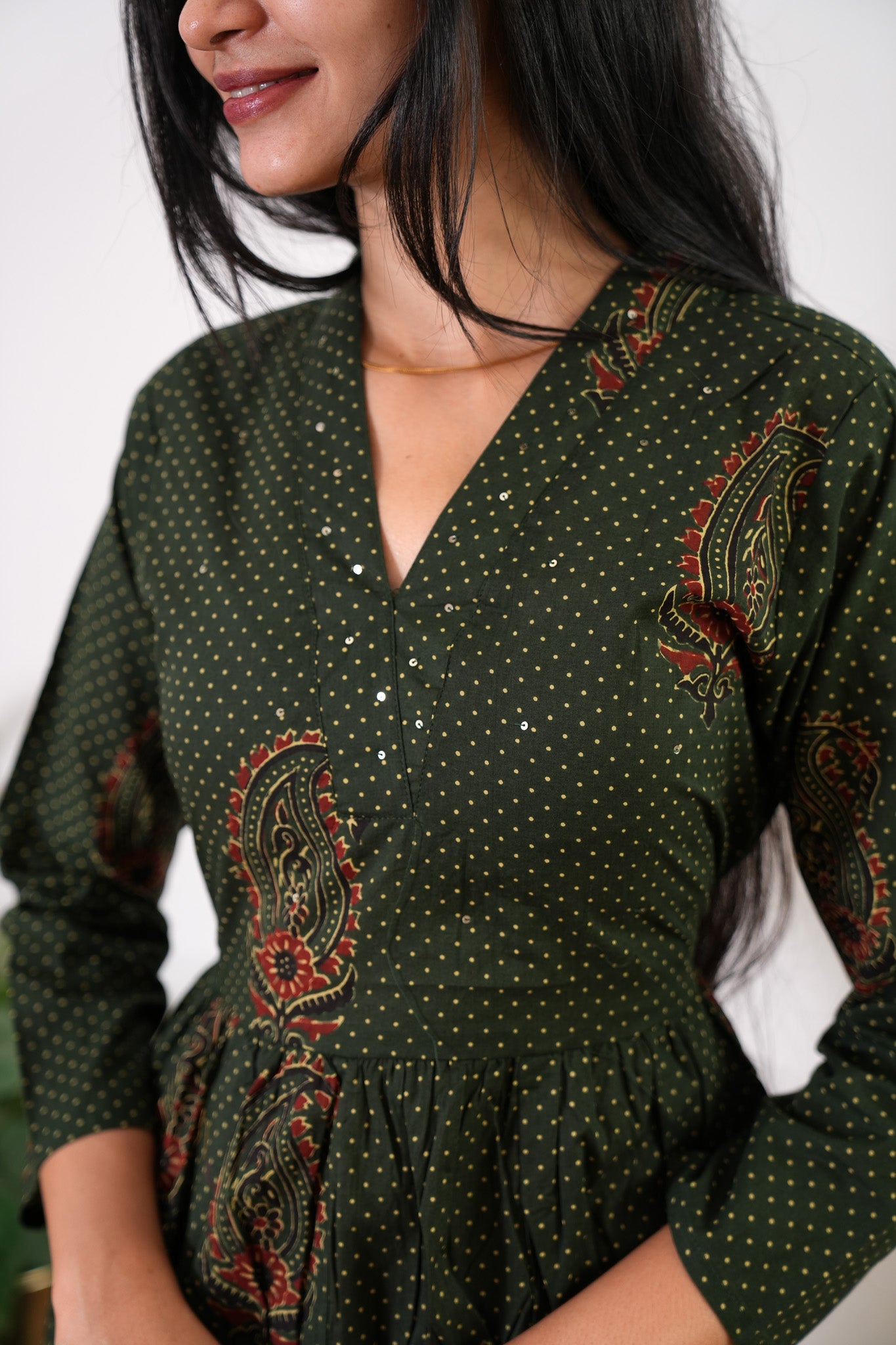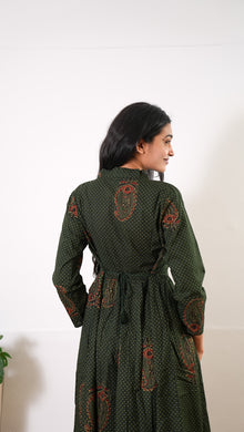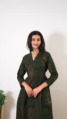 Forest green v neck anarkali cotton kurta