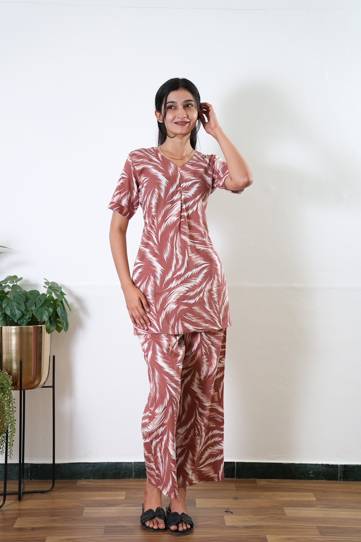 These Co-ords are so cozy, comfortable and chic making it perfect to relax at home or sleep in them. The top has a V neck with short length sleeves. Pant comes with elastic and it has a straight fit. Please order one size larger for a comfortable fit.