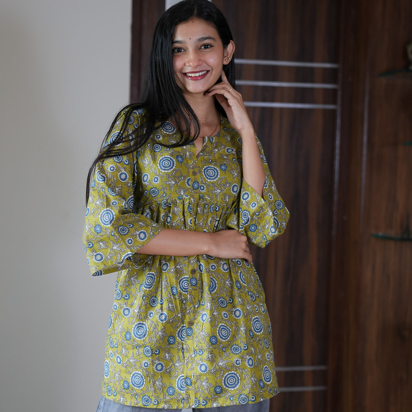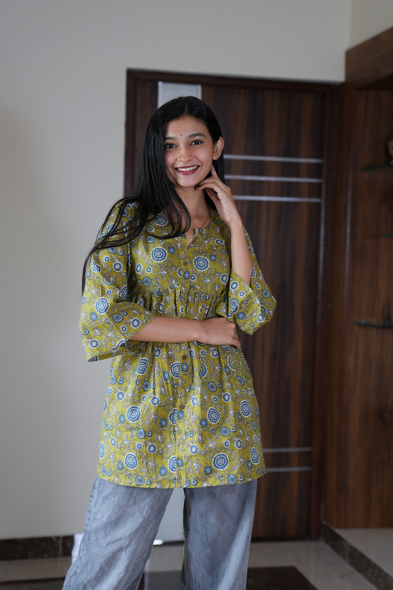 This short kurti is pure cotton, light weight and breathable making it apt for this summer. It can be paired with jeans, cotton pants or even a skirt.