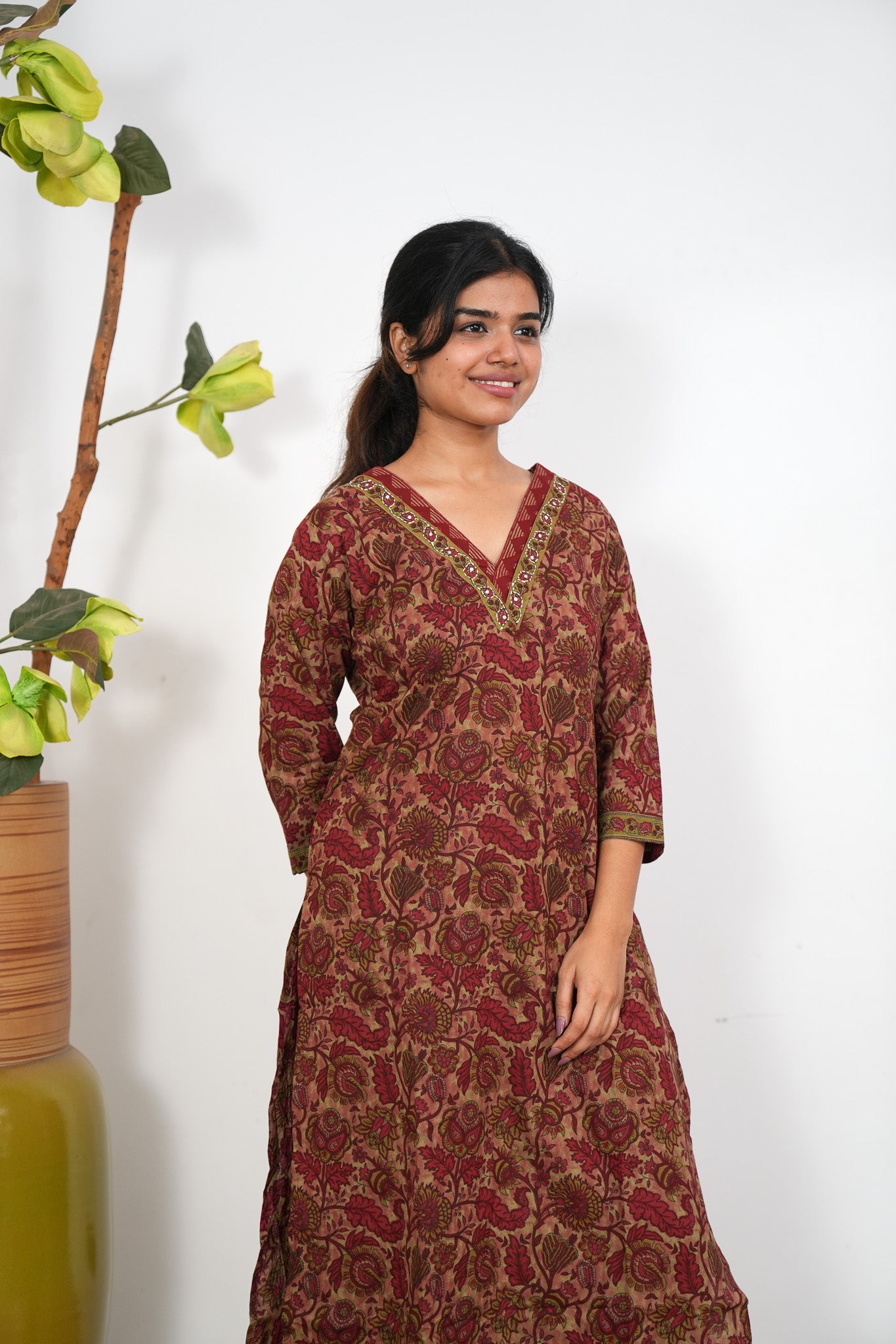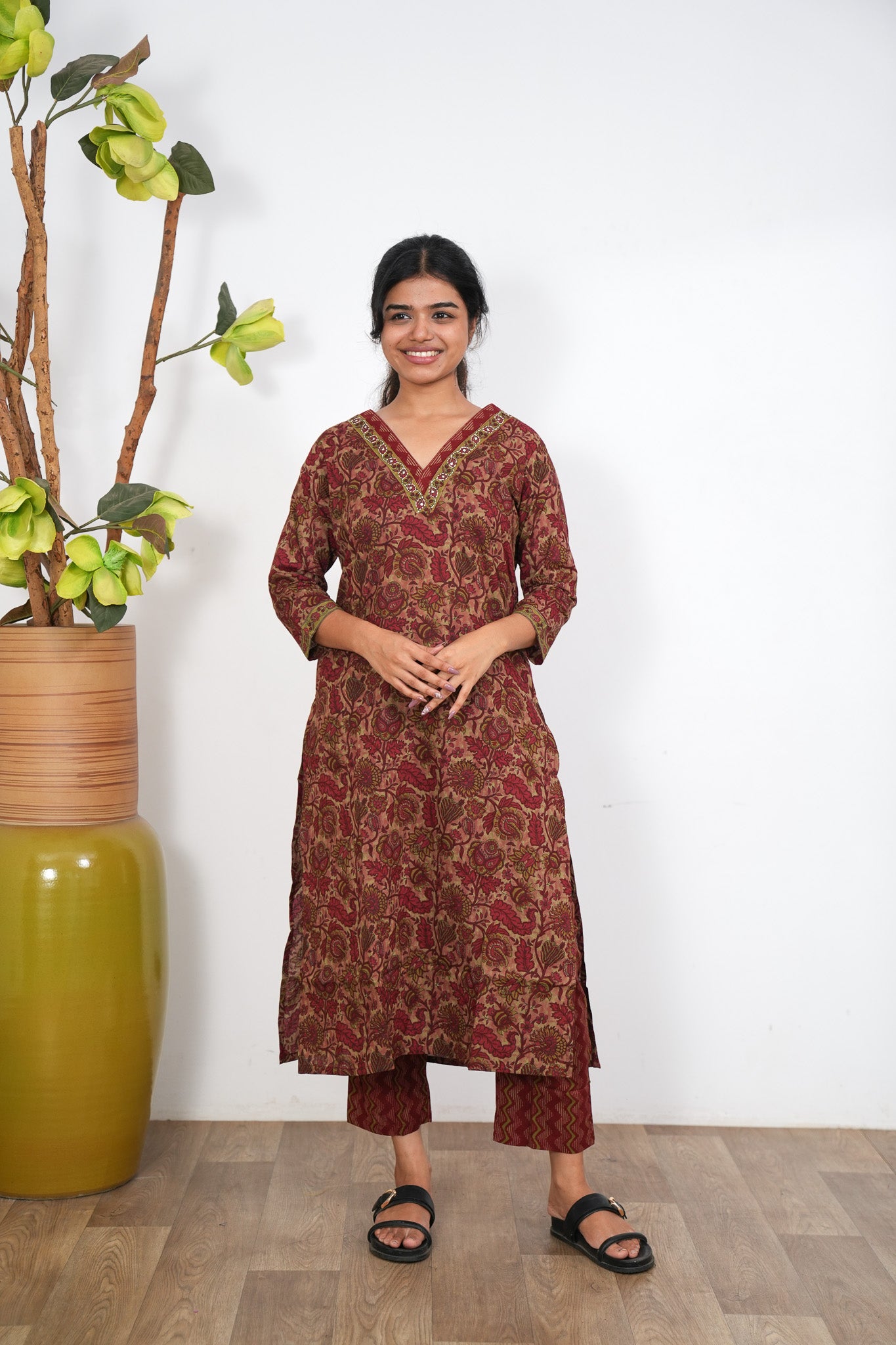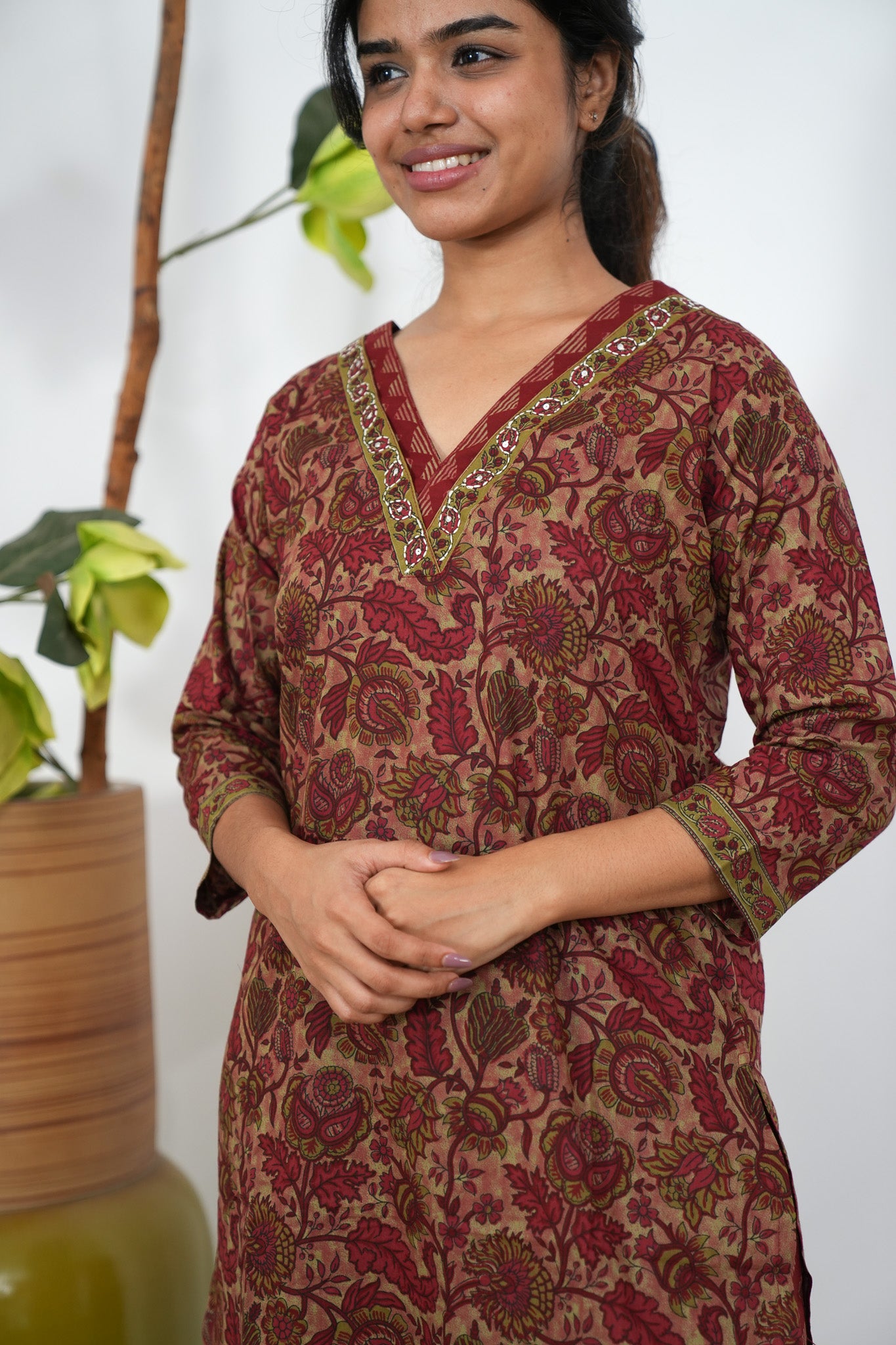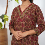 Maroon floral cotton co-ords set which can be paired together or with jeans for a easy breezy summer outfit. It comes with round neck and elbow length sleeves.