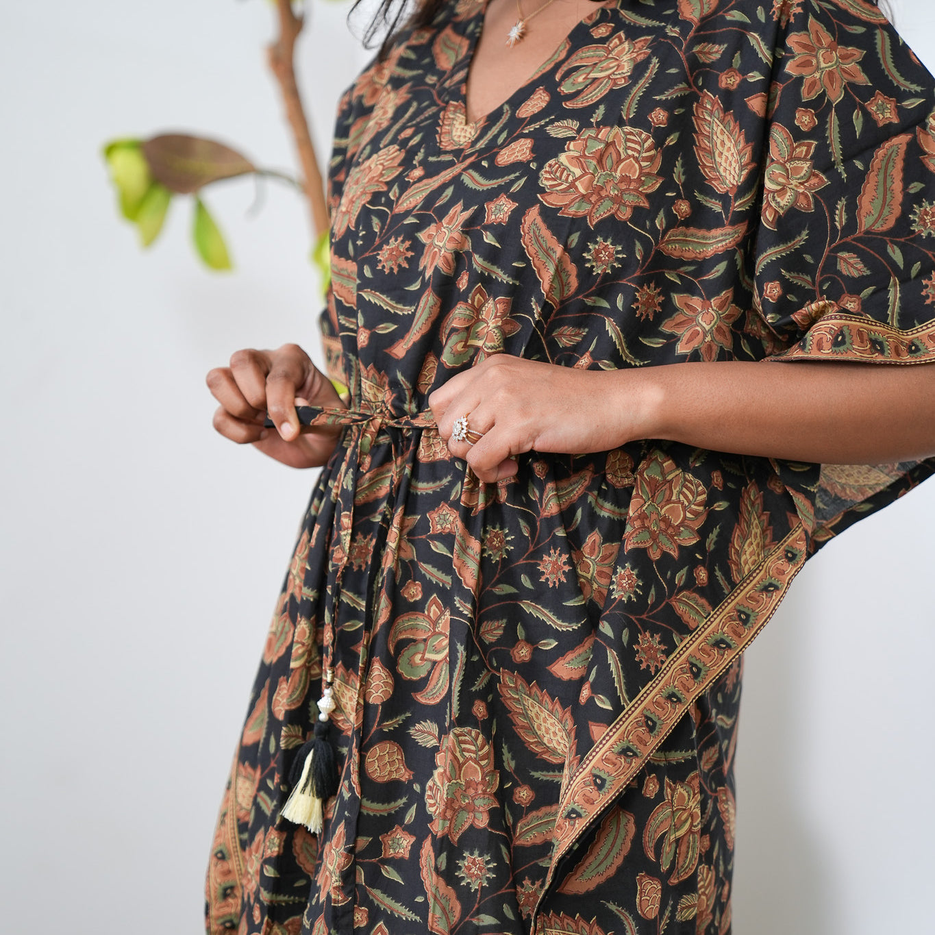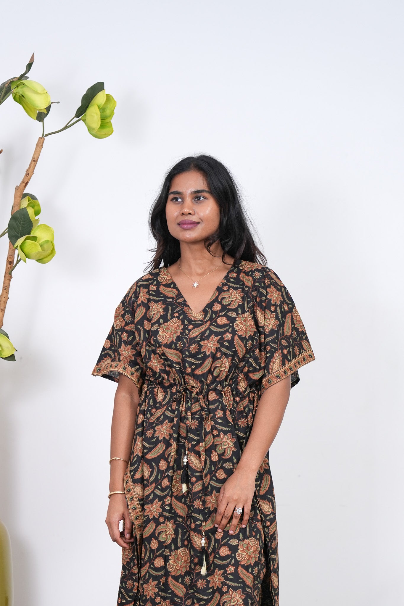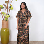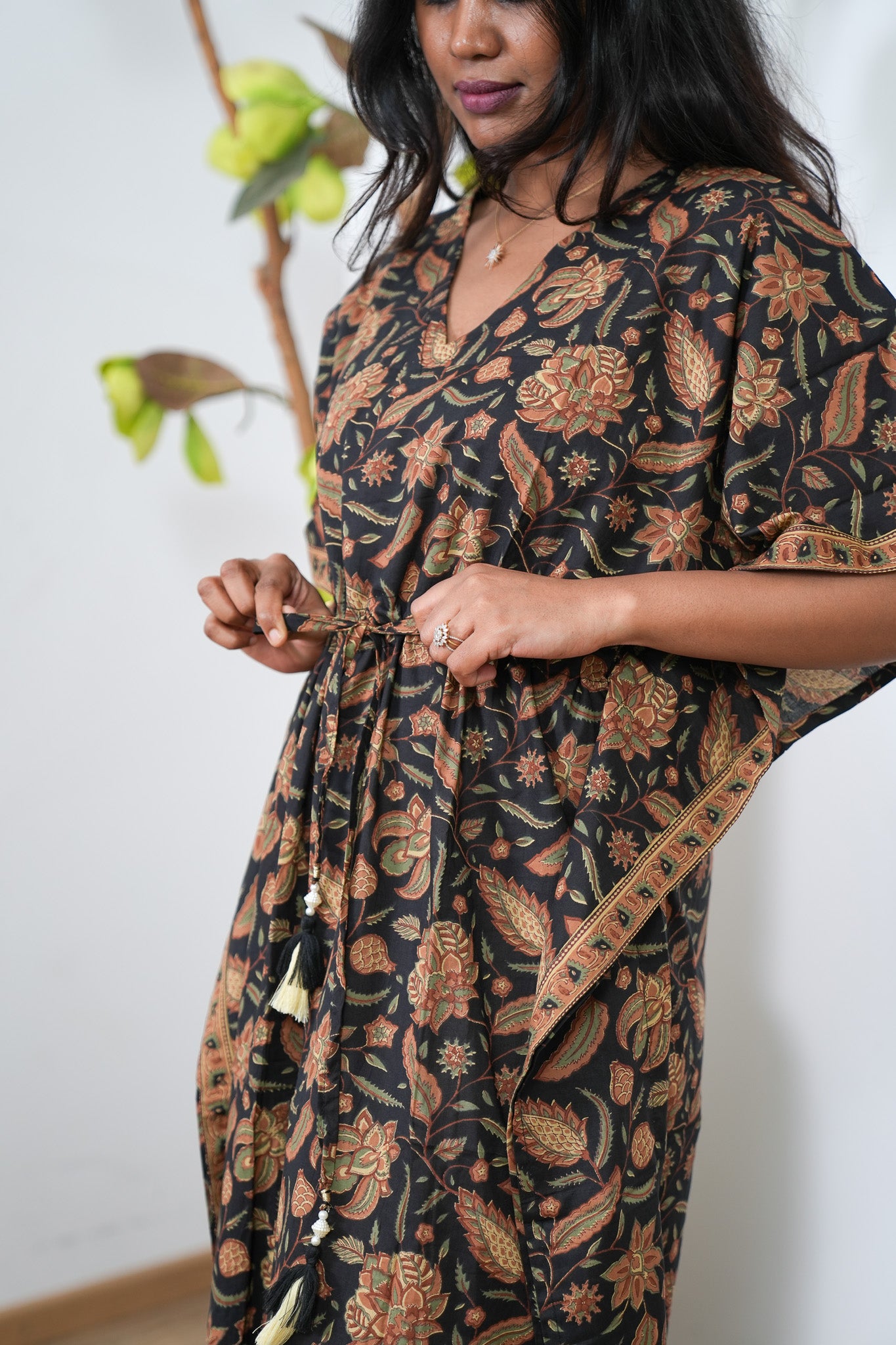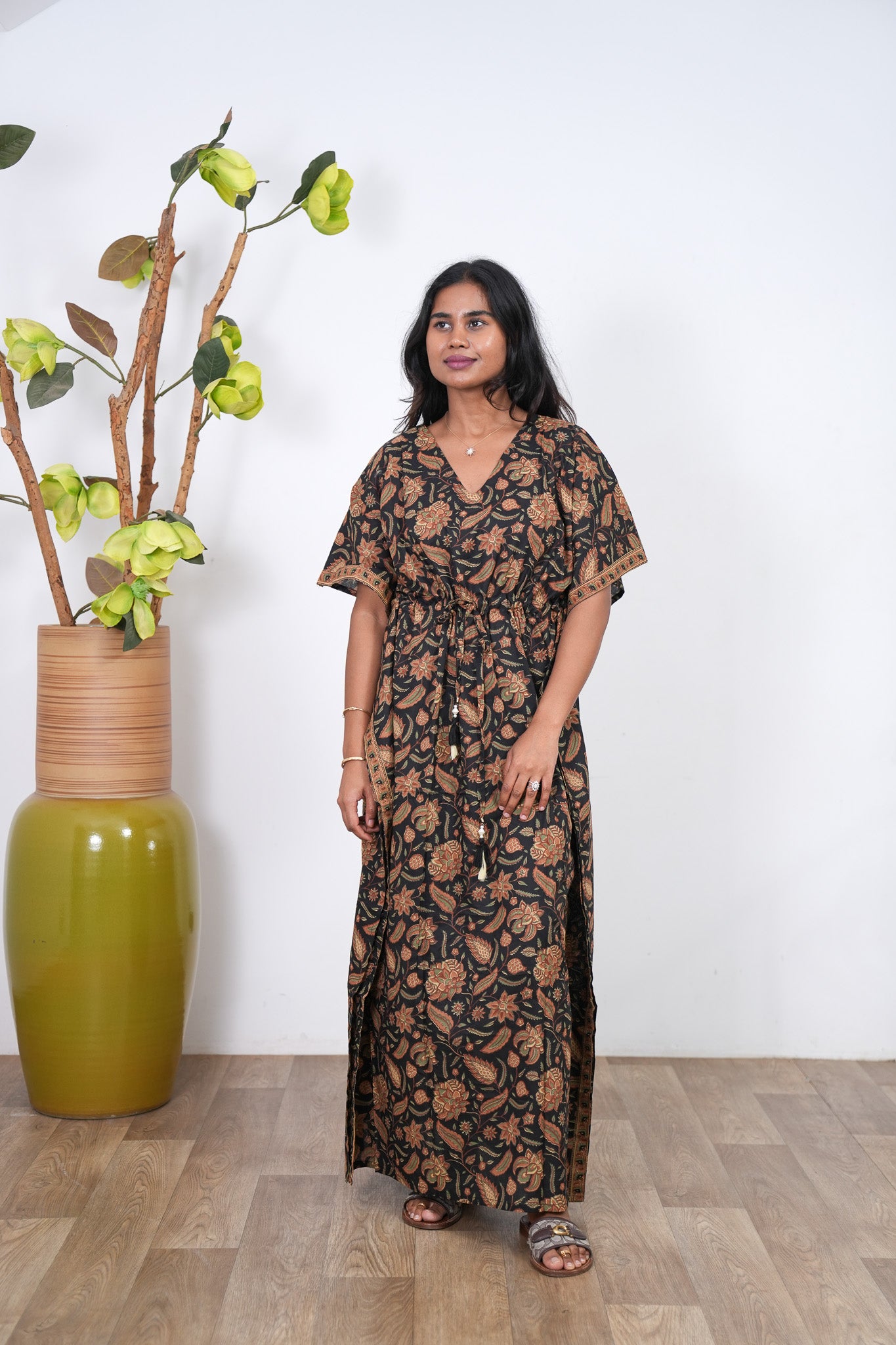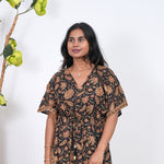 Easy breezy cotton kaftan made for you to feel absolute comfort, elegance and a total stunner at the same time. It comes V neck and tie in the centre with flowy silhouette and floral prints all over.