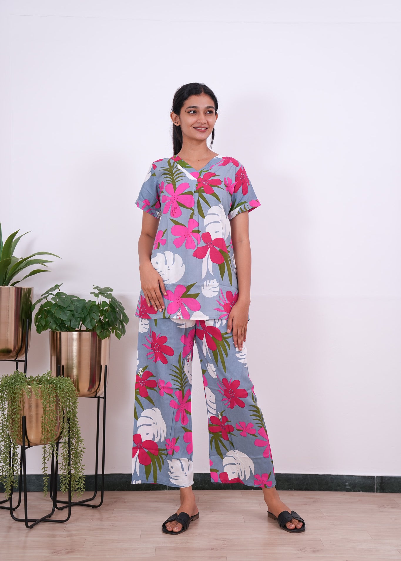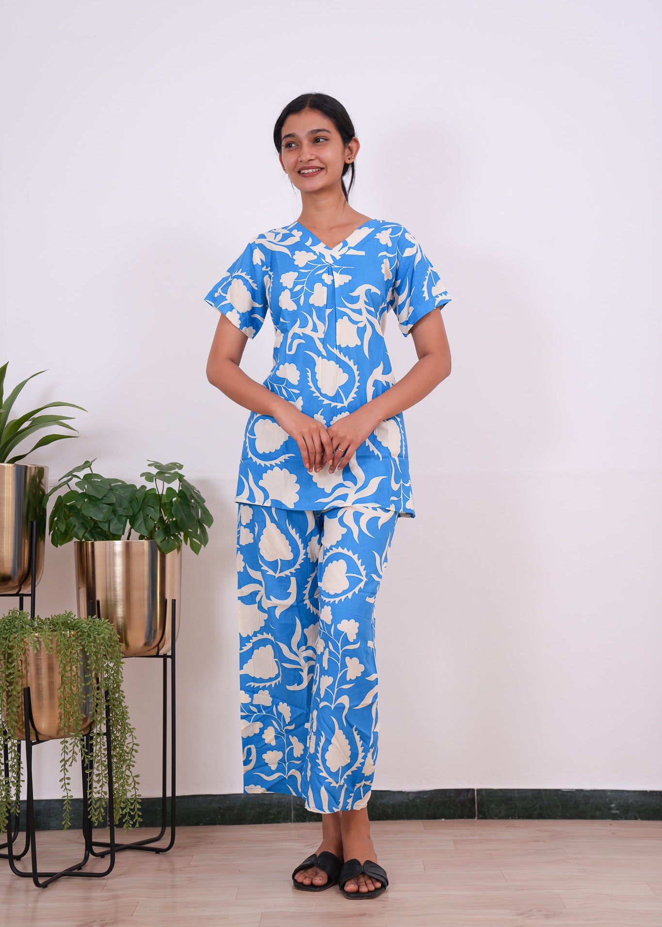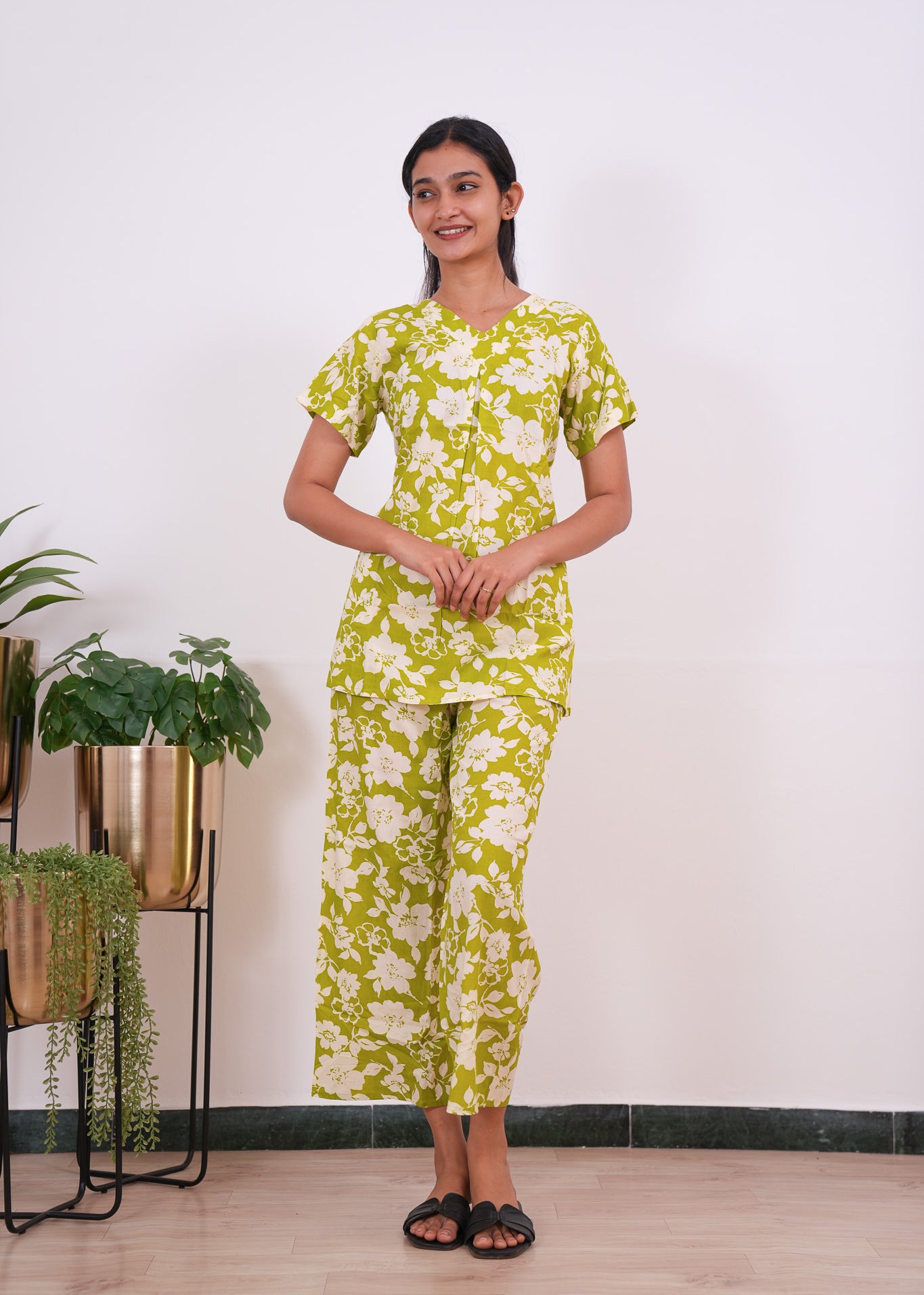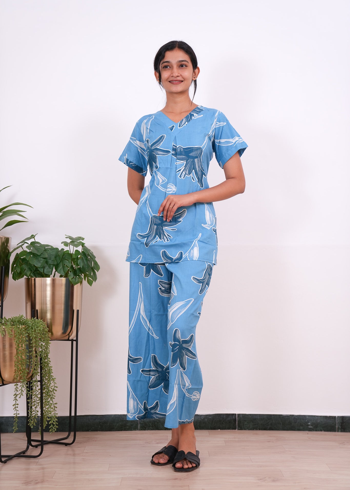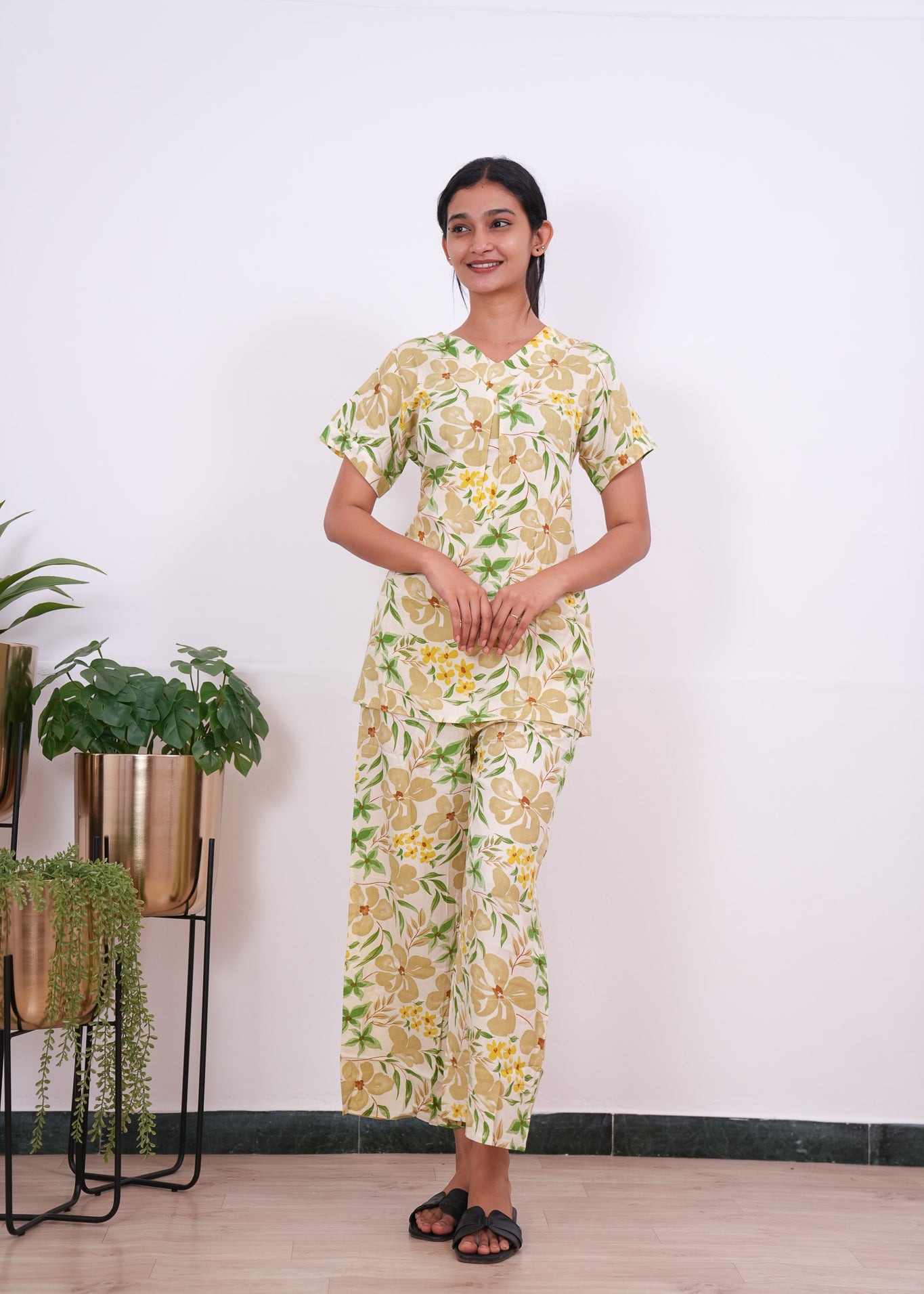 The night suit has a standard collar with openable buttons running down. It comes with matching elastic waisted pants