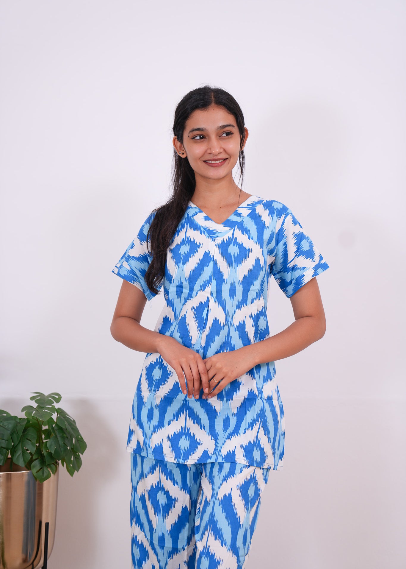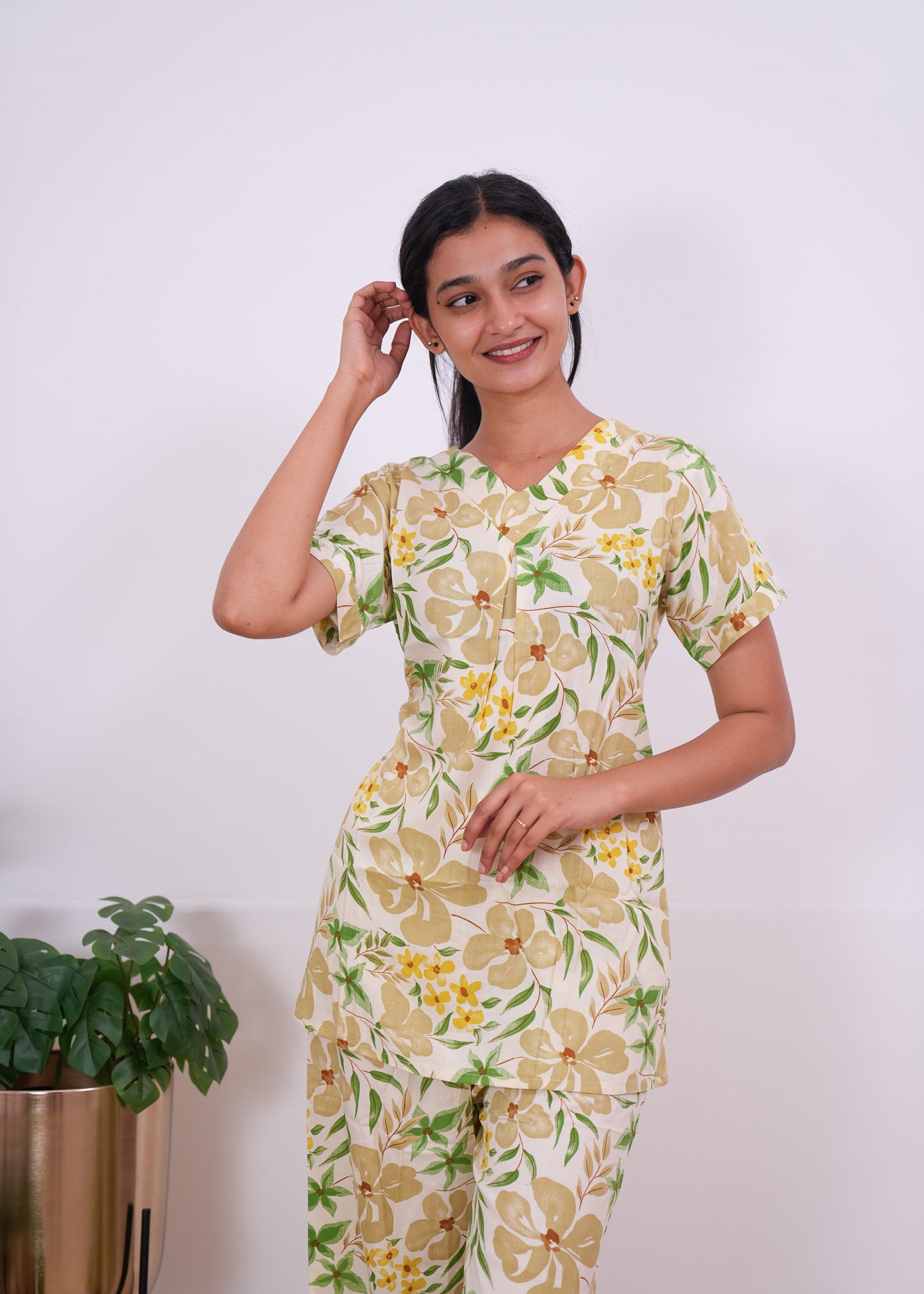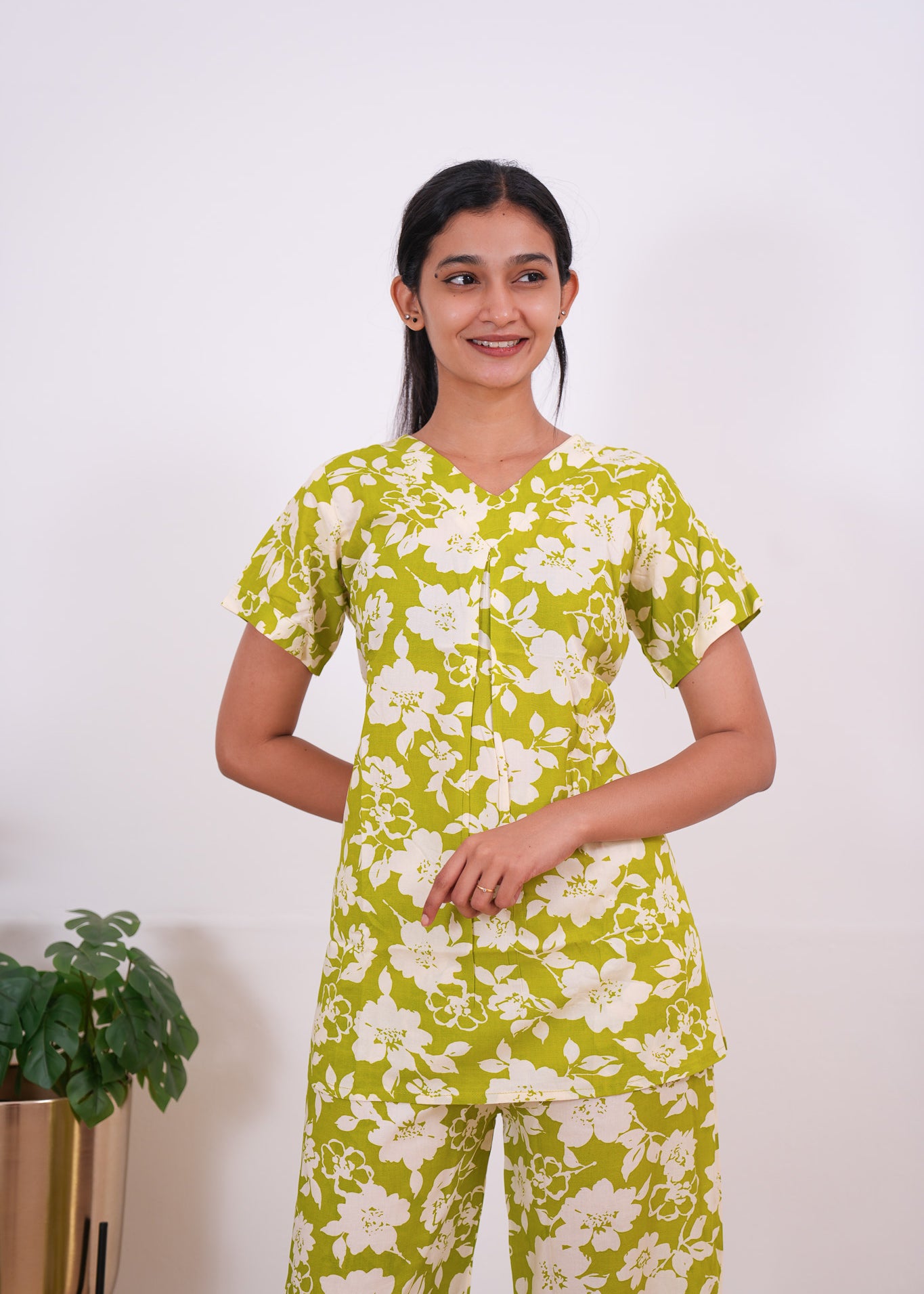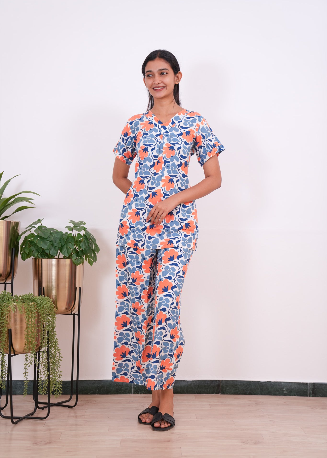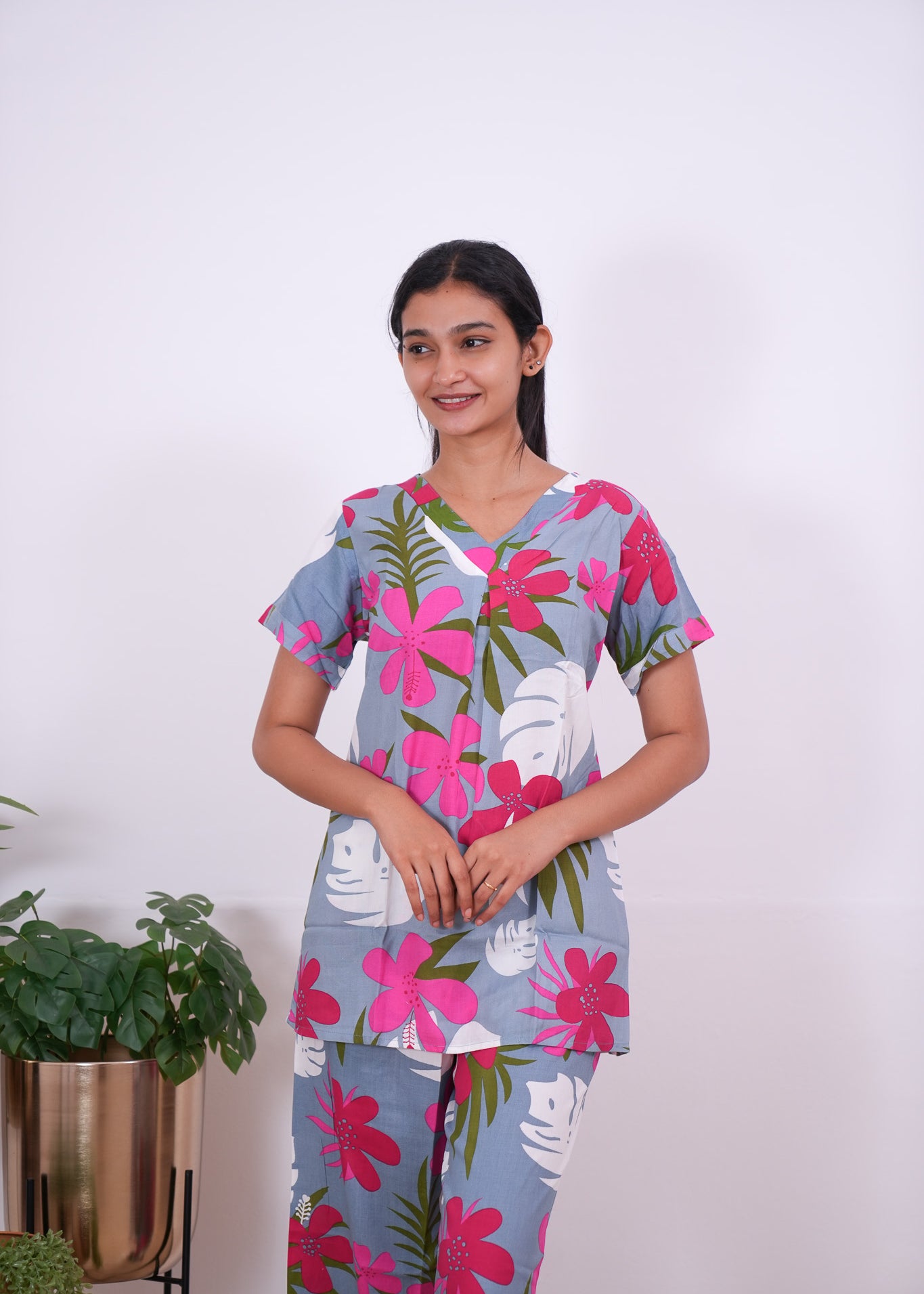 The night suit has a standard collar with openable buttons running down. It comes with matching elastic waisted pants