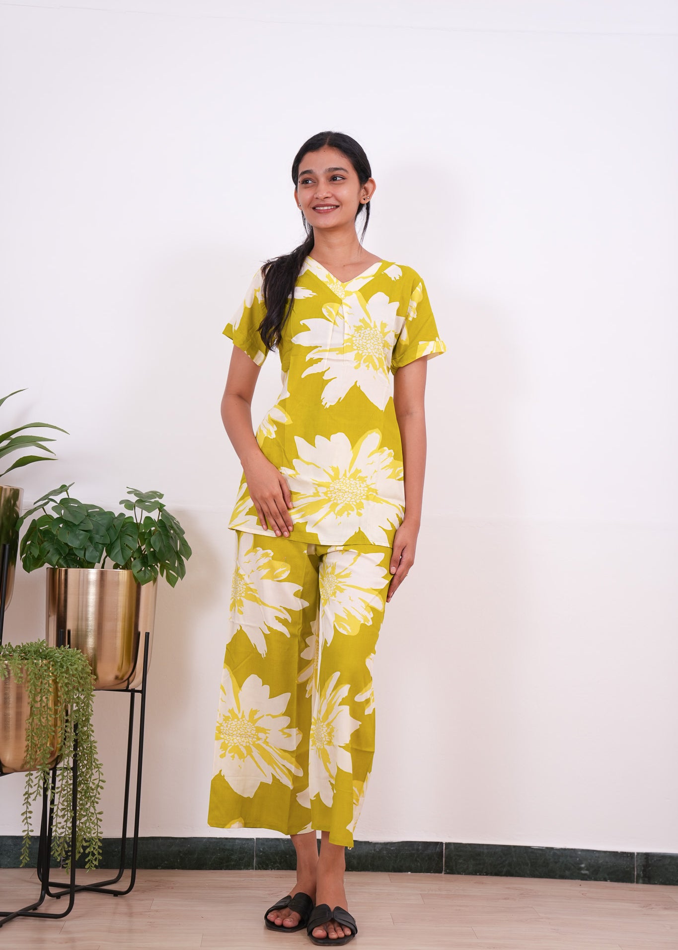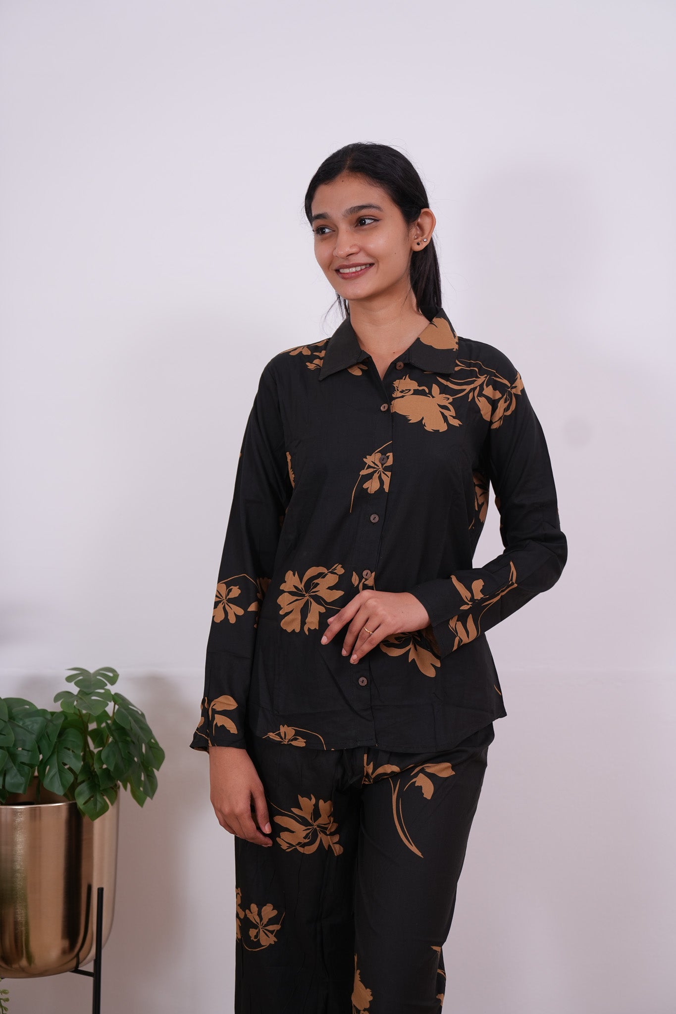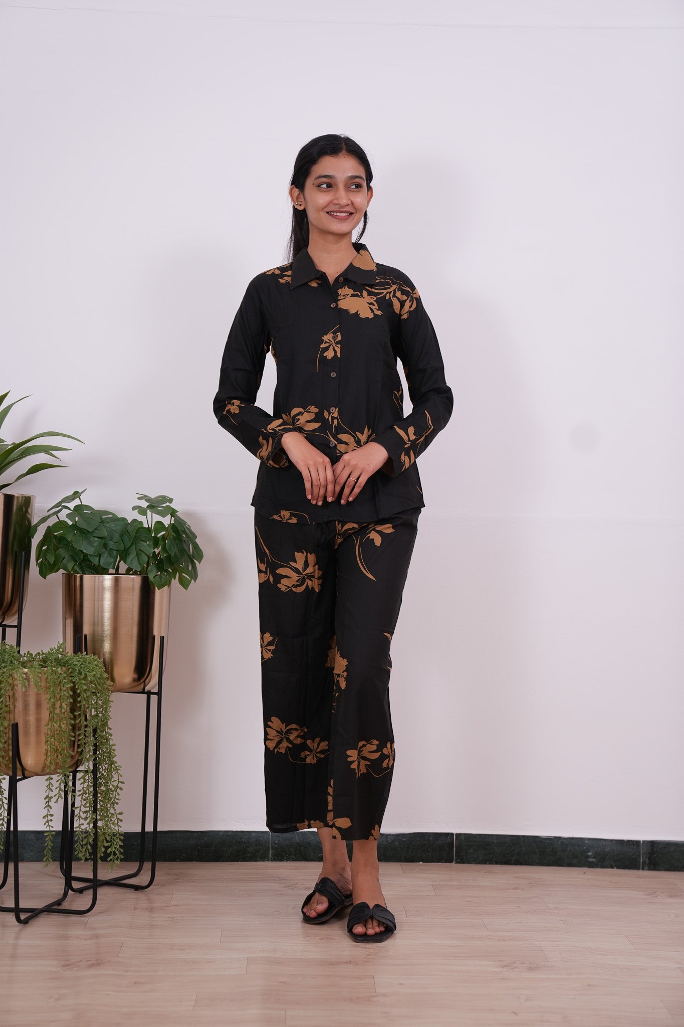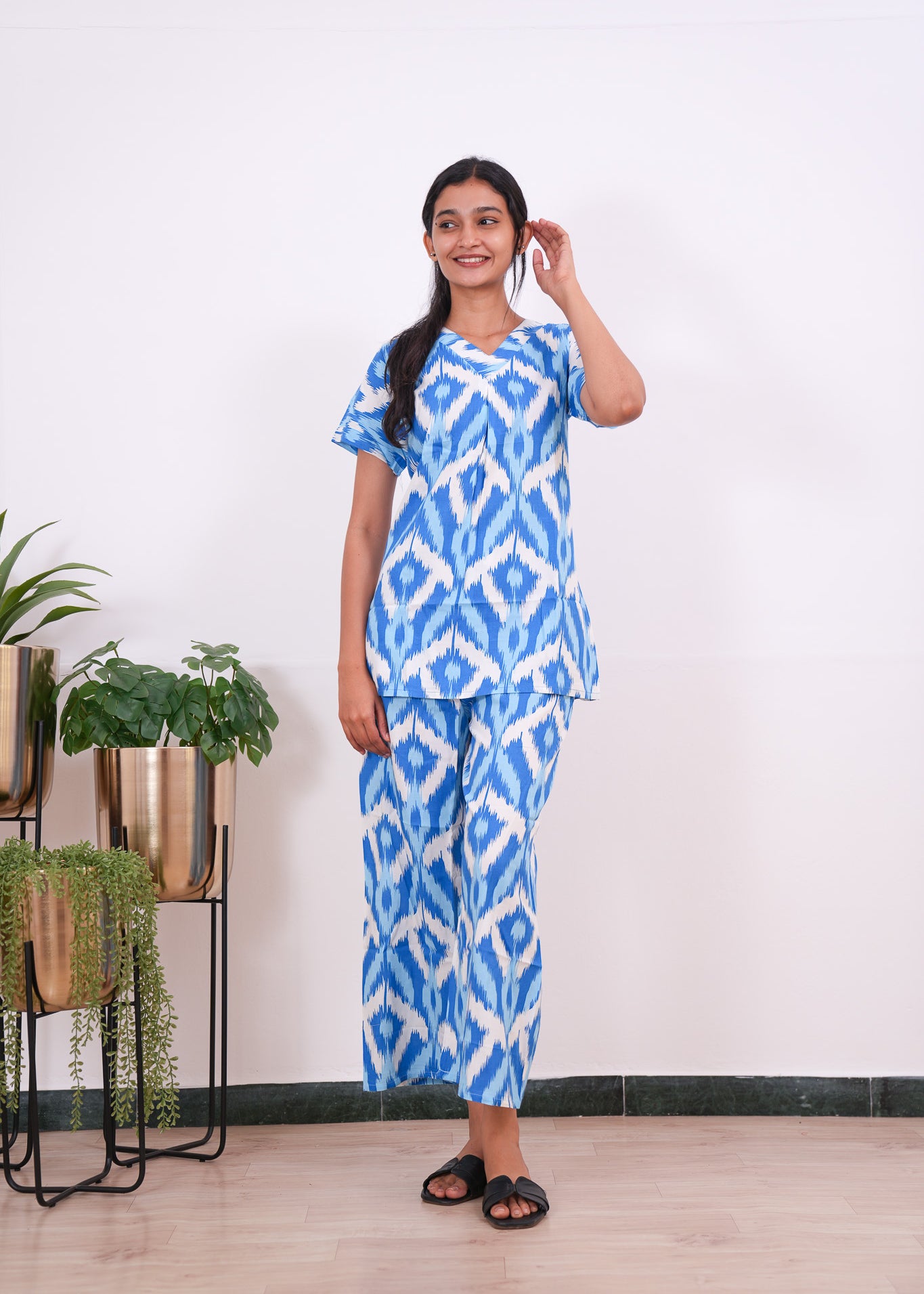 The night suit has a standard collar with openable buttons running down. It comes with matching elastic waisted pants