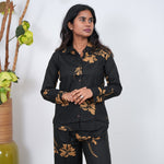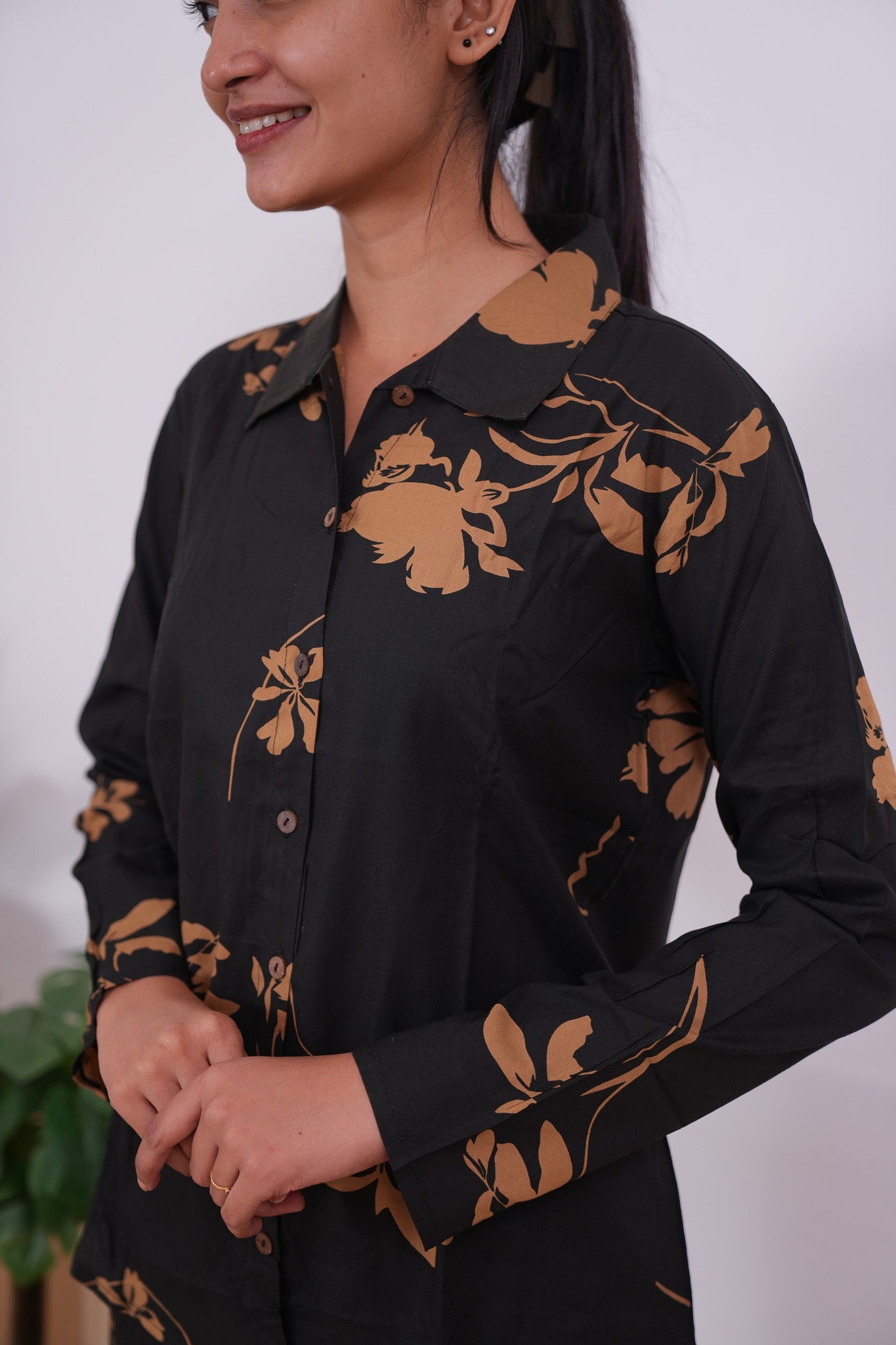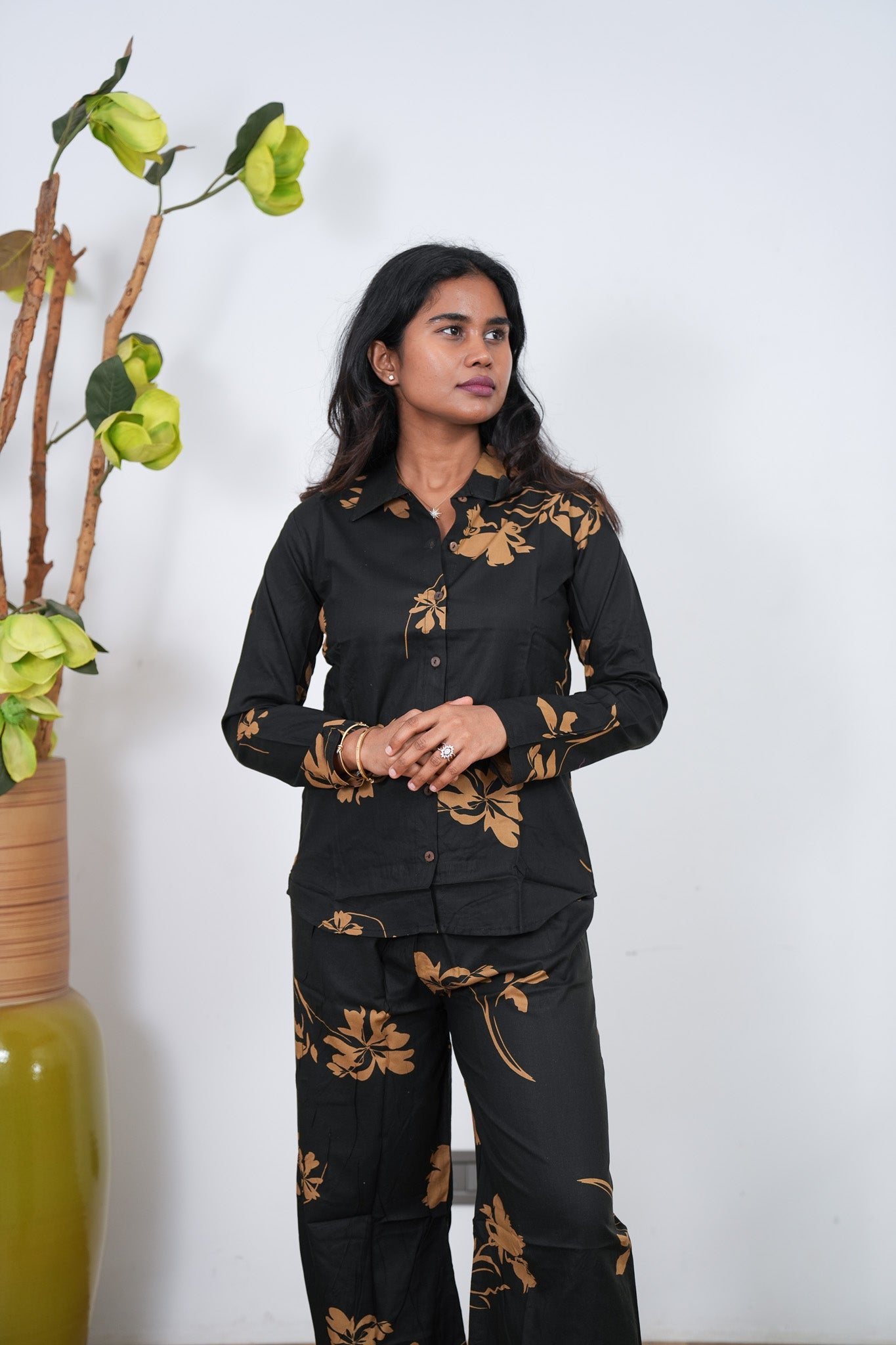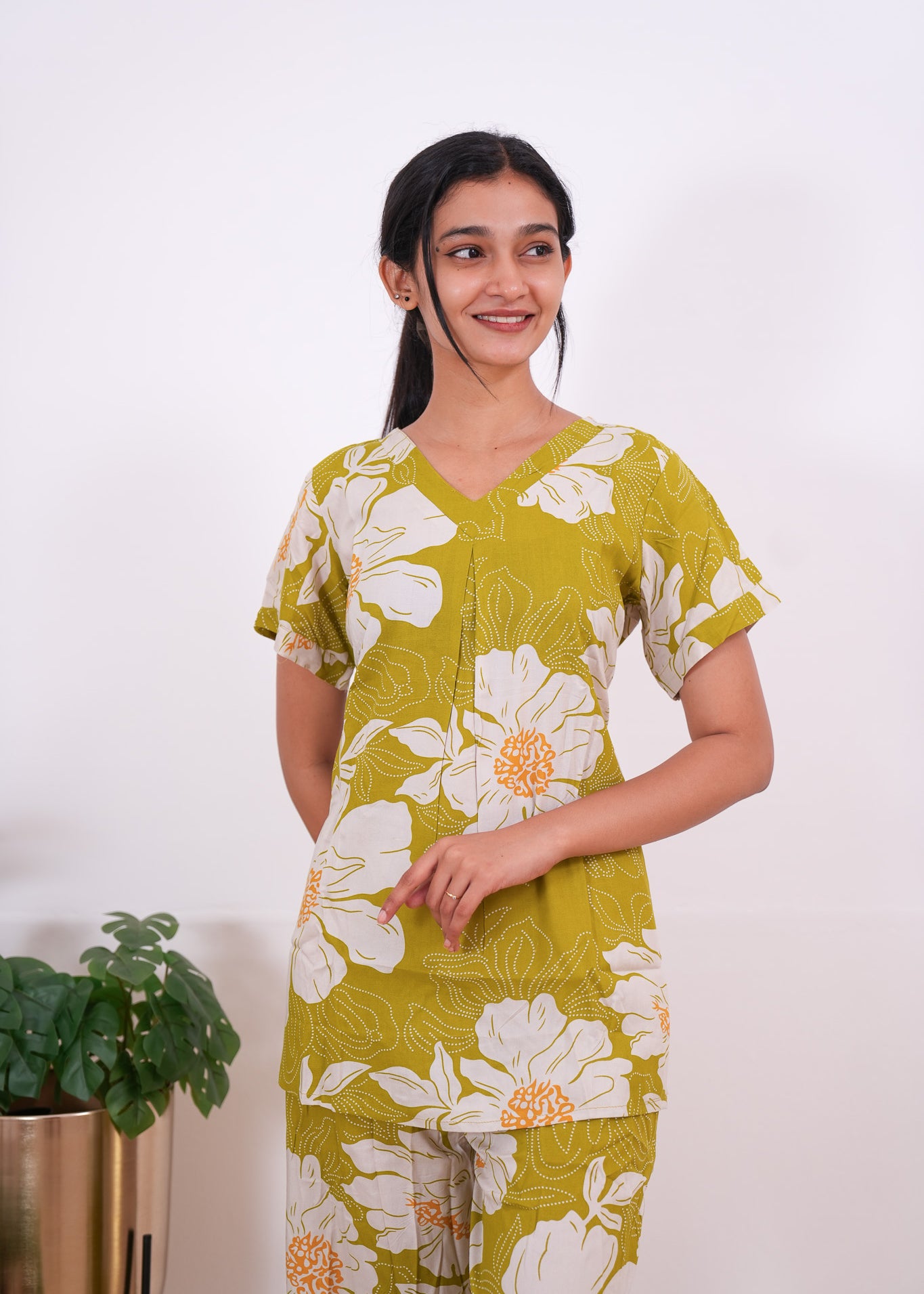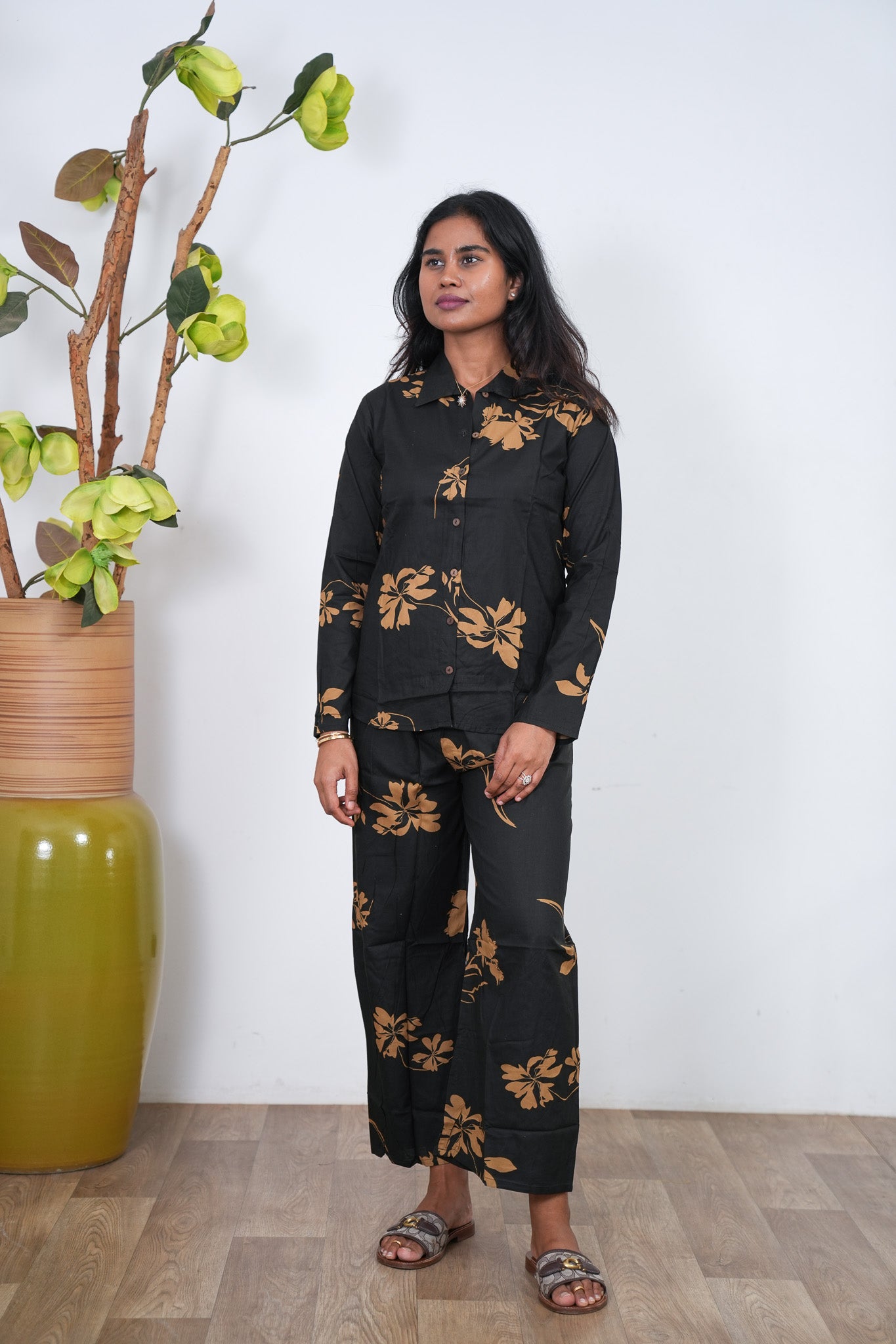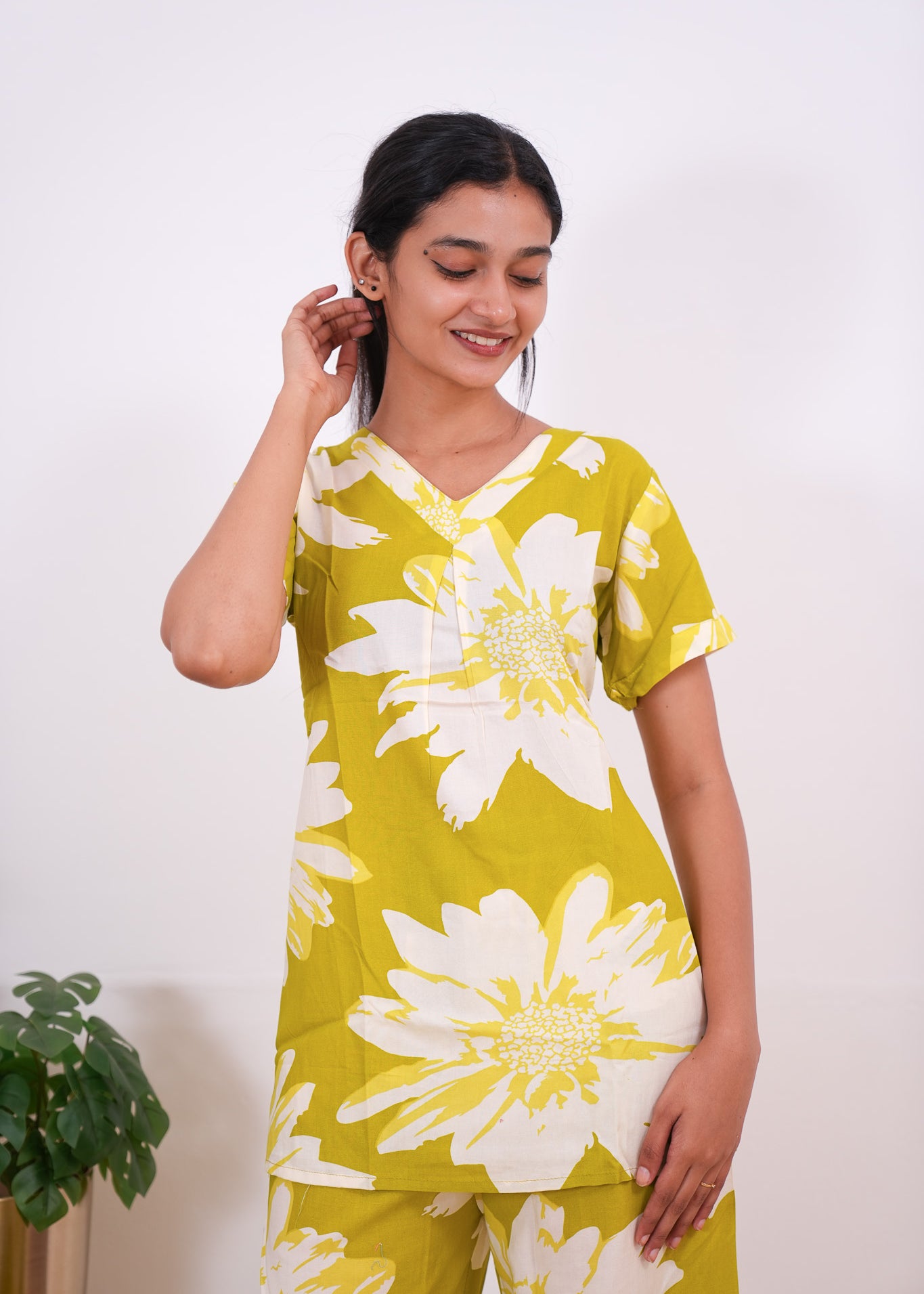 The night suit has a standard collar with openable buttons running down. It comes with matching elastic waisted pants