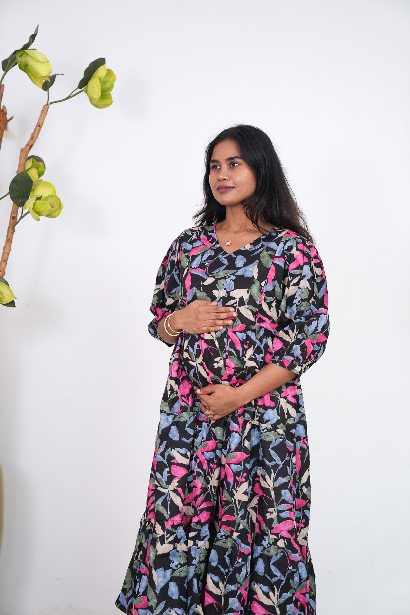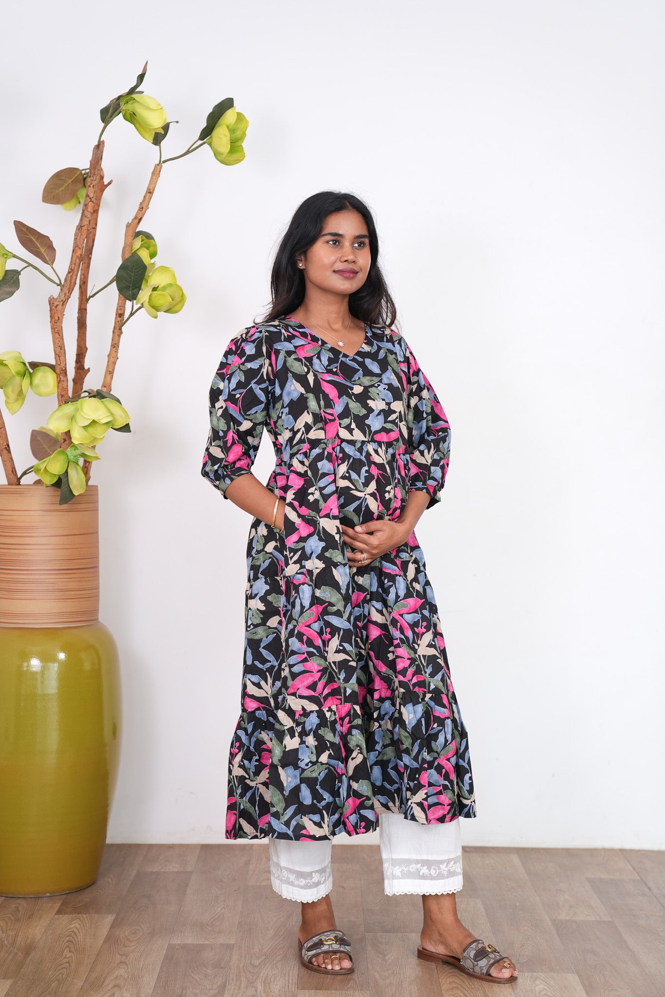 Onyx fern maternity nursing wear with V neck and 3/4 sleeves that accomodates the bump throughout nine months and has invisible zip on both sides to carefully feed baby. It is light weight and soft to help you get through pregnancy and breastfeeding journey with ease.