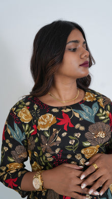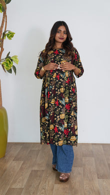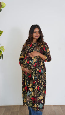 Black floral maternity nursing wear with round neck and 3/4 sleeves that accomodates the bump throughout nine months and has invisible zip on both sides to carefully feed baby. It is light weight and soft to help you get through pregnancy and breastfeeding journey with ease.