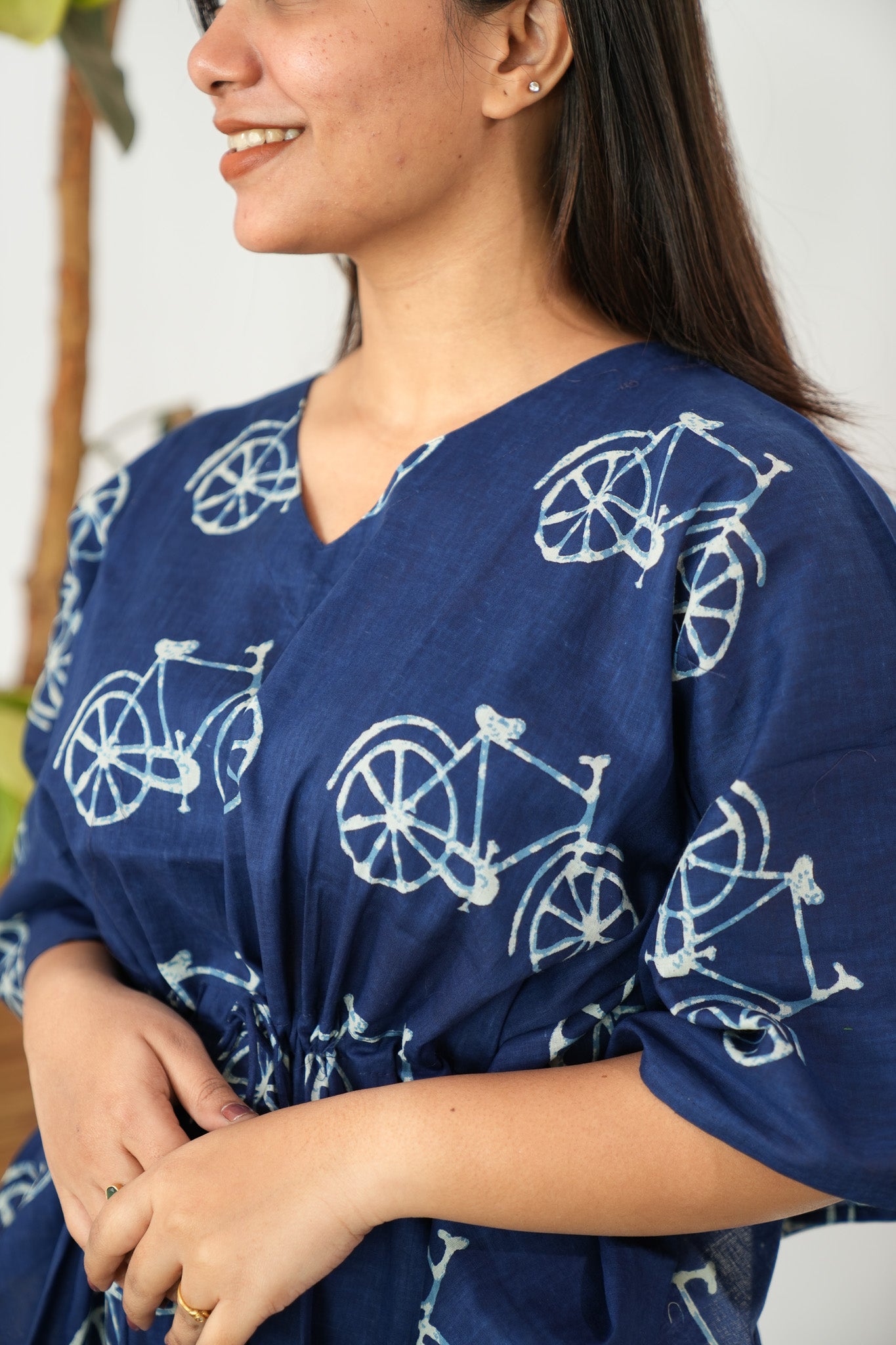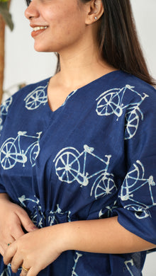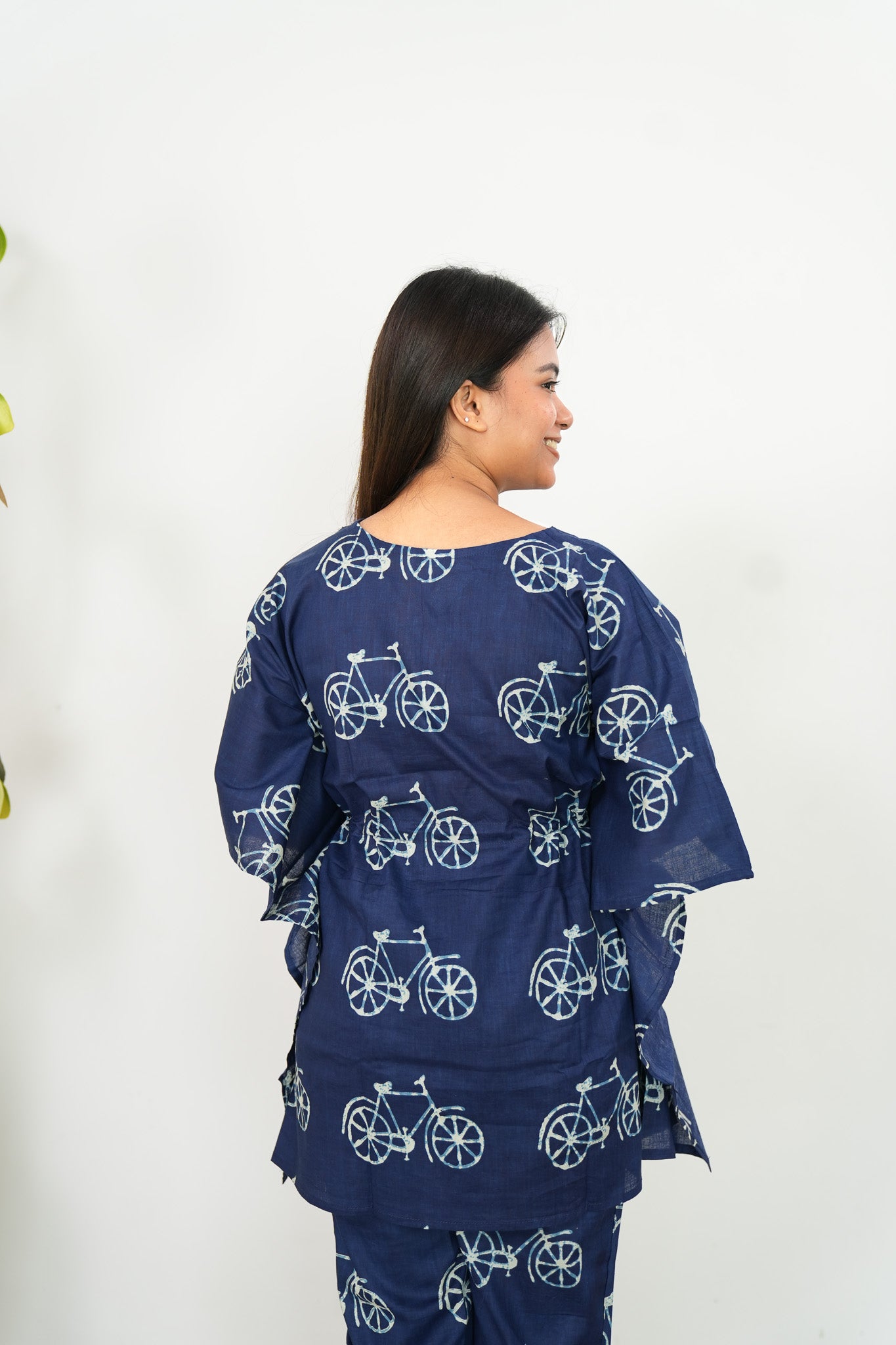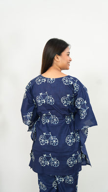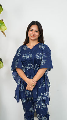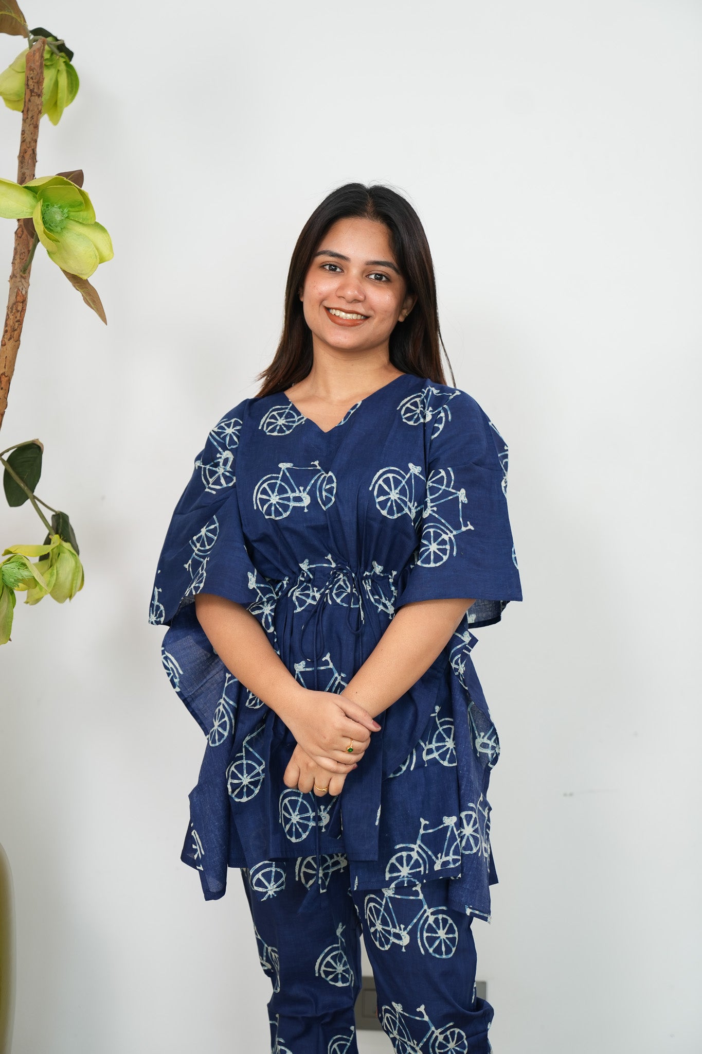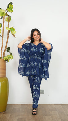 The kaftan top has a centre tie which can be tied to cinch the waist. It is paired with matching straight pants . It comes with half elastic and with front tie in the pants.