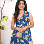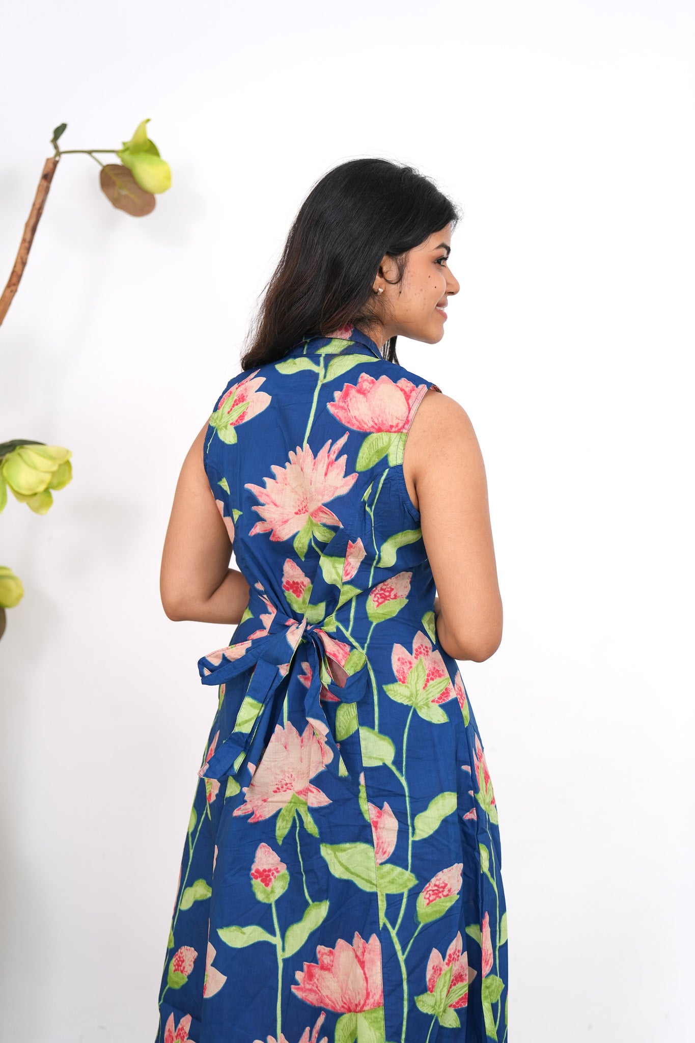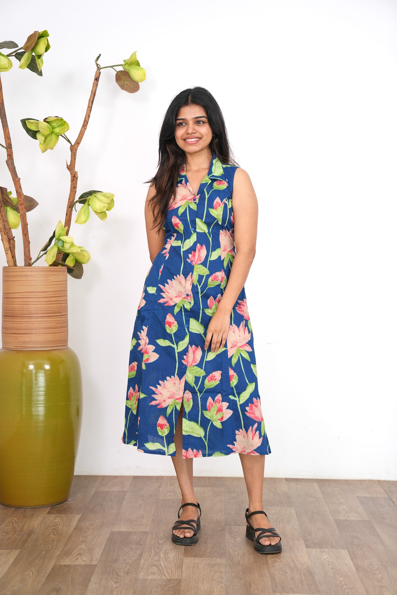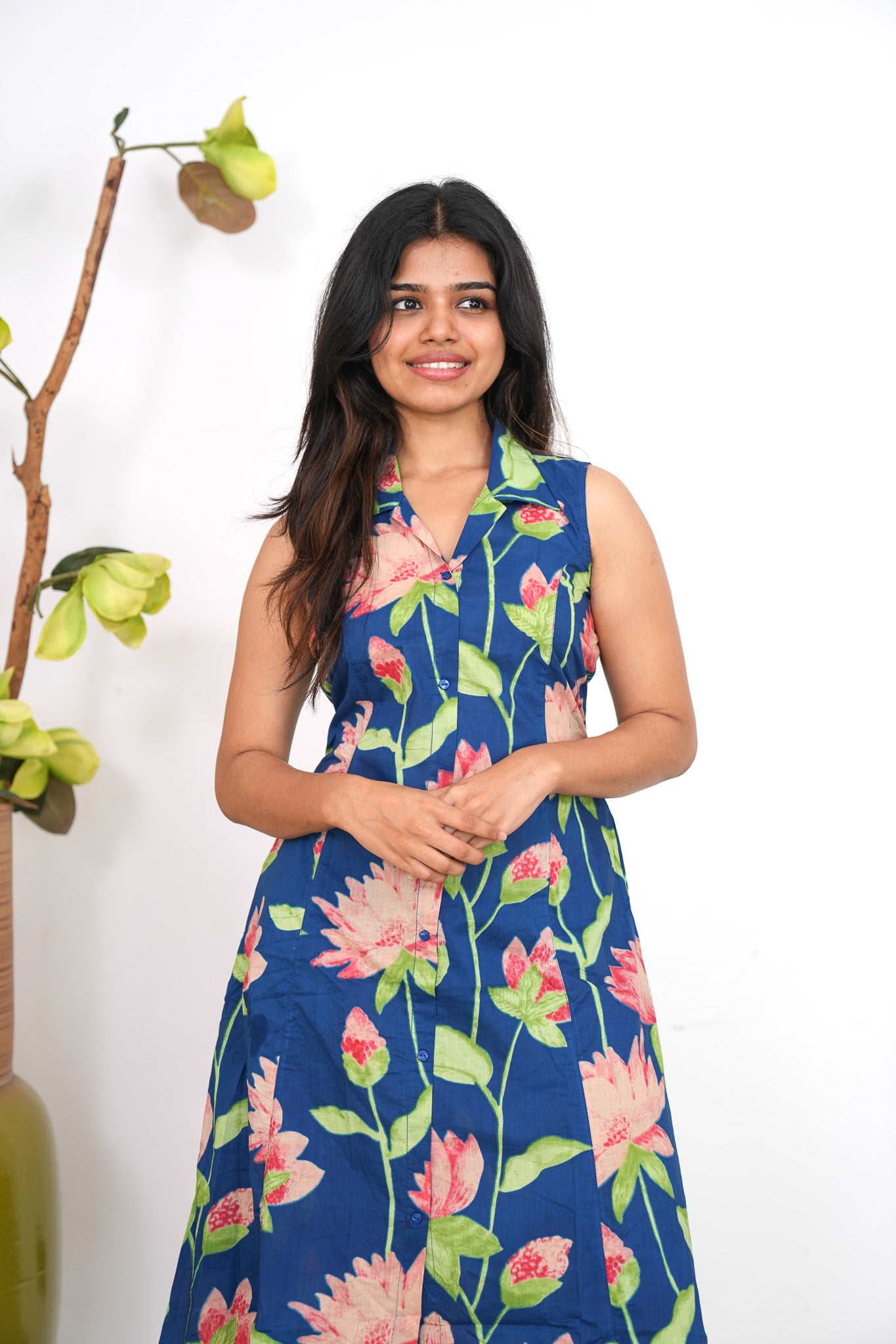 Royal blue lillies cotton shirt dress(attached sleeves)