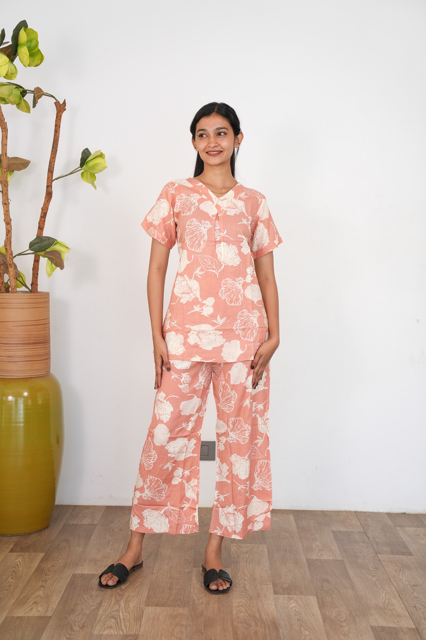 These Co-ords are so cozy, comfortable and chic making it perfect to relax at home or sleep in them. The top has a V neck with short length sleeves. Pant comes with elastic and it has a straight fit.