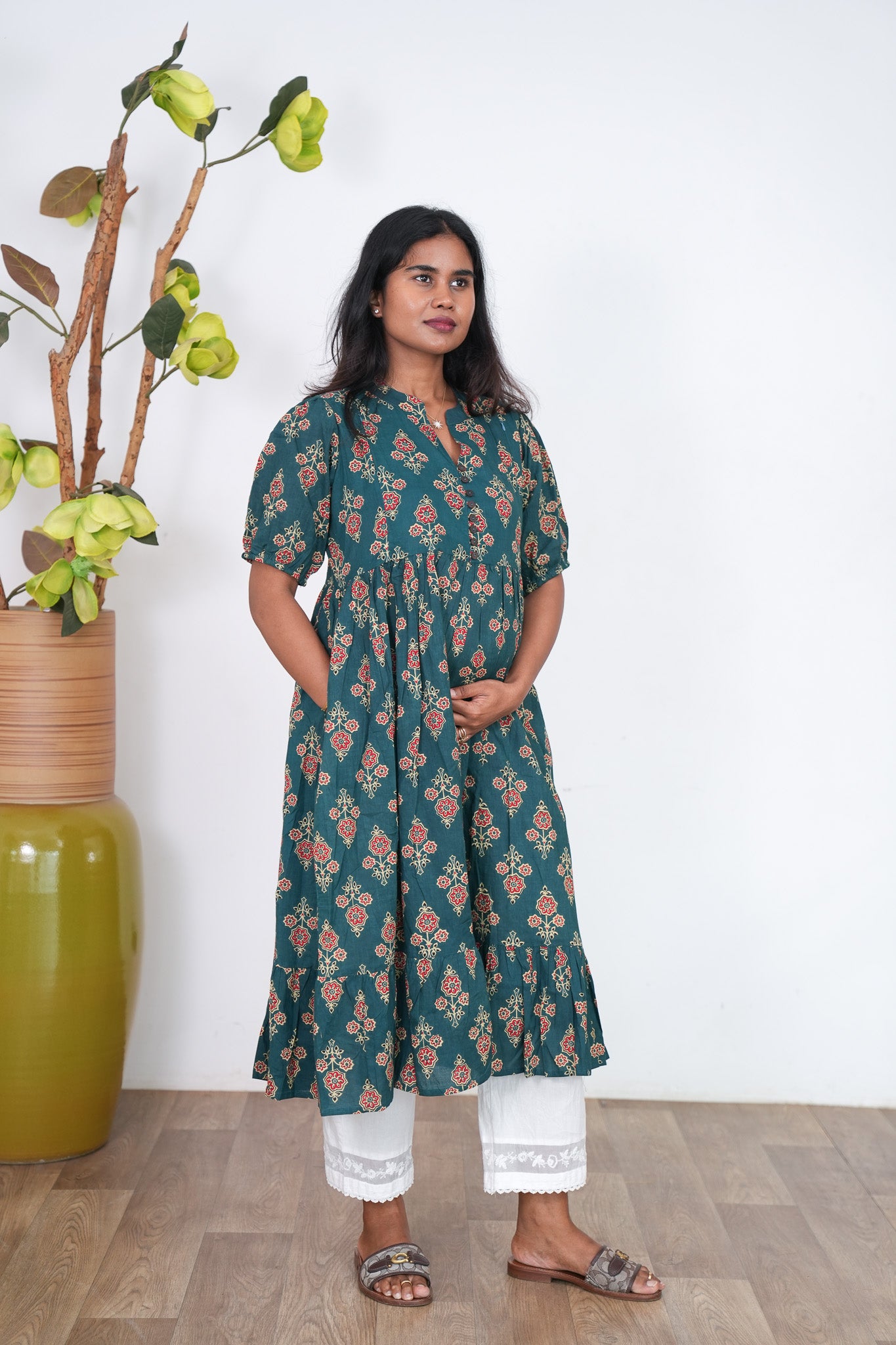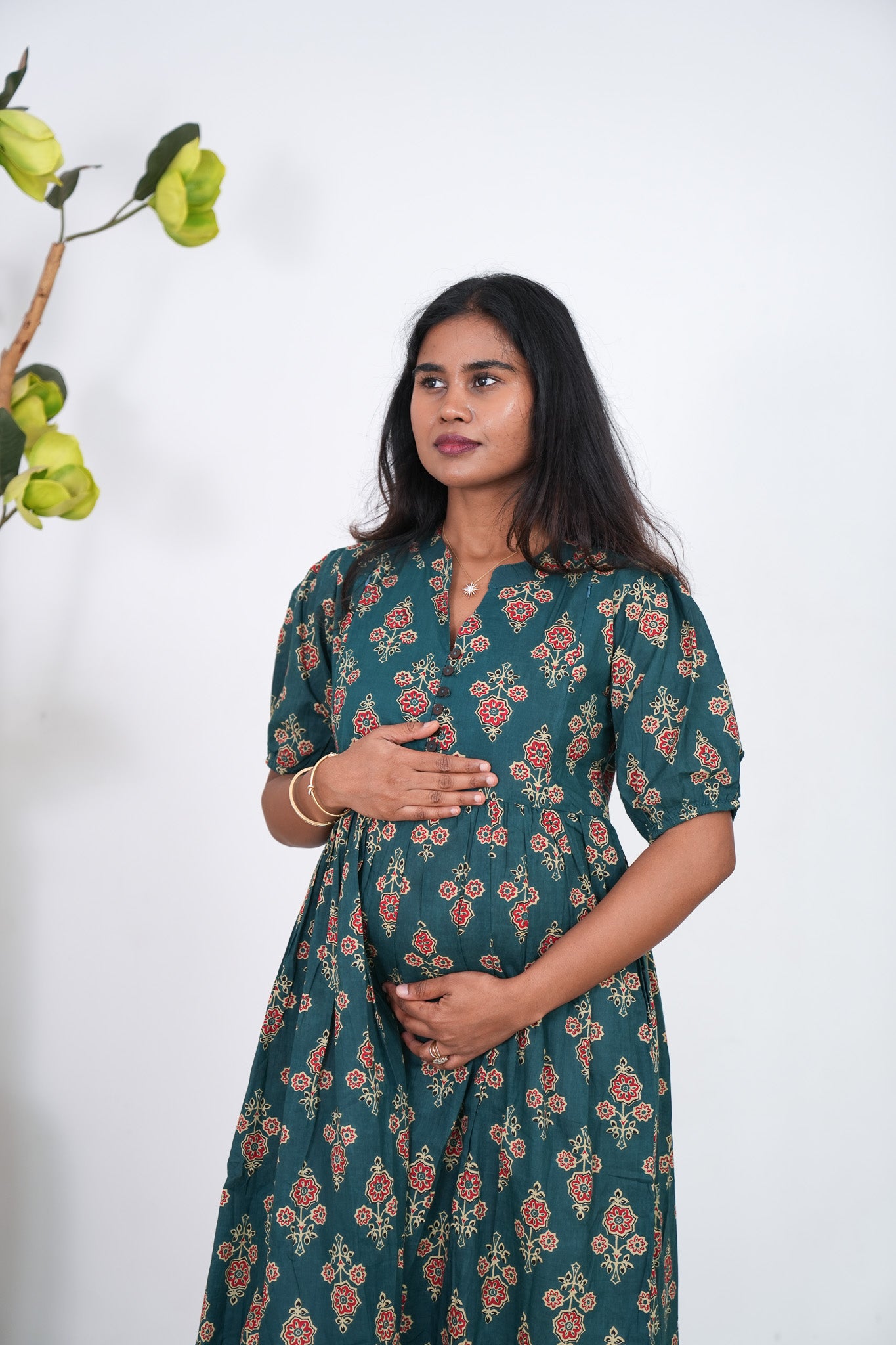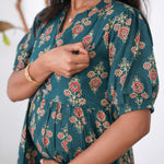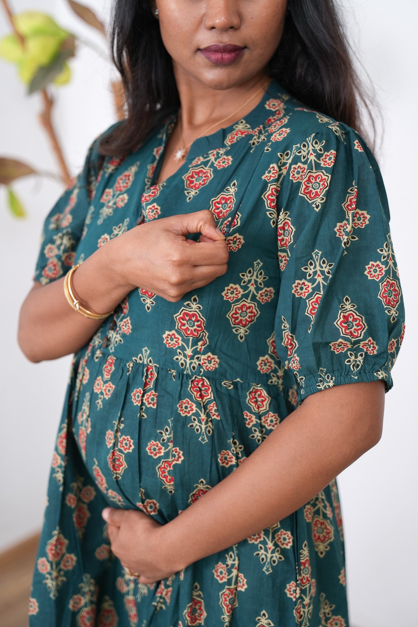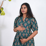 Peacock blue cotton maternity nursing midi dress with mandarin neck and balloon sleeves. that accomodates the bump throughout nine months and has invisible zip on both sides to carefully feed baby. It is light weight and soft to help you get through pregnancy and breastfeeding journey with ease.